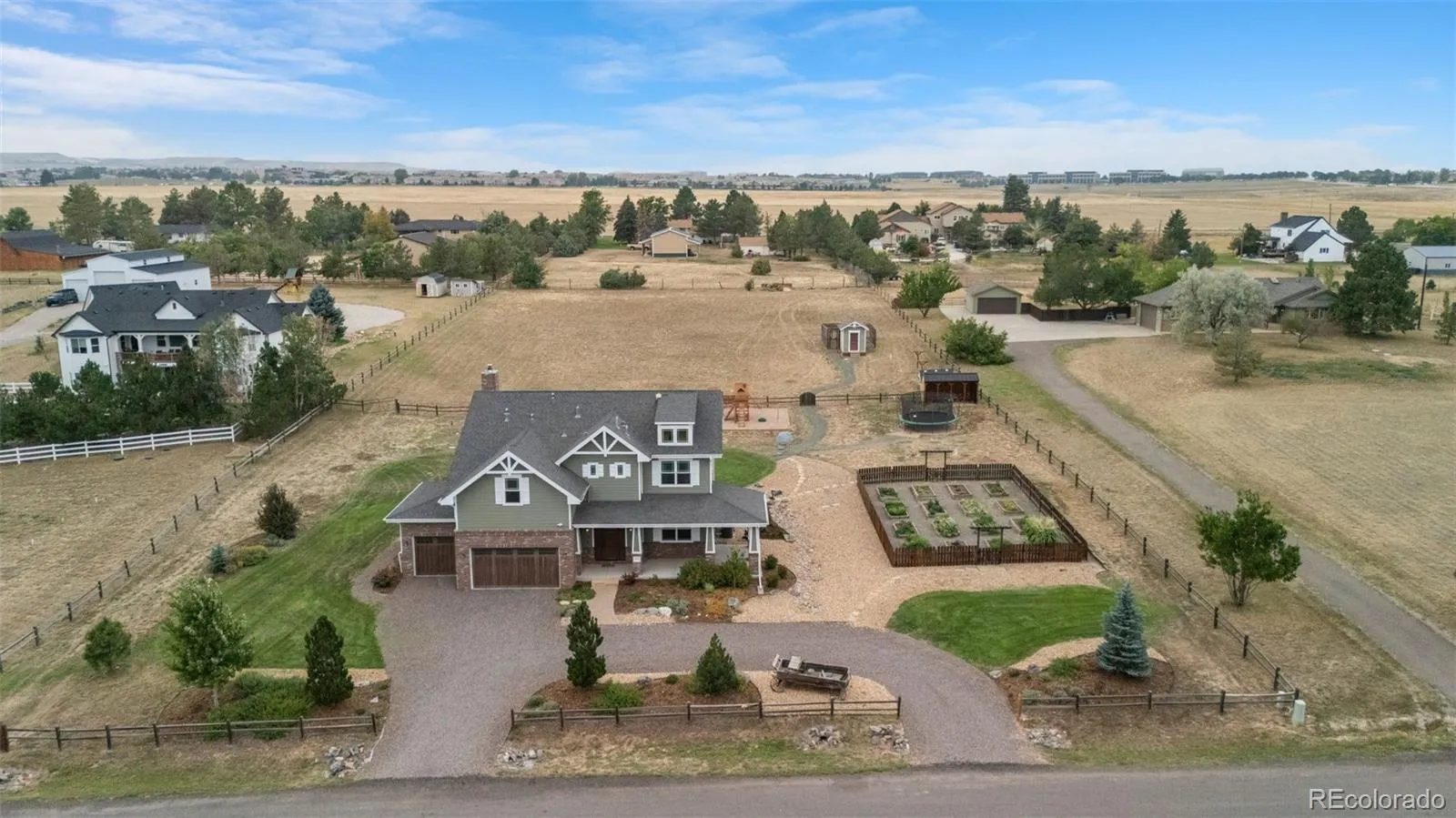 Truly extraordinary farmhouse-style two-story custom home on 2 acres in Parker featuring west-facing property on beautifully landscaped flat lot with native shrubs and flowers. Beyond alder wood front door, discover arched doorways and gleaming espresso-stained oak hardwood floors with walnut inlay, plus millwork that rivals high-end residences. Gourmet kitchen boasts coffered ceiling with top-quality white cabinetry, soapstone counters and marble island, luxury Thermador stainless appliances, 48″ six-burner commercial range, and built-in column refrigerator and freezer. Interior highlights include 10′ ceilings, plantation shutters, 8′ doors, family room with wood-burning fireplace, master retreat with coved ceiling and barn door, plus spa-like en-suite with clawfoot tub, glass shower, marble vanity and Kohler fixtures. Three secondary bedrooms upstairs with California Closets, plus two basement bedrooms with 2024 build-out featuring bar with wine cooler and Control4 automation movie theater with surround sound. Energy features include triple-pane windows, spray foam insulation, private well (no water costs), sixteen raised cedar garden beds, clothesline, firewood shed, and chicken coop. Outdoor living includes covered patio and fire pit area with room for outbuildings within fenced 2 acres plus three-car garage. Property offers reduced utilities, lower carbon footprint, and benefits for sustainable luxury living.