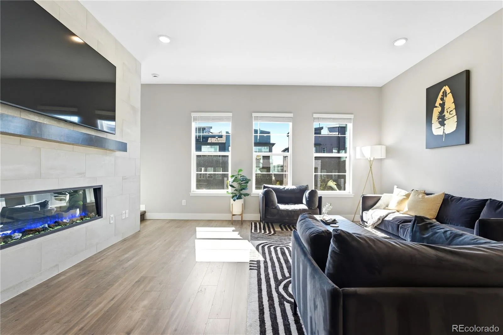 Natural light floods the open-concept main level, showcasing clean contemporary design, designer finishes, and a spacious, comfortable flow. The living room centers around a sleek modern fireplace, adding warmth and sophistication, while the adjoining dining area creates the perfect setting for hosting friends and family.
