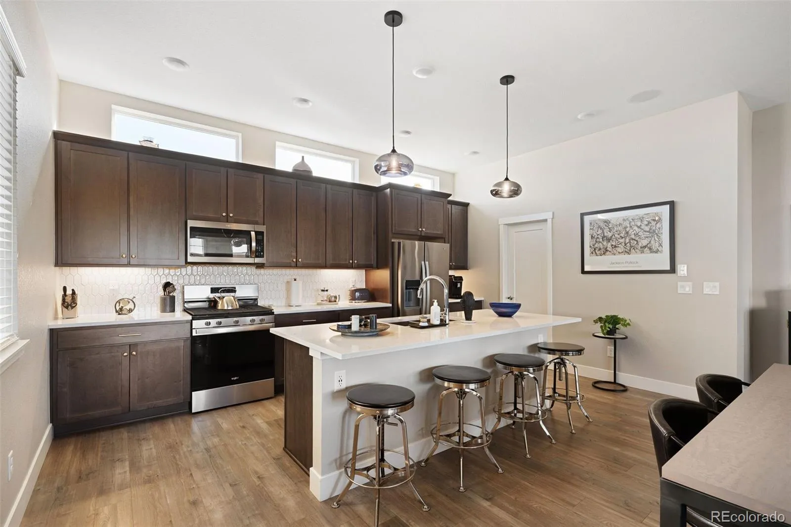 The main level is warm and inviting, with big windows that pour in natural light, a sleek kitchen with quartz counters and stainless steel appliances, and a living room perfect for hosting friends and family or winding down after a long day.