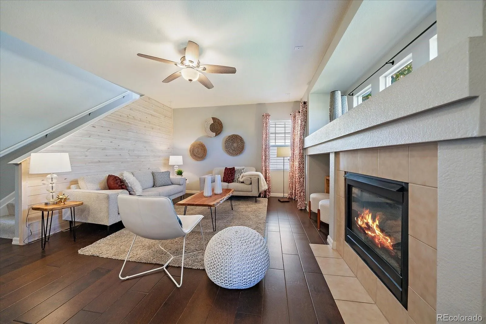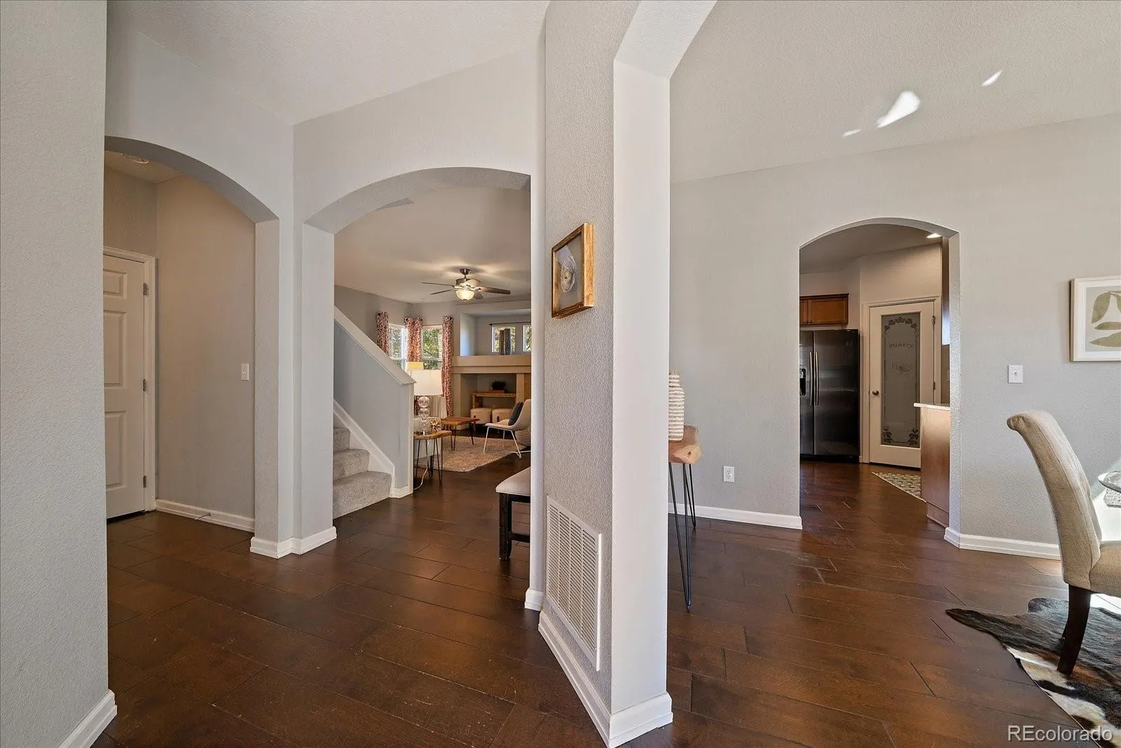 The main level features hardwood floors and a spacious dining area is perfect for gatherings, while the open-concept kitchen includes black stainless steel appliances, a pantry, and ample workspace. Relax in the inviting living room complete with a cozy gas fireplace.
