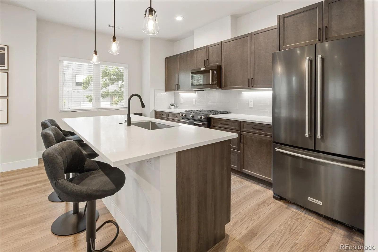 • Functional Kitchen: The efficient kitchen is designed for optimal workflow, featuring sleek quartz countertops, modern glass tile backsplash, high end KitchenAid stainless-steel appliances and woodgrain, soft-close cabinets for all your culinary needs. Plus, a large island perfect for meal prep and casual dining.