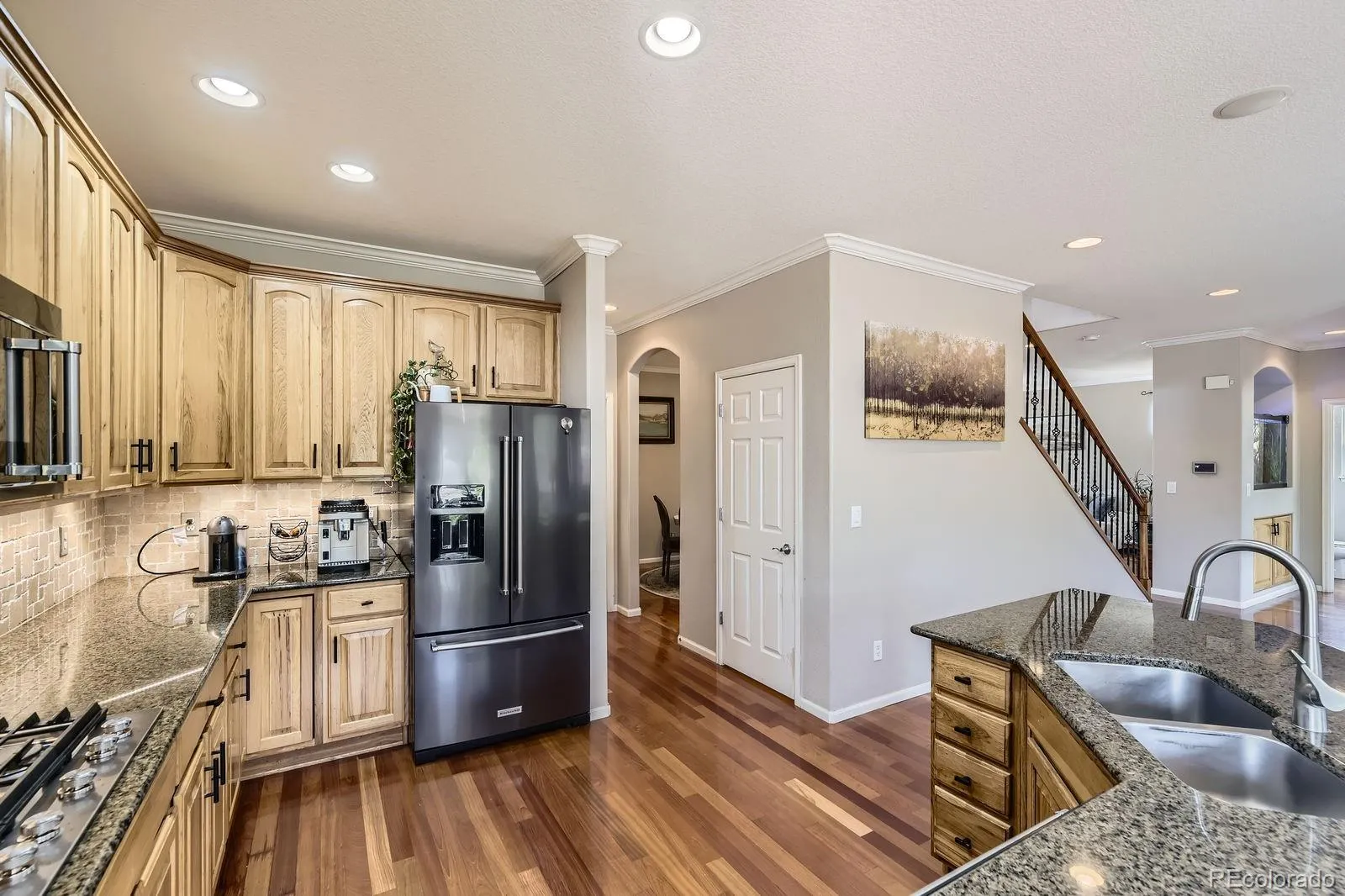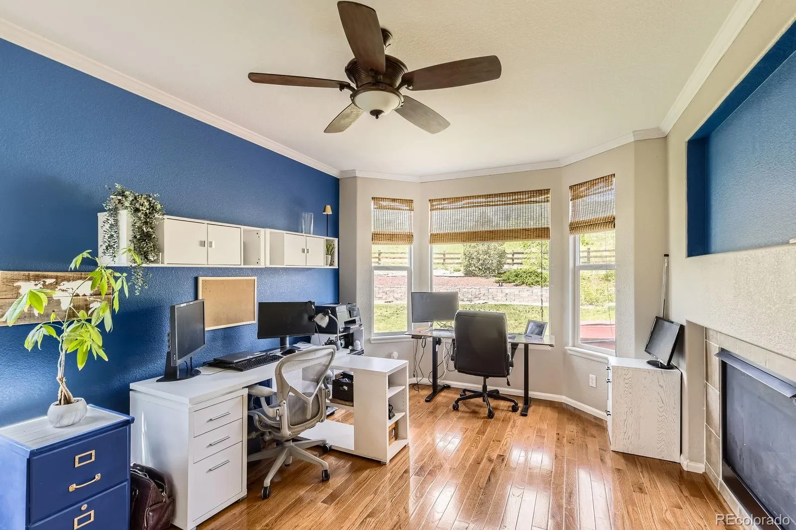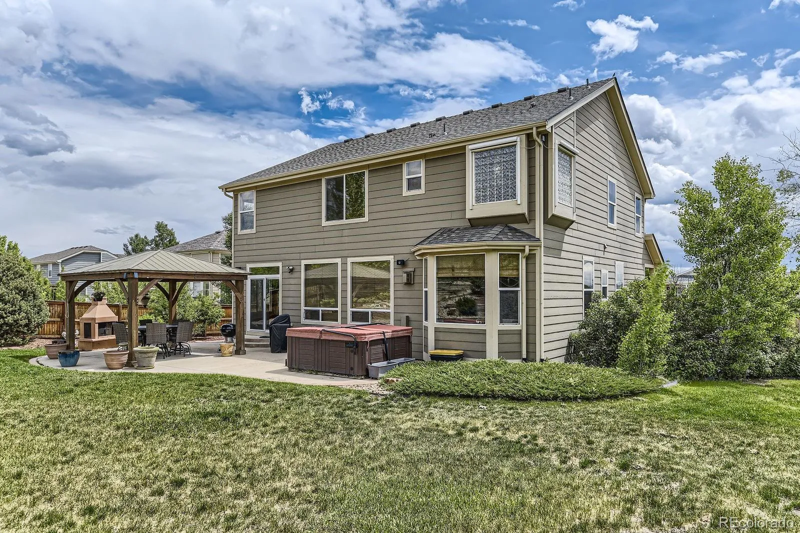 Parker Beauty on a Rare Half-Acre Lot Backing to Trails You’ve been dreaming of more space without giving up the convenience of community living, this is it. Perfectly tucked at the end of a quiet cul-de-sac, this Parker home offers privacy, room to roam, and direct access to open space and scenic trails. From the moment you arrive, the lot feels lush, private, and expansive.Inside, hardwood floors (2024) flow through much of the main and upper levels. A formal living and dining room provide the perfect backdrop for entertaining, while a private office with a bay window and two-way fireplace creates a warm work-from-home retreat. The kitchen features KitchenAid appliances including a double oven and convection microwave, granite counters, rich cabinetry, and a large center island opening to the family room—both filled with natural light and backyard views. A custom Closet Factory pantry provides organized storage. Upstairs, hardwoods continue, and two bedrooms have been combined into a junior suite with a kitchenette—perfect for multigenerational living. The primary suite is a retreat with its own fireplace, sitting area, spa-like bath, and oversized Closet Factory walk-in closet. The basement adds flexibility with a large rec room, storage, and ¾ bath—ideal for a guest suite or gym. The carpet is new (2024), and additional built-in storage was added by Closet Factory. Thís home is as functional as it is beautiful. Major updates include a new roof (2023), double-pane Pella windows (2024), and a top-of-the-line American Standard Platinum HVAC with humidifier, UV virus-killing light, and magnetic filter (2021). Outdoors, enjoy a Kentucky Bluegrass lawn (2022) supported by a sprinkler system that waters and fertilizes simultaneously. The backyard is an entertainer’s dream with a water feature, hot tub, pergola, and outdoor fireplace. With a 3-car garage, thoughtful upgrades, and no neighbors behind(just scenic trails)this home is move-in ready and waiting for you