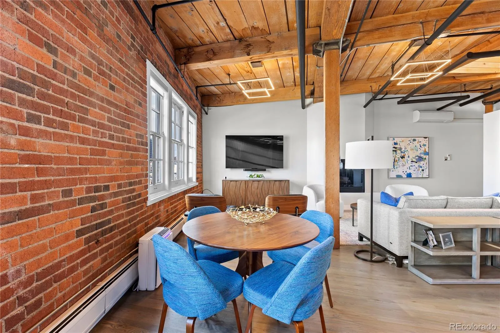 Discover refined loft living in this remodeled penthouse at the historic Acme Lofts in LoDo. Dramatic 18-foot ceilings, exposed brick, and original beams create a striking backdrop for an open and light-filled floor plan. Anchored by a gas fireplace, the living room flows into a chef’s kitchen with Caesarstone quartz counters, European soft-close cabinetry, and premium Thermador appliances.