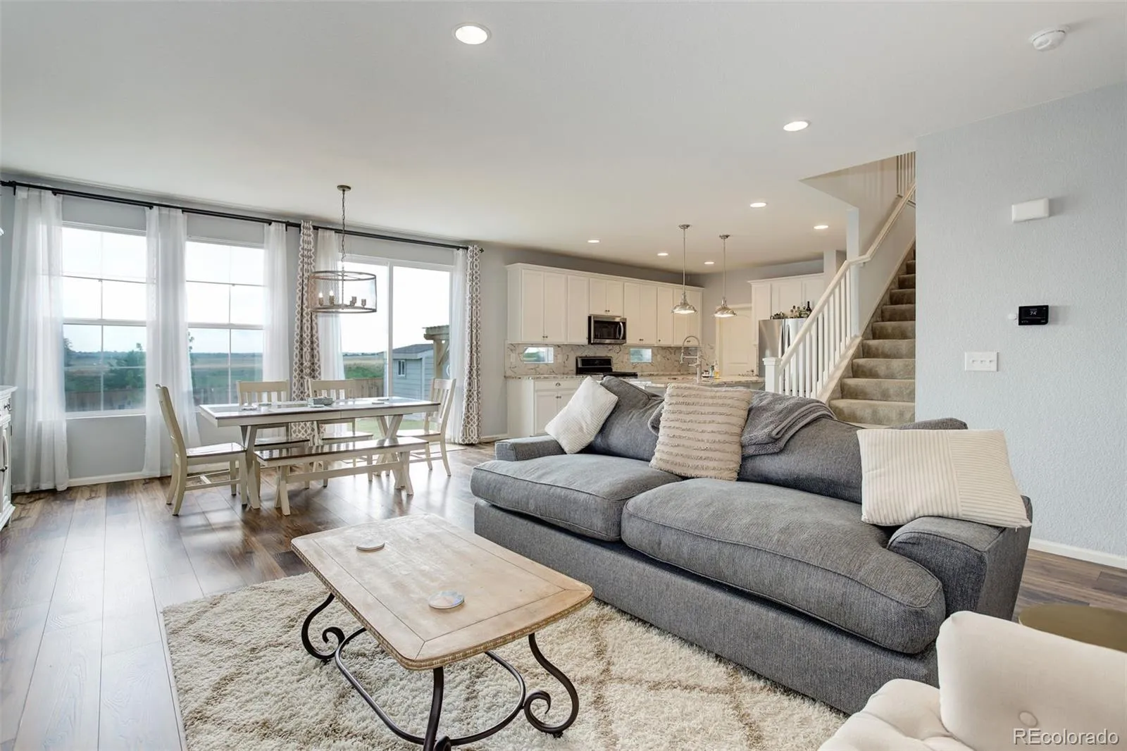 Reunion home with a gorgeous backyard with privacy. This home boasts 5 bedrooms, one being on the main floor and a full bathroom for convenience. The main floor is an open concept with spacious room in the living, dining and kitchen. You’re welcomed into the home with updated engineered luxury vinyl flooring that is carried throughout the main living areas of the home. Updated light fixtures throughout the home that elevate the look and feel of the home. In the kitchen there are upgraded granite countertops along with a newly installed backsplash! There is plenty of counter space and cabinet space for storage and a big walk-in pantry. The main floor finishes out with a mud room coming in from the garage with another coat closet. The upstairs has a beautiful loft with bookshelves making it a great place for an office, kids playroom or hangout area. The primary bedroom is located upstairs with an en-suite that has double sink vanity with updated quartz countertop, a tiled shower with a bench, linen closet and a custom wardrobe organizer in the walk-in closet. There are two more bedrooms upstairs, a full bathroom with updated flooring and quartz countertop and the laundry room with included washer and dryer. The finished basement has a giant great room that has room for a gym and family room. Additionally there is a full bathroom and large bedroom with an over-sized closet. A dedicated storage room downstairs is perfect for all your extras. The backyard Oasis has a full length concrete patio and pergola to sit out on and enjoy your beautiful, peaceful yard. The shed provides extra storage as well!