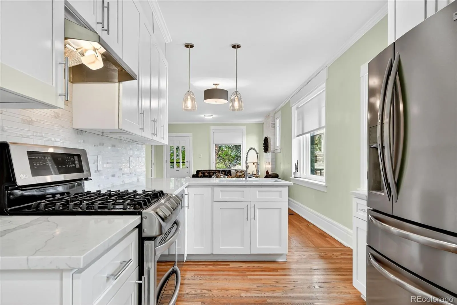 As you enter, you’ll be captivated by the open floor plan enhanced by custom lighting, large windows that flood the space with natural light and gorgeous wood floors. The light filled living room and dining room are open to the Chef’s eat-in Kitchen and is ready to entertain! Featuring white cabinets, quartz countertops, and stainless LG Appliances and gas cooktop oven. The Primary Suite is oversized and features custom closets and built-ins. The main level bath is gorgeous with playful custom tile, frameless shower and penny tile. The Secondary Bedroom is large and has custom closet slider. The front bedroom with french doors is a perfect place to work or relax!