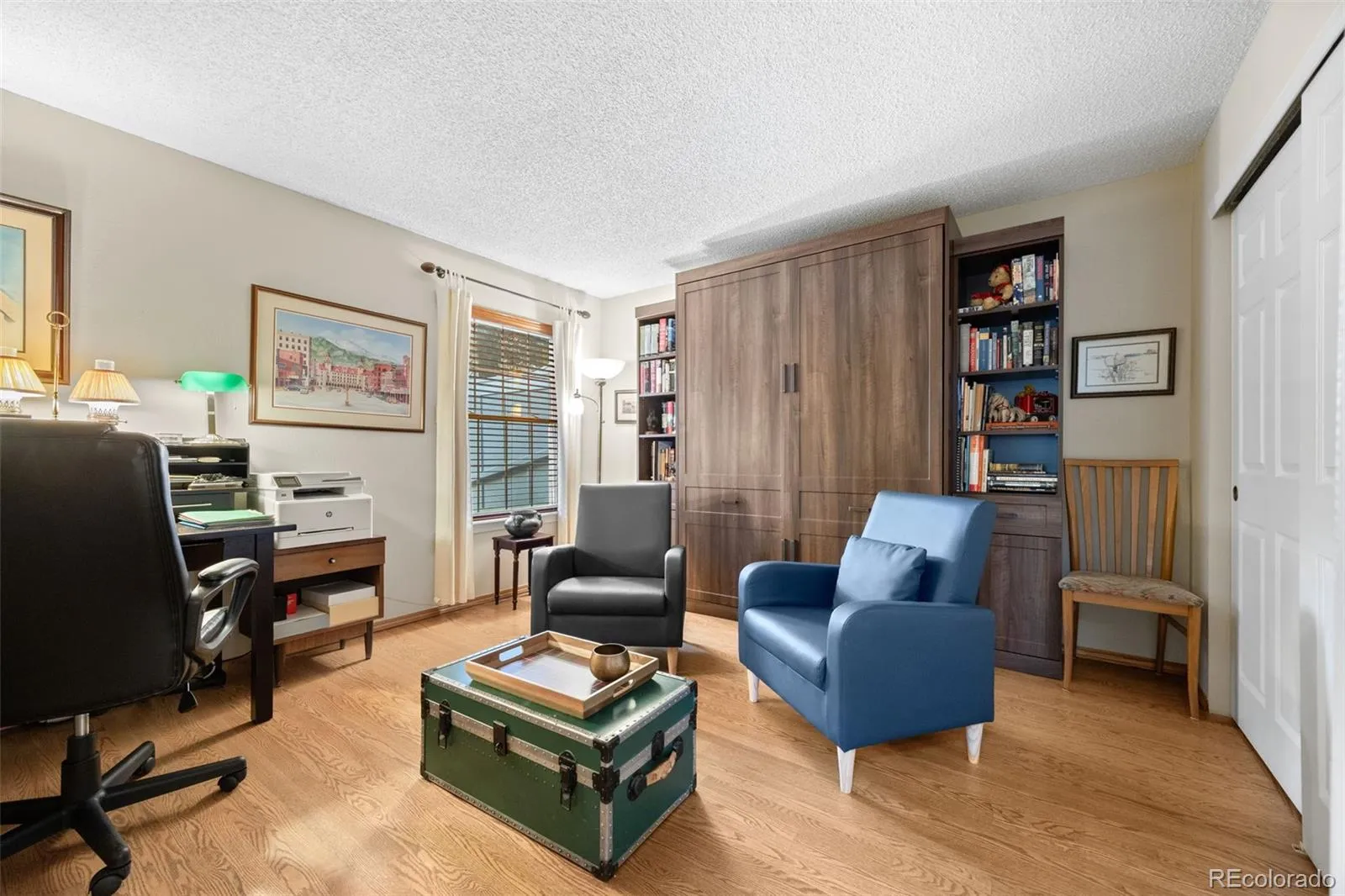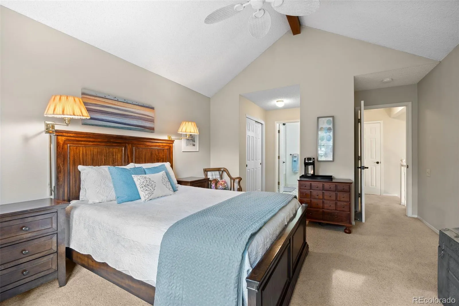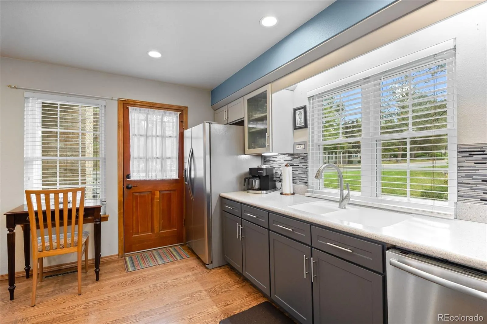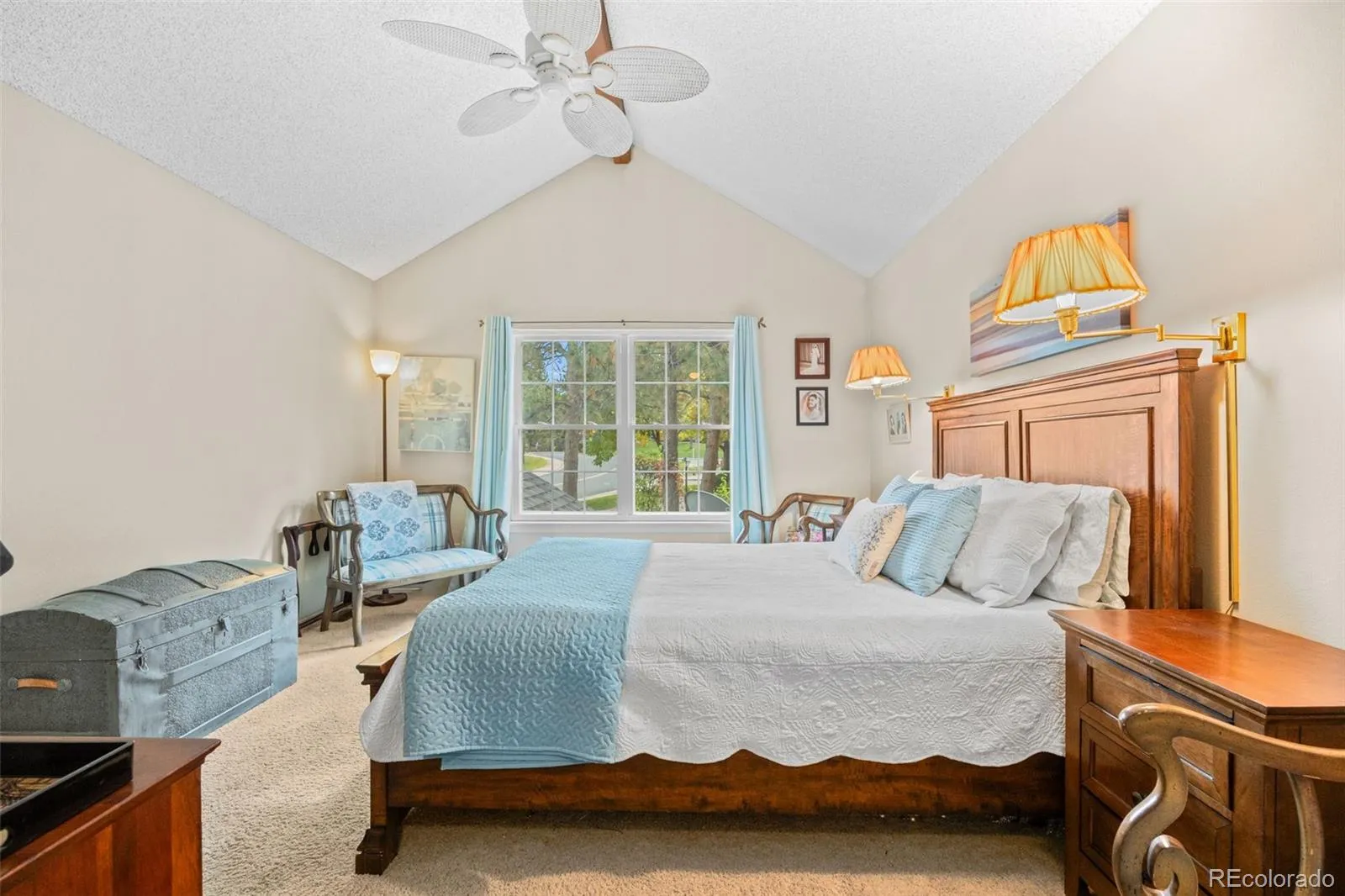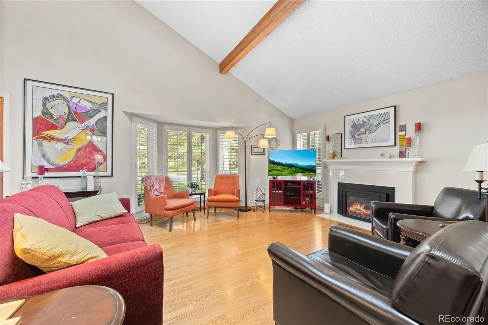 Don’t miss this opportunity in Littleton’s South Park, one of the nicest homes in the community! This beautifully refreshed end unit has wonderful appeal–it’s vaulted, open & inviting with hardwoods throughout the main level, skylights bringing in natural light, first class updates, and a rare main floor Primary suite! Step inside to find a vaulted living room featuring wood beams, 2 skylights, a gas fireplace and sunny nook to read by the bay window. Adjacent is the dining area. The updated kitchen is fitted with solid surface counters, double stainless steel sink, Viking 5-burner gas range, Viking D3 microwave, SS Bosch dishwasher & Frigidaire refrigerator. From here step out to the private patio to enjoy a bit of fresh air, drink in hand. Sellers have made multiple improvements including a new roof 2024, double pane vinyl windows throughout, quality light fixtures, high end appliances. The main floor offers two bedrooms, one the desirable Primary suite featuring a beautifully renovated 3/4 bath with dual vanity, skylight, tiled shower/floor; the second main flr bedroom is currently used as an office & is fitted with a Murphy bed (available for purchase). Down the hall is a renovated 3/4 bath with granite/tile. Upstairs you have a vaulted bedroom suite with classy full bath, double closets & skylight. Very nice! The basement offers a family/entertainment room with built-in bookshelves & cabinet, nook for a game table. There is plenty of storage available in the basement. You’ll love this neighborhood! A great location close to everything–downtown Littleton & the Light Rail, the Highline Canal, Santa Fe/C-470, Aspen Grove, and a bevy of great restaurants at your fingertips. Enjoy the community pool, clubhouse, tennis & pickleball courts & summer concerts. The HOA cares for grounds maintenance, exterior maintenance (without roof), snow removal, water, sewer, trash/recycling, all with low fees. This means you can spend your days doing what you enjoy most!