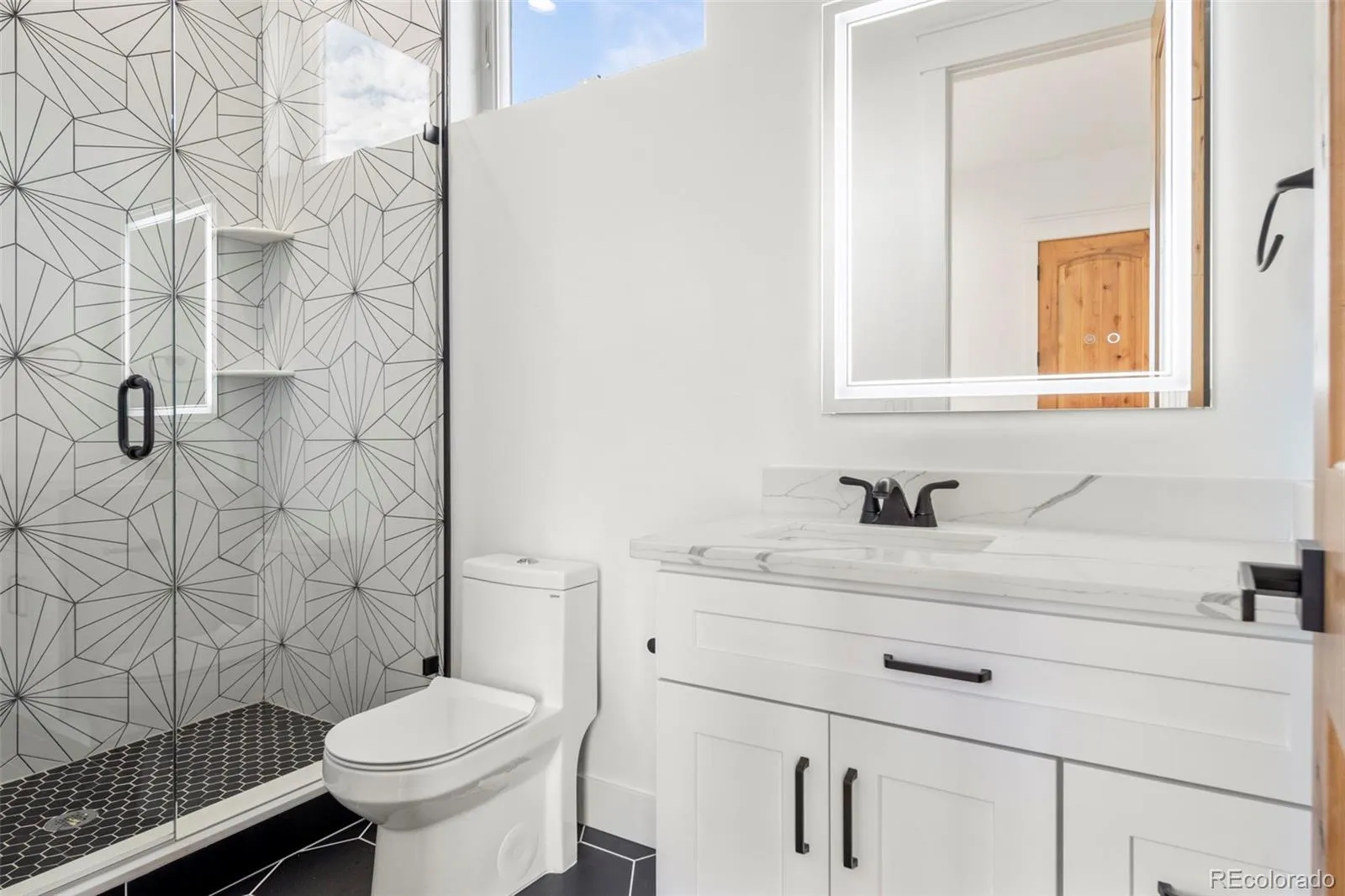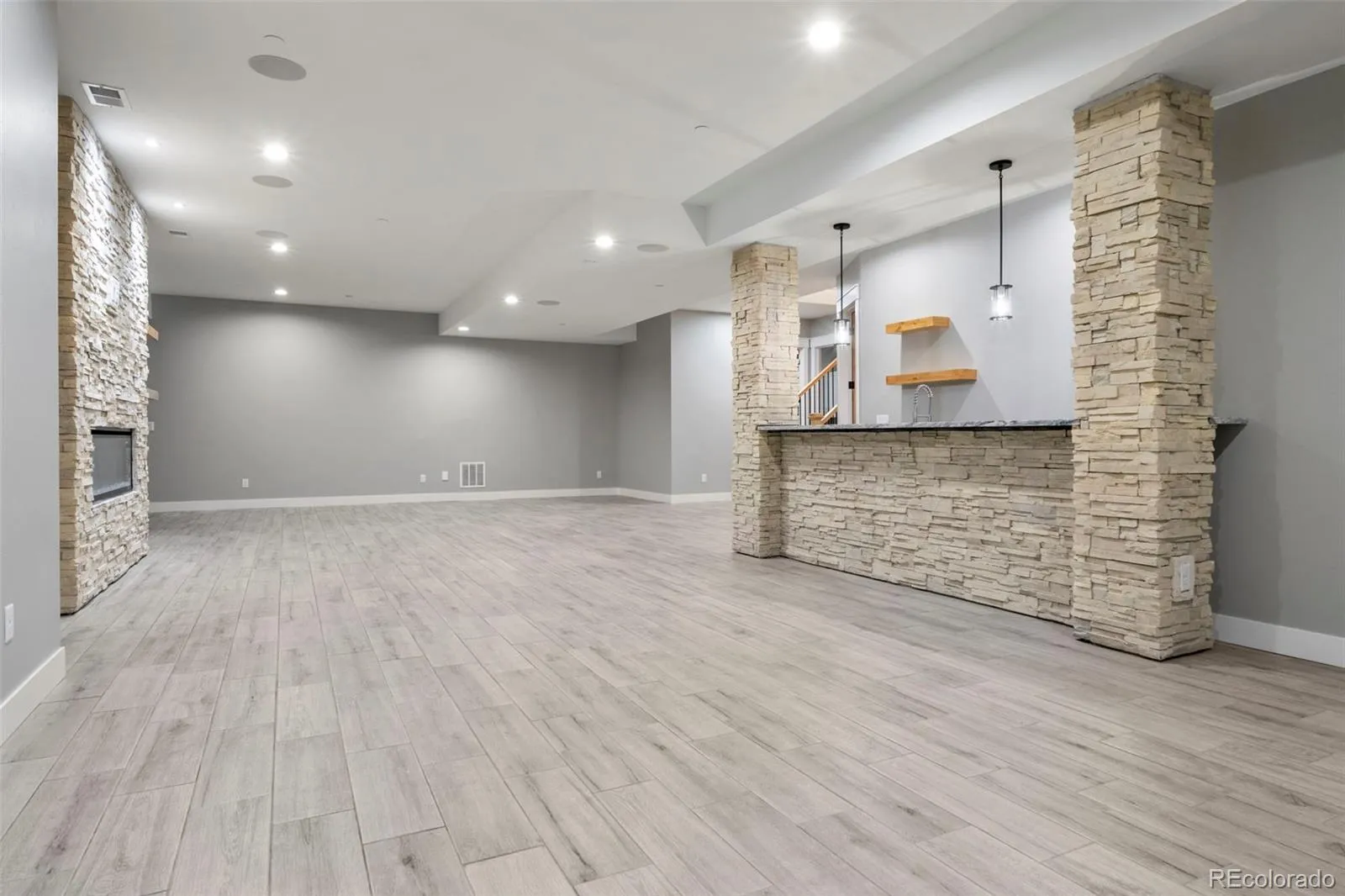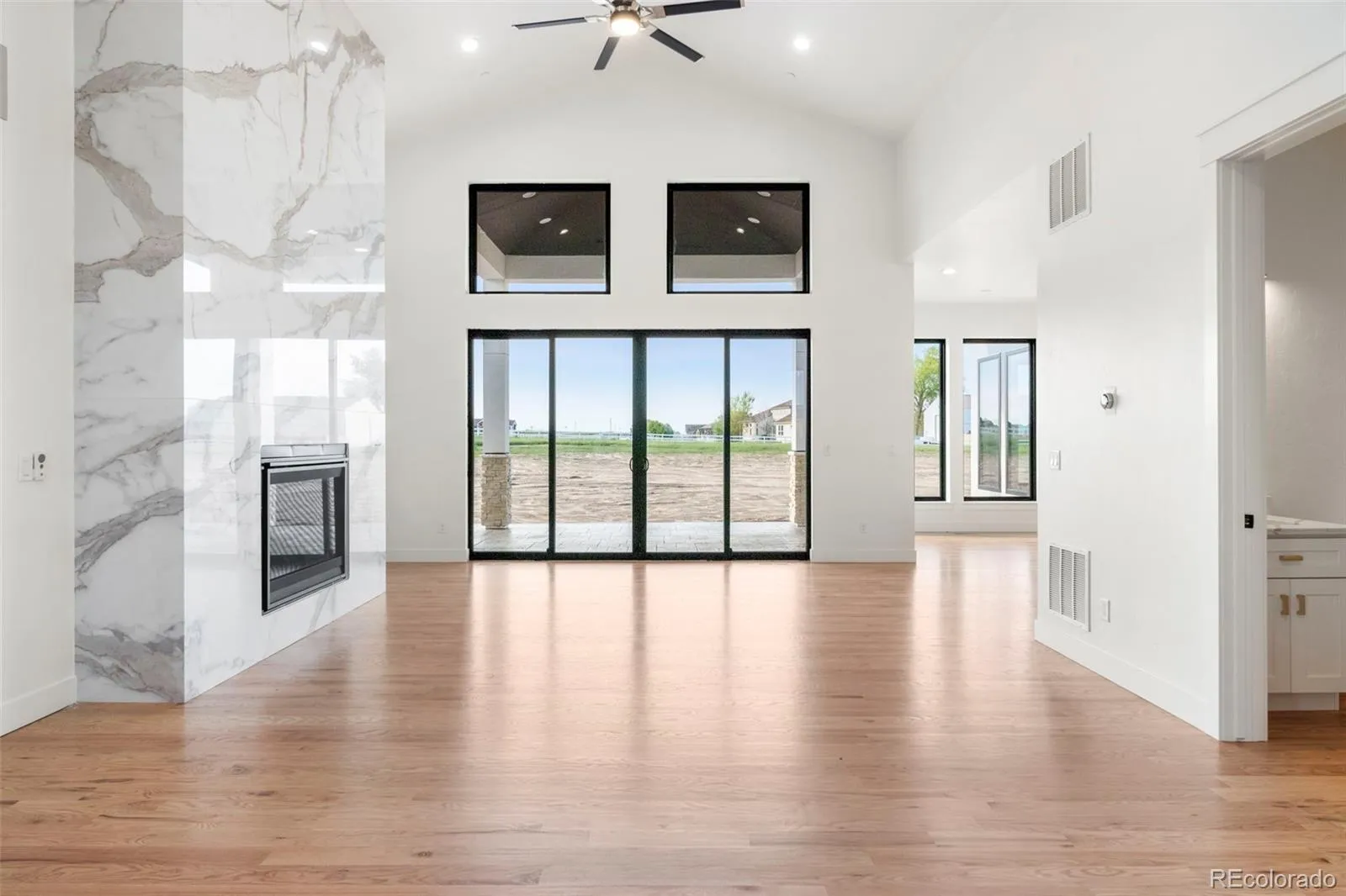Step inside to a grand great room with vaulted ceilings, a floor-to-ceiling marble-style fireplace, and expansive sliding glass doors opening to a covered patio—perfect for entertaining or relaxing while enjoying mountain views. The chef’s kitchen impresses with waterfall-edge quartz counters, soft-close cabinetry, stainless-steel appliances, and a spacious island designed for gatherings. Natural light pours through large windows, highlighting the beautiful hardwood floors and clean architectural lines throughout the home.