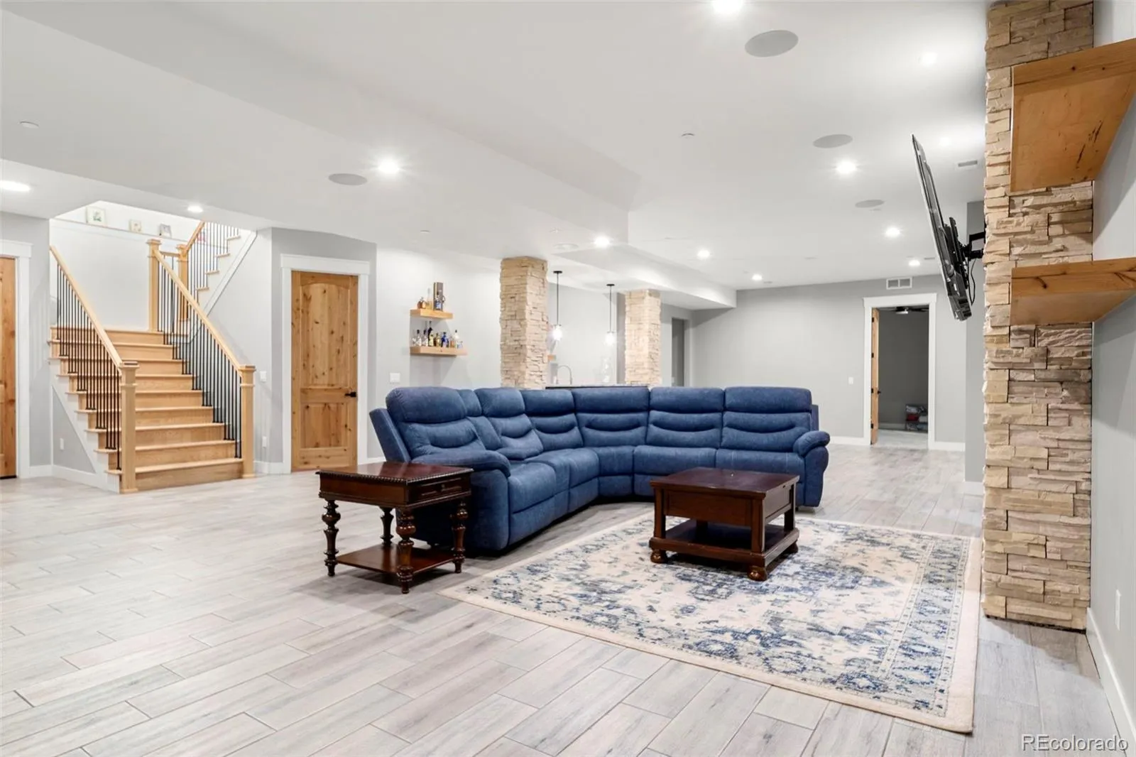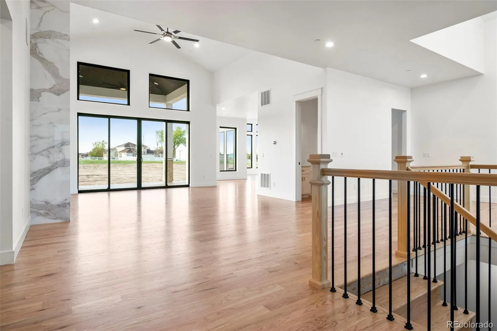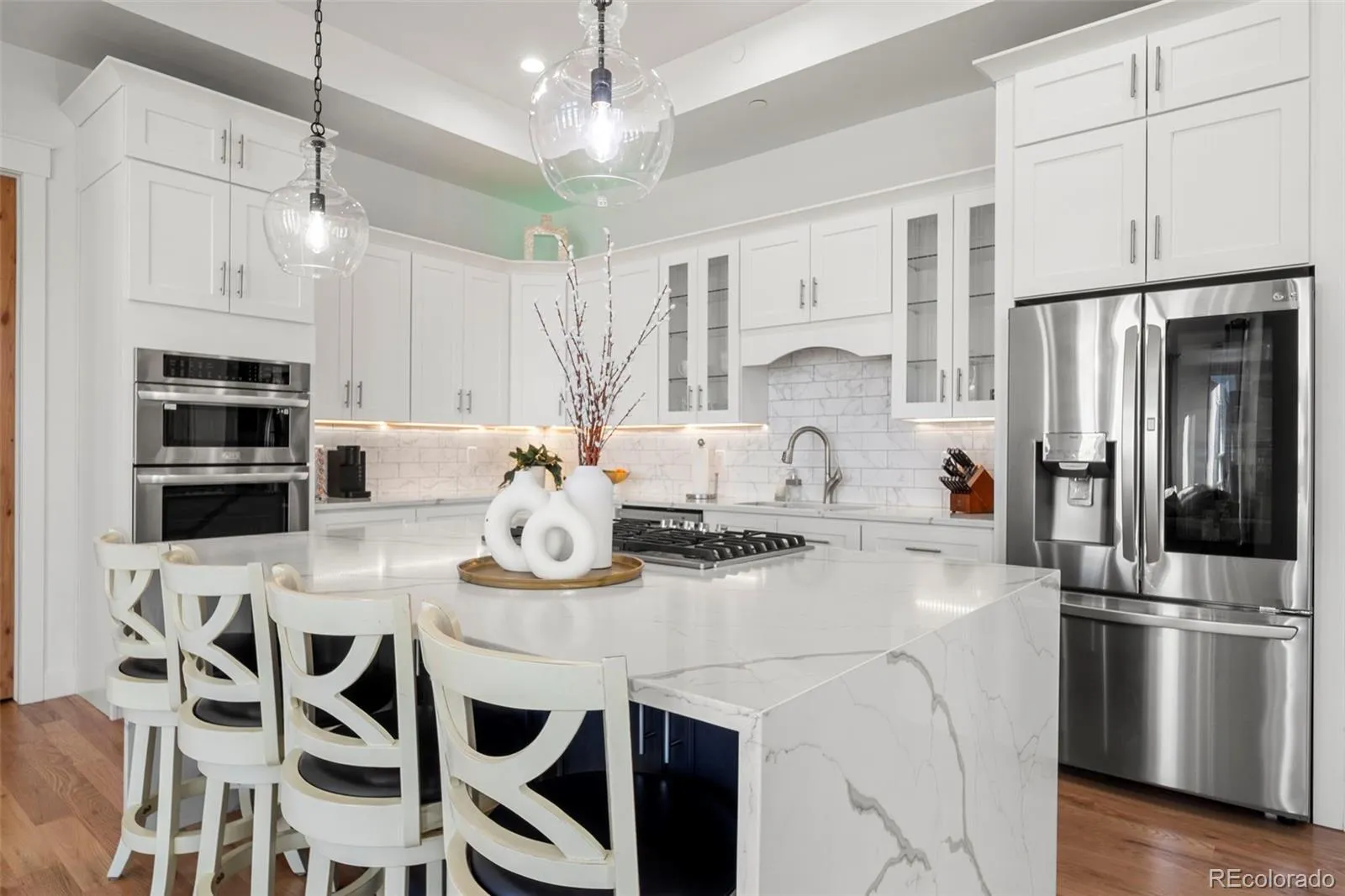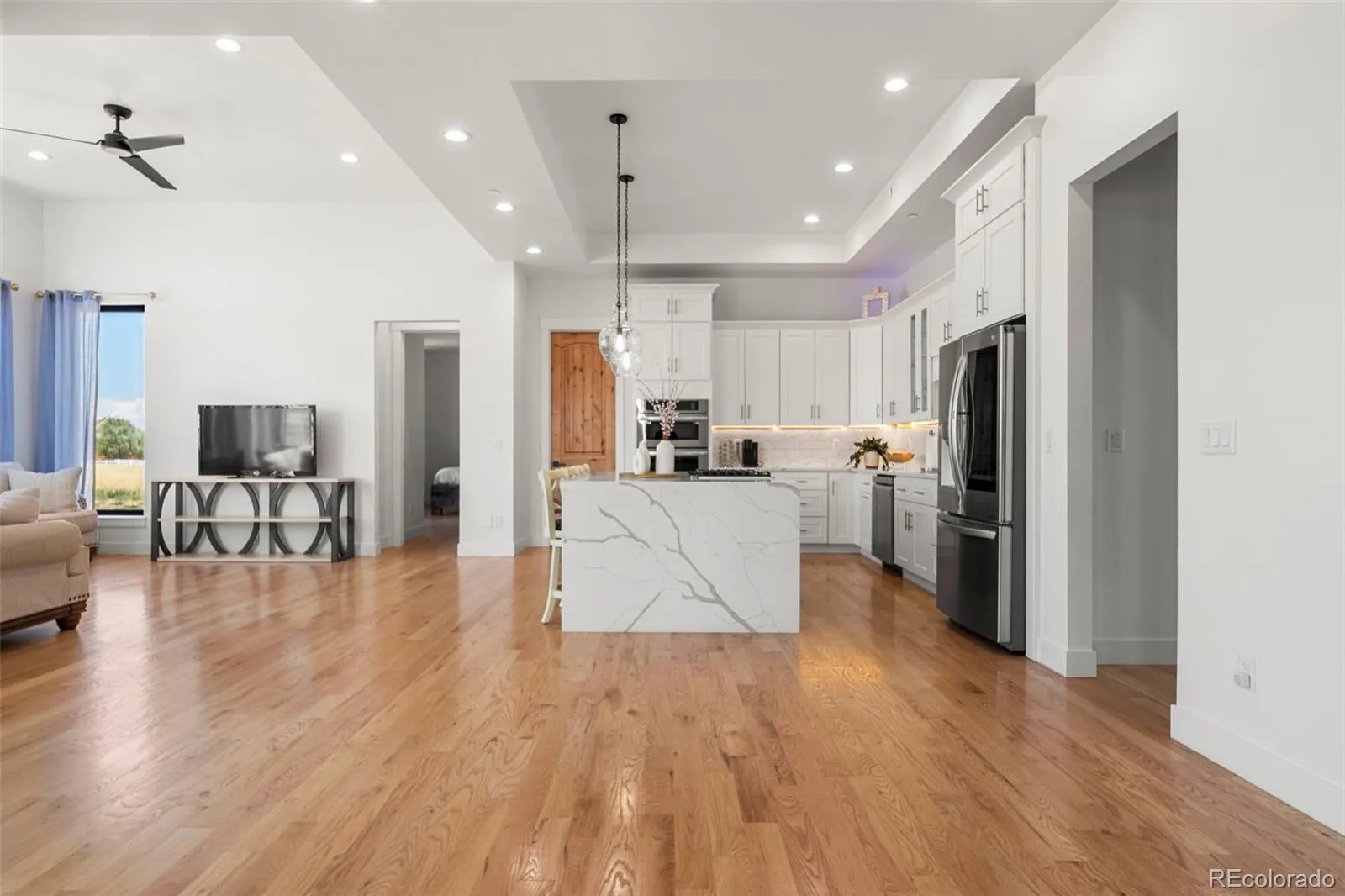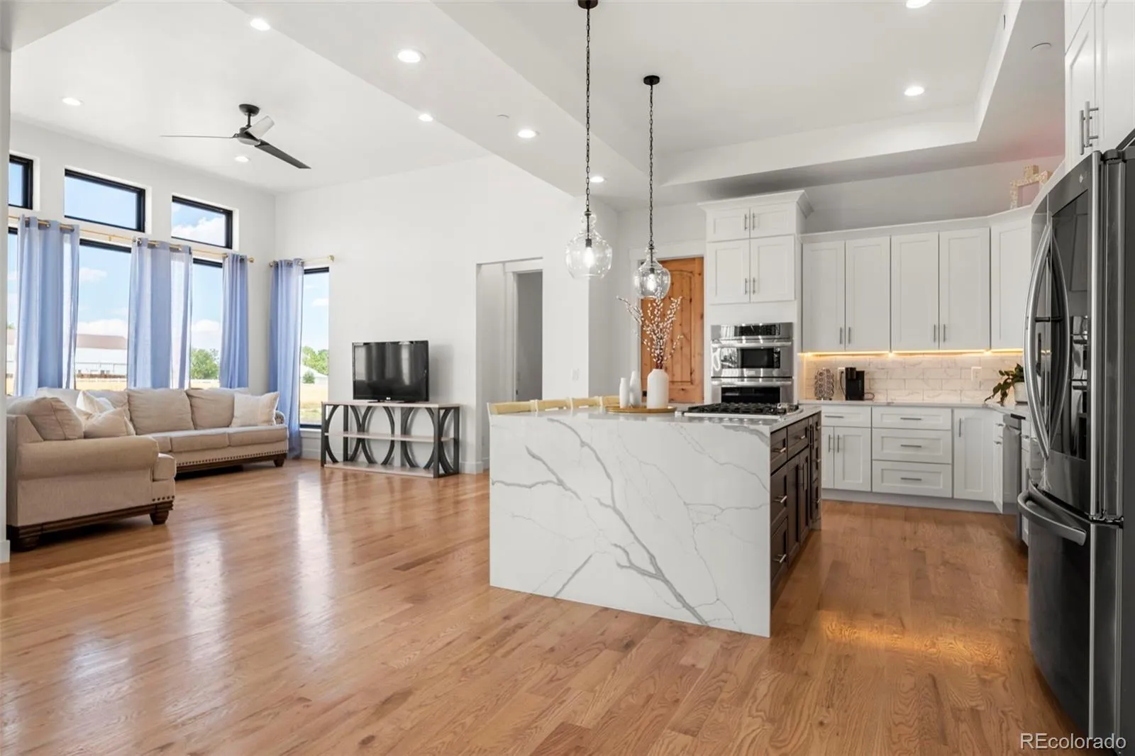 Step inside to a grand great room with vaulted ceilings, a floor-to-ceiling marble-style fireplace, and expansive sliding glass doors opening to a covered patio—perfect for entertaining or relaxing while enjoying mountain views. The chef’s kitchen impresses with waterfall-edge quartz counters, soft-close cabinetry, stainless-steel appliances, and a spacious island designed for gatherings. Natural light pours through large windows, highlighting the beautiful hardwood floors and clean architectural lines throughout the home.