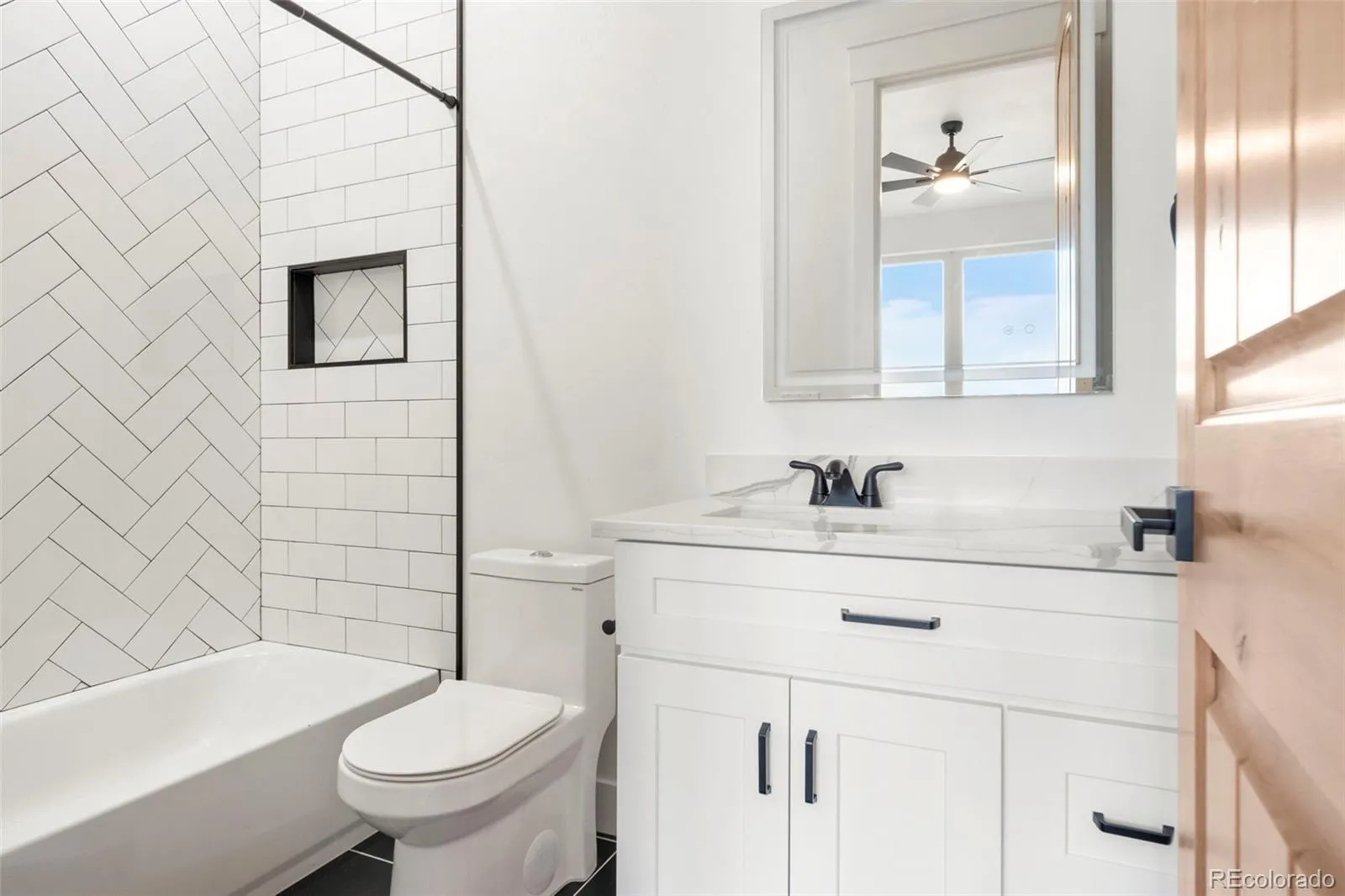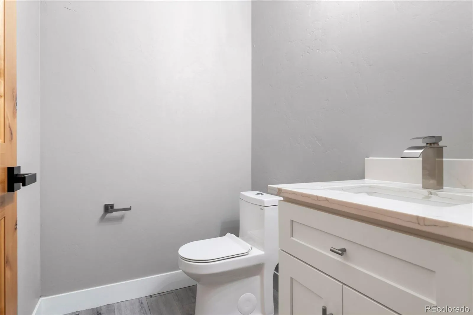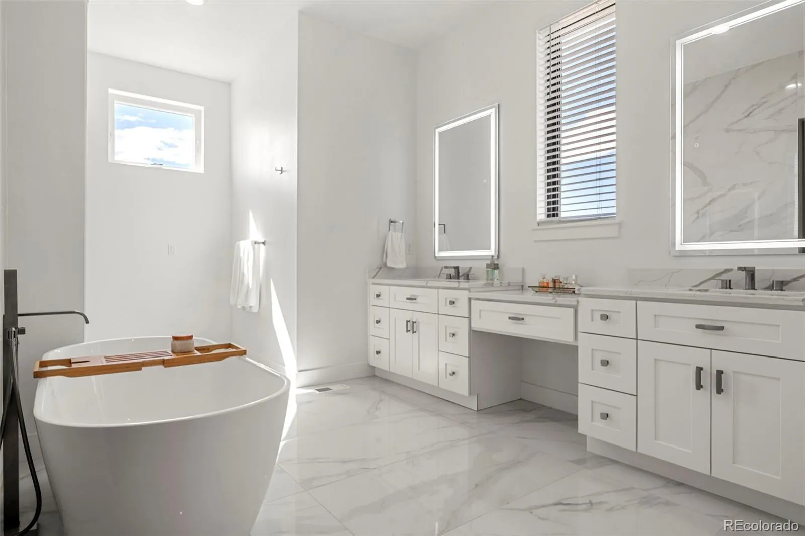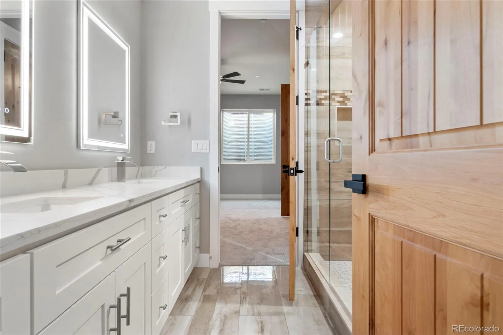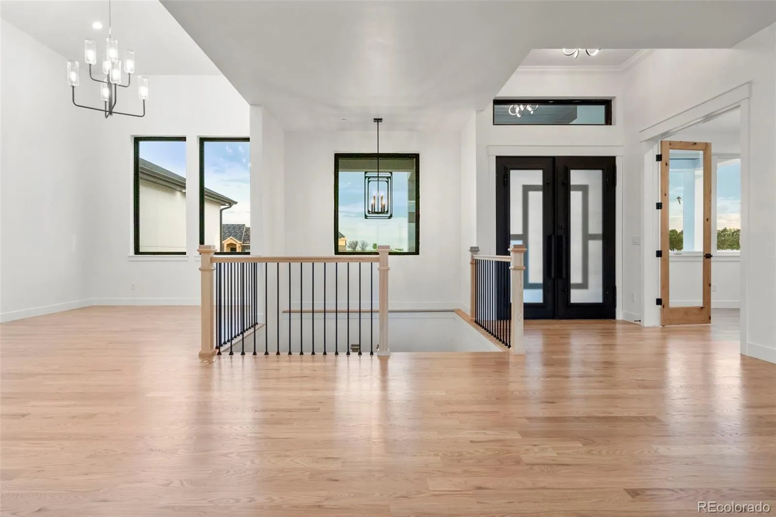 Step inside to a grand great room with vaulted ceilings, a floor-to-ceiling marble-style fireplace, and expansive sliding glass doors opening to a covered patio—perfect for entertaining or relaxing while enjoying mountain views. The chef’s kitchen impresses with waterfall-edge quartz counters, soft-close cabinetry, stainless-steel appliances, and a spacious island designed for gatherings. Natural light pours through large windows, highlighting the beautiful hardwood floors and clean architectural lines throughout the home.