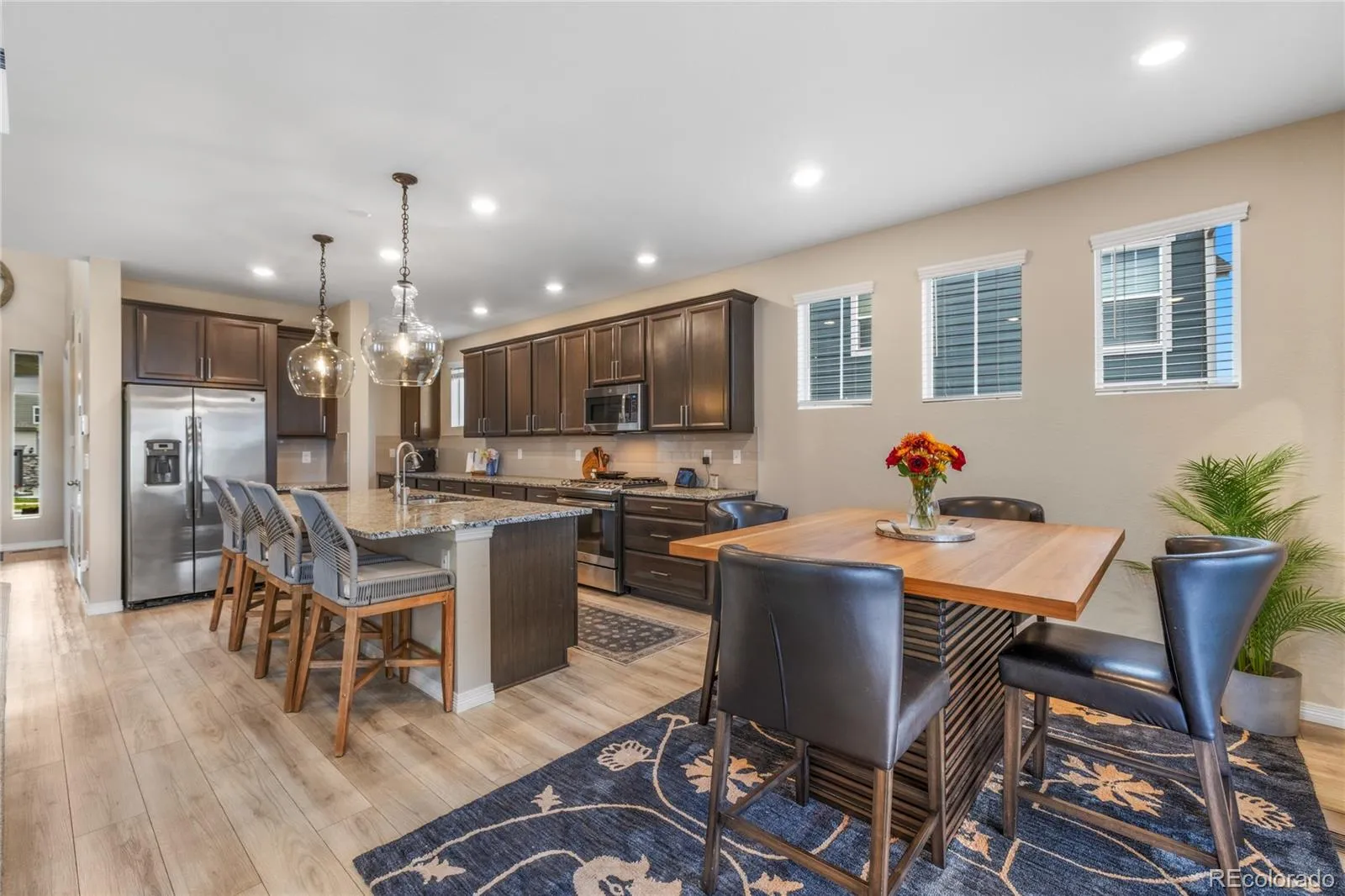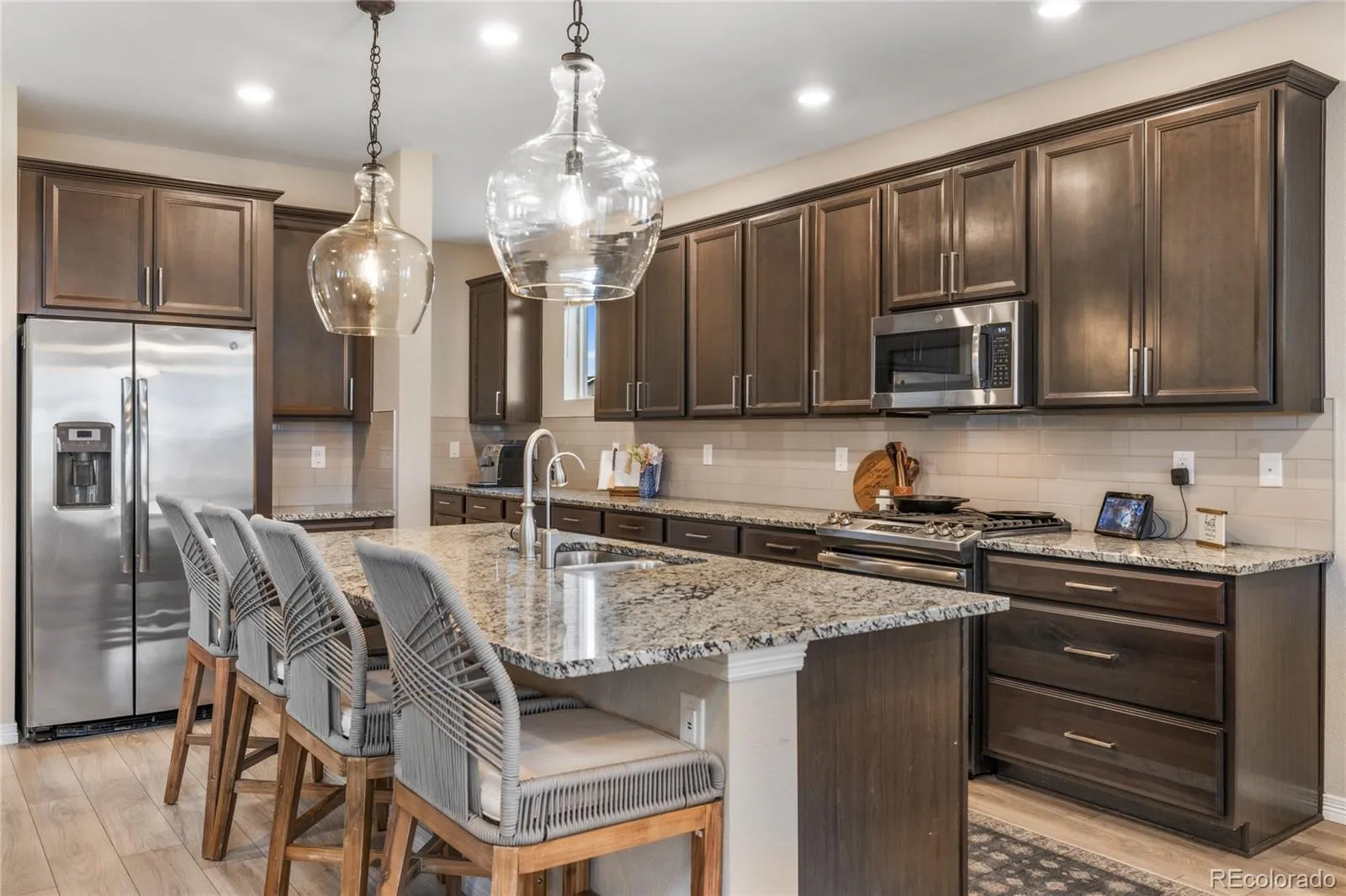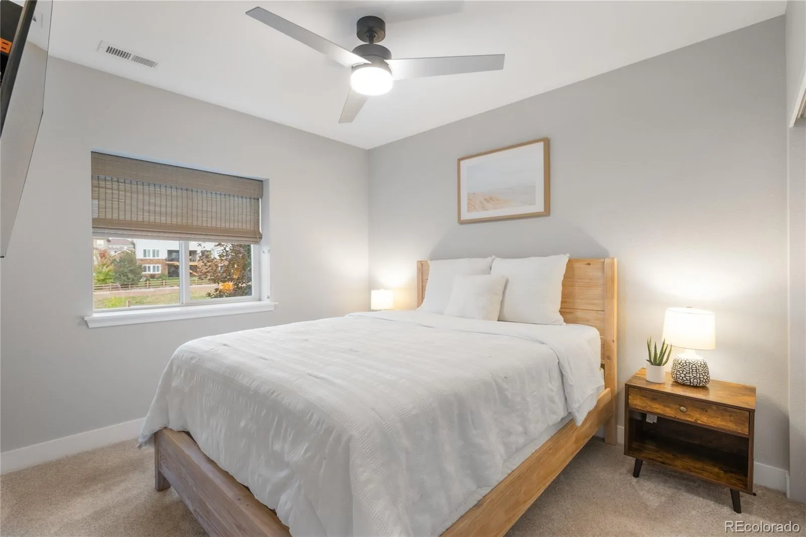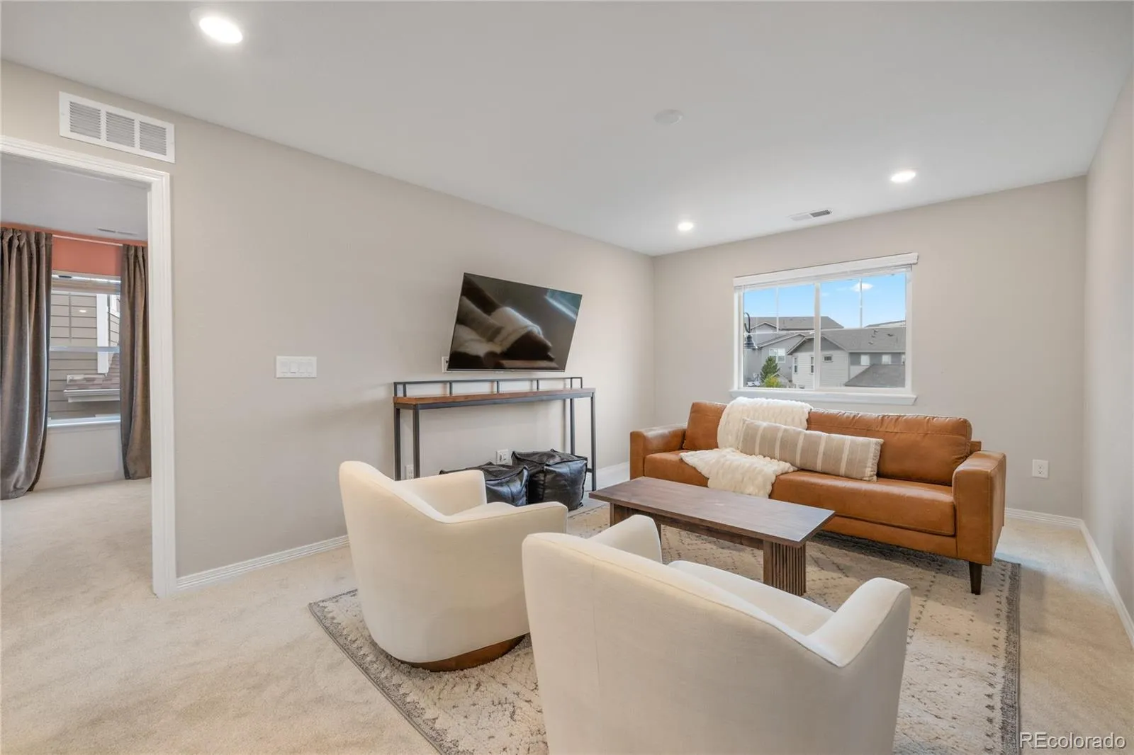 Welcome to this stunning 5-bedroom, 4-bath home in the highly sought-after Whispering Pines community. Backing to open space, this two-story home blends everyday comfort with thoughtful design. The main level welcomes you with a vaulted entry and a bright, open layout. Off the front door, there’s a private office—perfect for working from home. The kitchen offers granite countertops, rich dark cabinetry, and a walk-in pantry, flowing easily into the living room with an electric fireplace. Step outside to a spacious deck that overlooks peaceful open space—an ideal spot for entertaining or simply relaxing at the end of the day. Also on the main floor is a guest bedroom and full bath, plus a convenient mudroom right off the garage. Upstairs, brand-new carpet (October 2025) runs throughout. The primary suite feels like a retreat with its double sinks, glass shower, and oversized walk-in closet. Two additional bedrooms, a full guest bath, and a loft provide plenty of extra living space—perfect for a playroom, media area, or lounge. The finished walk-out basement is where this home truly shines. Designed for versatility, it could serve as a full guest suite or entertainment space. Over $100K in upgrades include a gorgeous full kitchen with quartz countertops, blue cabinetry, and open shelving. Large sliding doors open to the patio, extending your living space outdoors. The lower-level bathroom was fully renovated with double sinks, a large soaking tub, and a glass-enclosed shower. There’s also an additional bedroom and flex area ideal for a gym, game room, or home theater. Located close to parks, trails, shopping, and E-470, this home offers both convenience and tranquility. Backing to open space, you’ll love the peaceful setting and easy access to evening walks and quiet nights under the stars.