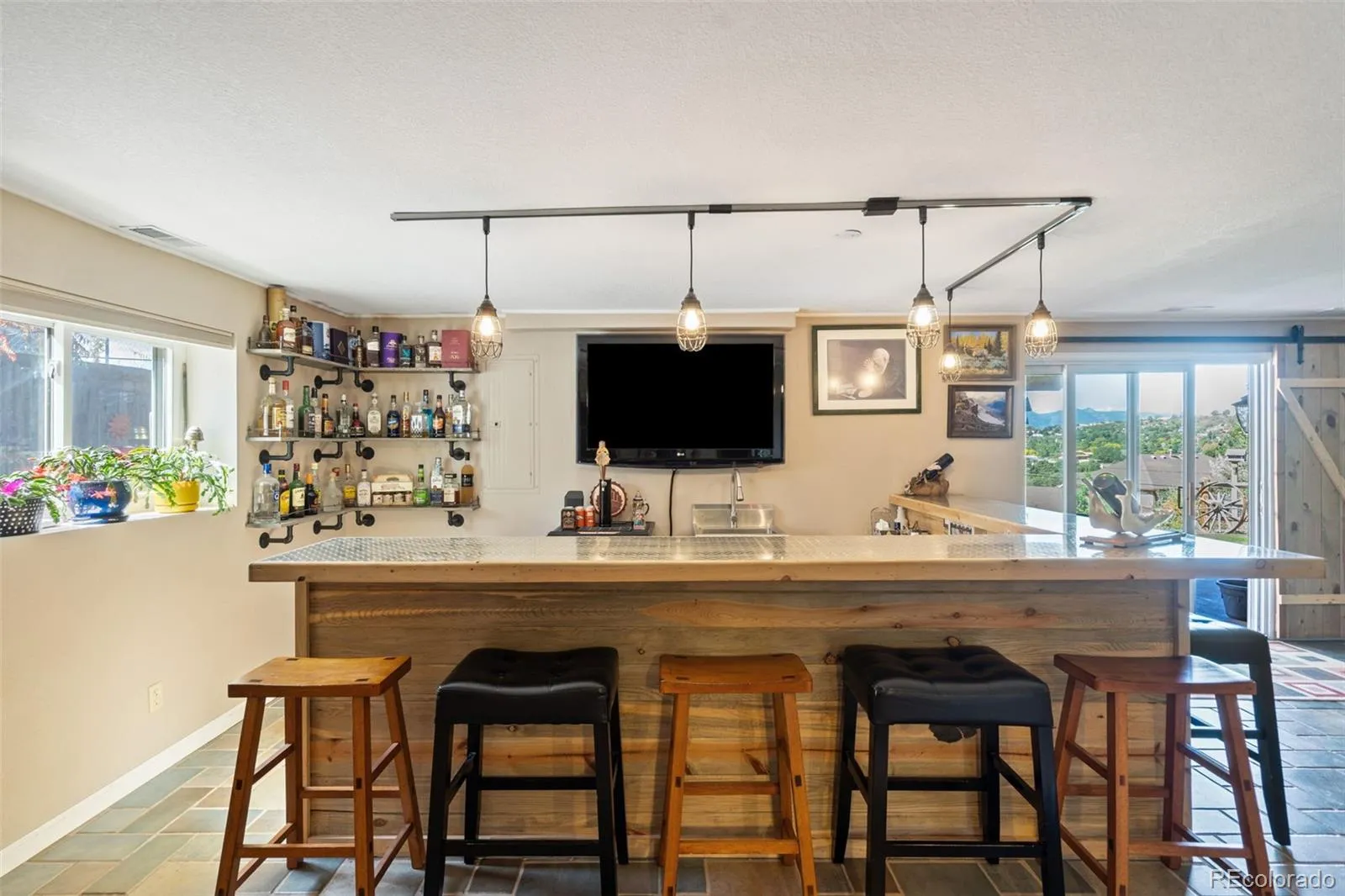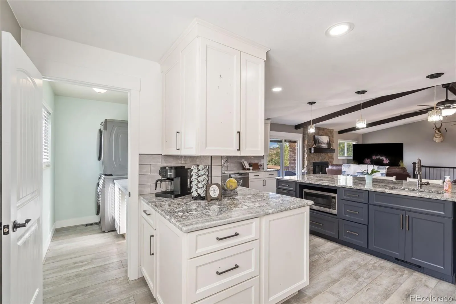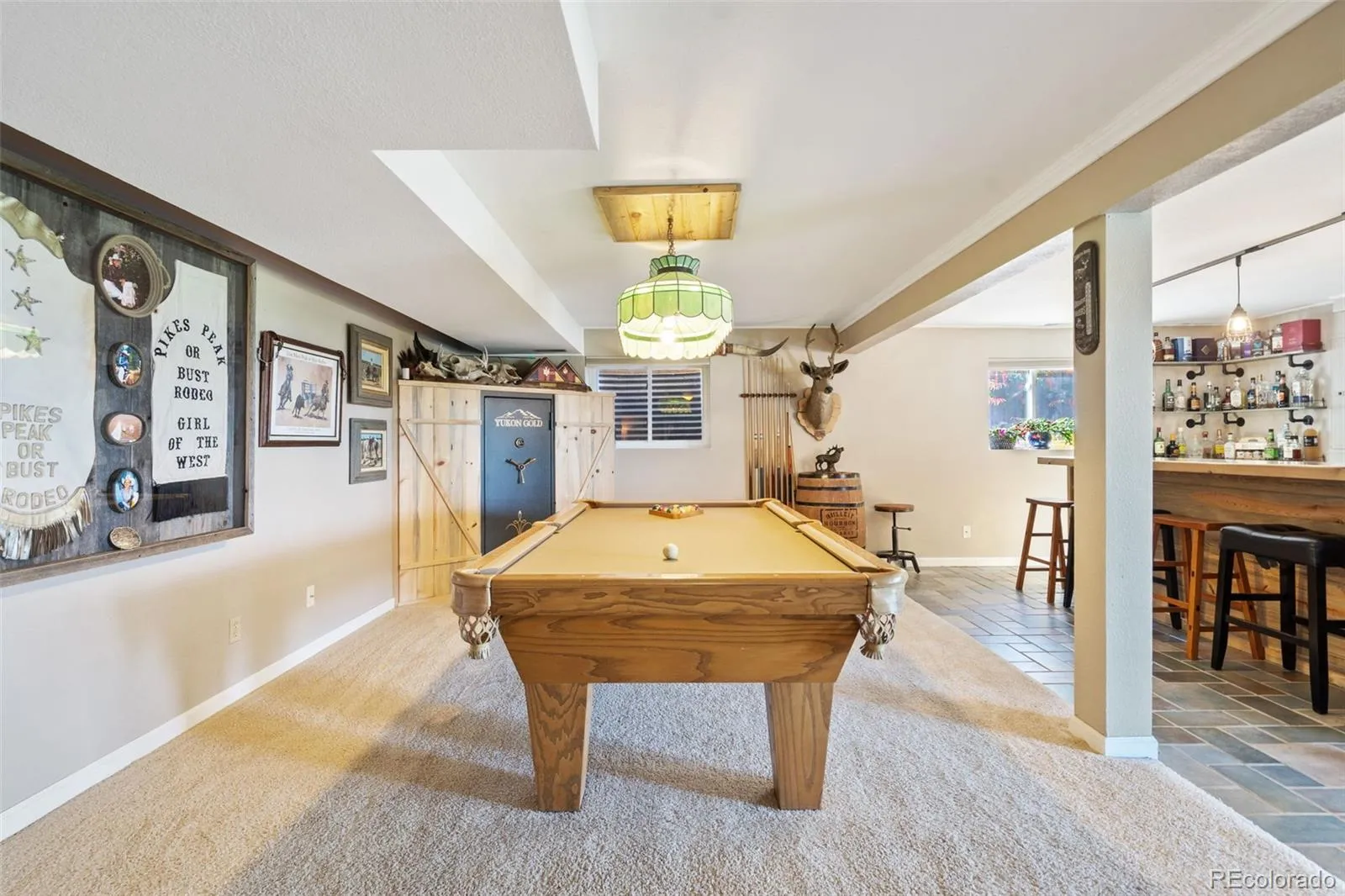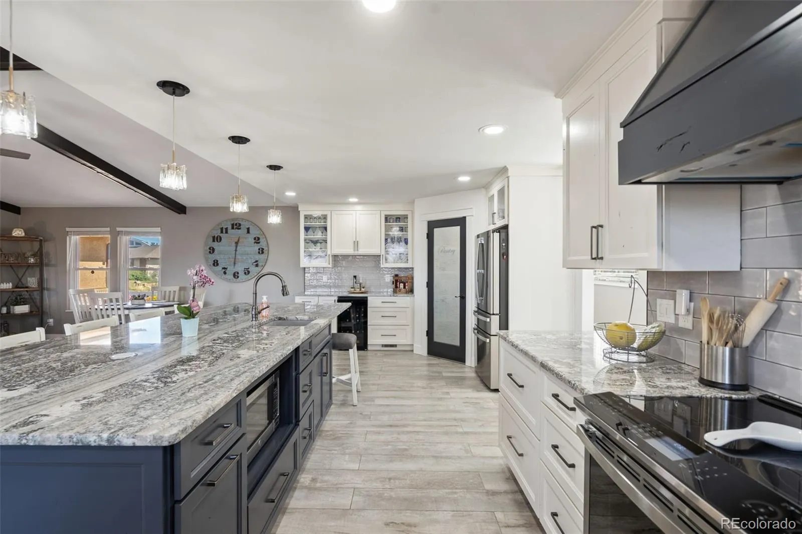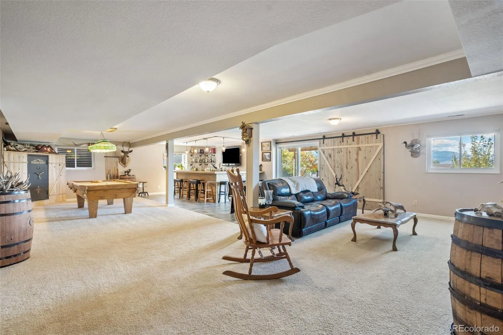 Don’t miss your chance to own this beautifully updated 5-bedroom, 3-bath ranch home on a spacious ½-acre lot in sought-after Park Vista Estates, offering true main-level living. The open floor plan showcases a stunning designer kitchen with gorgeous granite countertops, a walk-in corner pantry, and an oversized island that flows seamlessly into inviting living spaces—perfect for both everyday comfort and entertaining. Step out onto the composite deck to sip your morning coffee or unwind with a glass of wine while soaking in breathtaking views of Pikes Peak and the surrounding mountains. The main level also includes a conveniently located laundry area, the primary suite with adjoining bath and walk-in closet, plus two additional bedrooms and a full bath. The fully finished walk-out basement is an entertainer’s dream, featuring a spacious recreation room, custom wet bar, and a pool table that stays with the home. Outdoor living is equally impressive with stamped concrete patios and a sprawling fenced backyard ideal for barbecues, quiet evenings, or playtime with your pups. Thoughtful details such as a paved driveway, welcoming low-maintenance xeriscape front yard, and ample RV parking enhance both convenience and curb appeal. Recent upgrades include the new kitchen and living room space, new roof, gutters, furnace, A/C, interior doors and trim, tile flooring, and an upgraded breaker box. This exceptional property combines modern updates, timeless style, and a prime location—come see it in person, you won’t be disappointed!