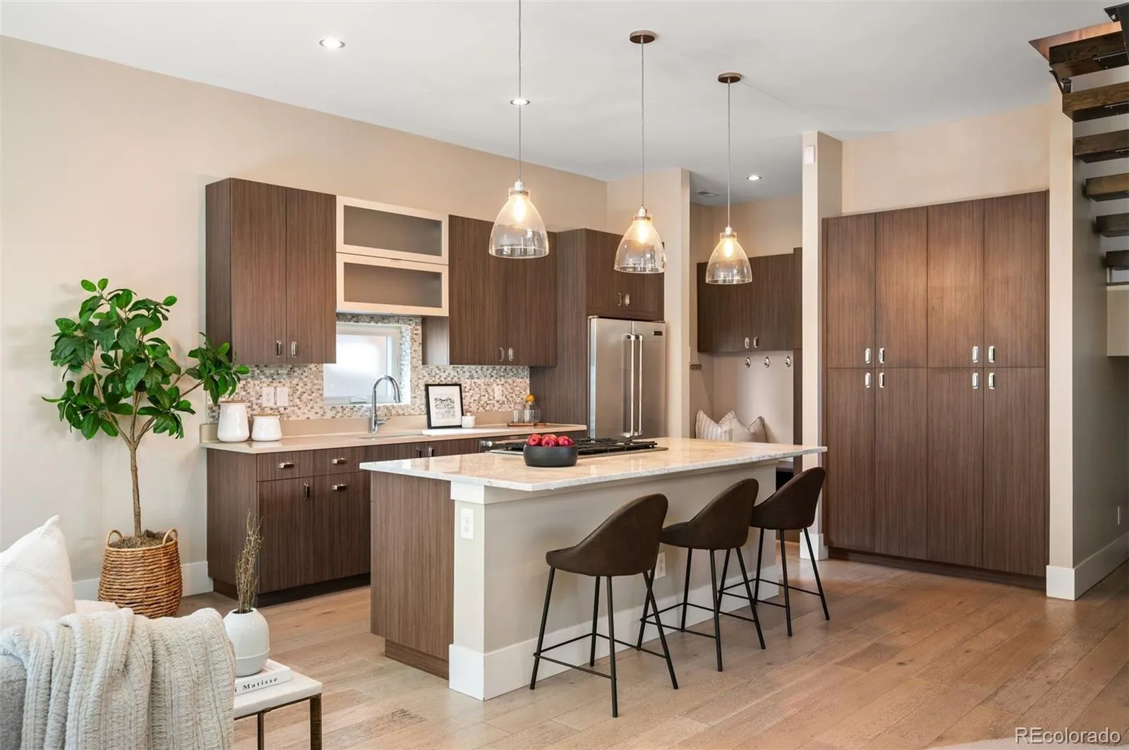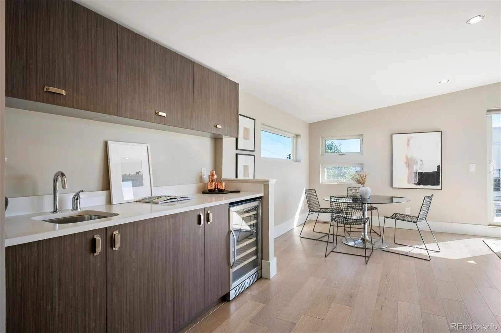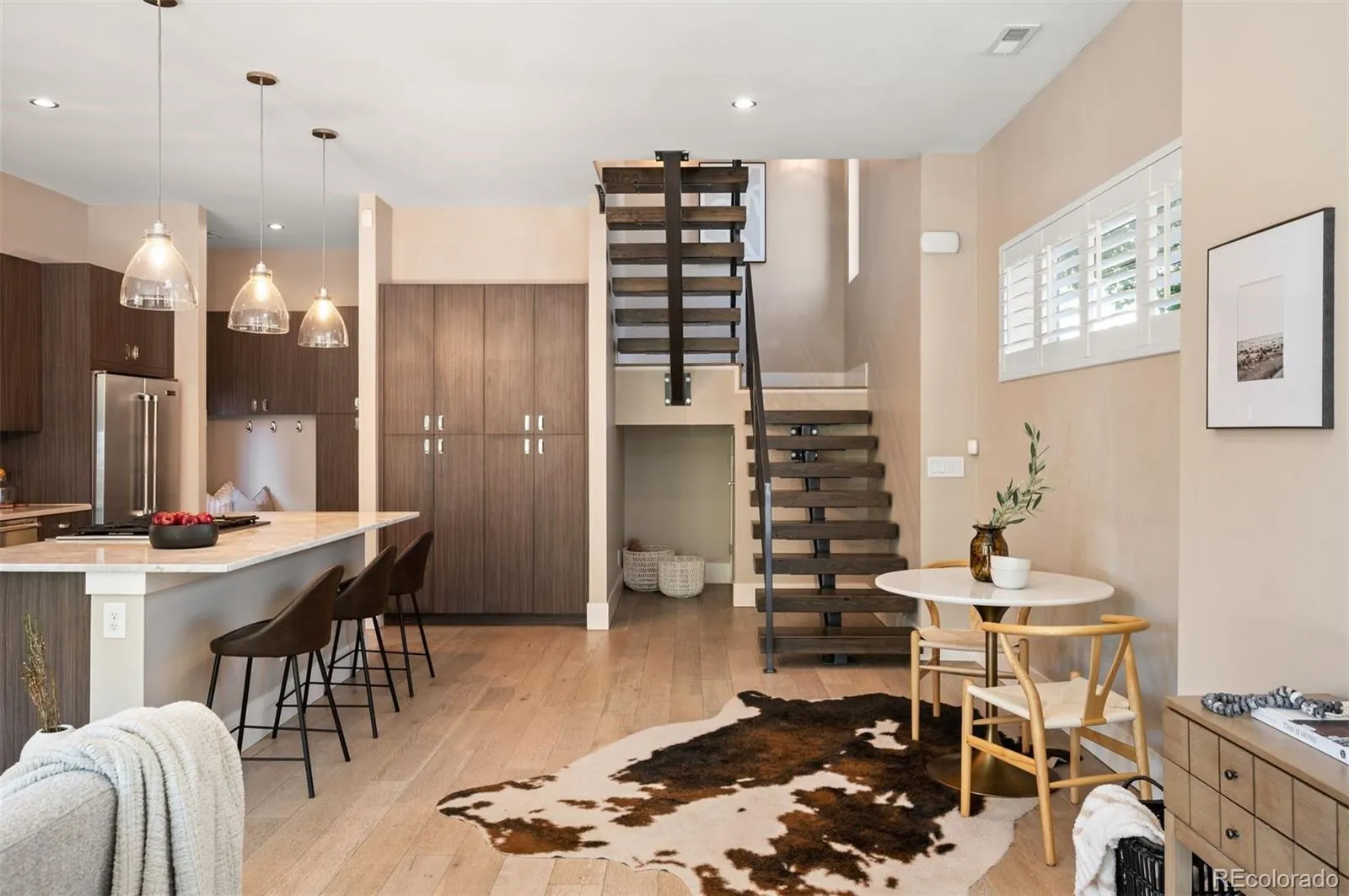 The third floor offers impressive Denver skyline views from the rooftop deck and lounge area. Step back inside to the third level flexible living space with wet bar and wine fridge, perfect for entertaining. Or use this level for guest quarters, as it’s complete with a third bedroom (or office) and three-quarter bath.