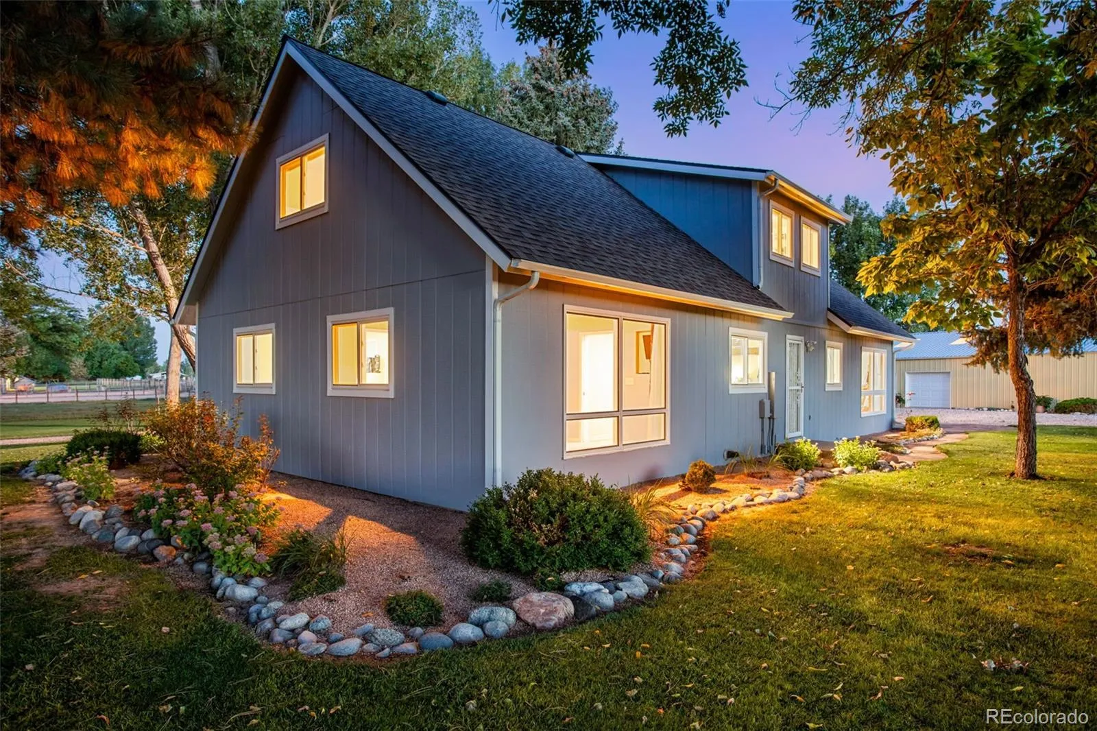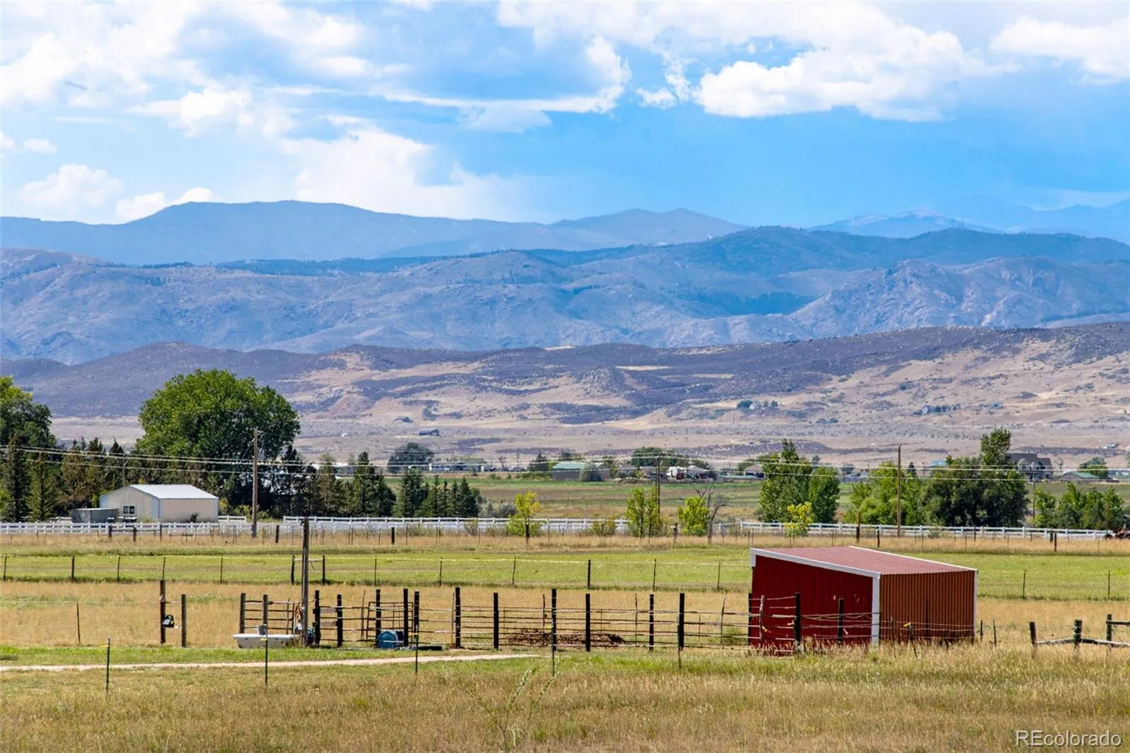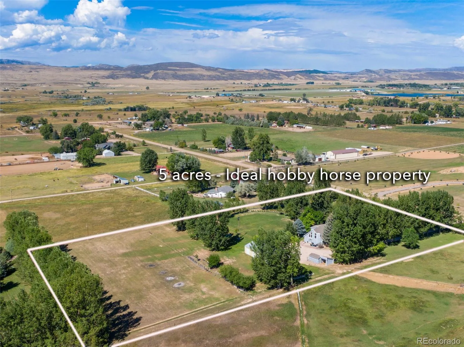 A special offering, where open space, water security, and mountain beauty come together in perfect harmony on 5 peaceful acres. Here is the opportunity to enjoy the best of what northern Colorado offers – a great hobby horse property or organic farm, a picturesque windmill accentuates the property’s panoramic views! Ready for the ultimate pastoral lifestyle and a member of the LADCO water association! (see agent for details) Bathed in natural light + soaring vaulted ceilings, site finished Hickory floors, well-appointment throughout with an inviting chef’s eat-in kitchen + fully remodeled 5 piece primary bath! Large graceful Cottonwoods line the entrance + driveway with several varieties of fruit trees that add seasonal color and charm. 3 Spacious Bedrooms, 3 Baths, convenient Main Floor Primary Suite + Upper level secondary Suite + nearly all newer windows! Expansive Eat-in Kitchen, Corian countertops, SS appliances gas range/dual fuel, huge center island excellent workspace + storage! The perfect Oasis for Farm to Table! New Carpet in the Primary Suite, Upstairs Suite + the office/desk area in the loft. Newer Roof on all buildings in 2018 & exterior paint done, on Barn tuff rib metal roof. 3 outbuildings, 65 X 36 Massive 6 Car Tandem Garage/Shop + Barn with 2 stalls + one oversized stall) new concrete flooring in breezeway. Steel barn with 50amp for an RV, scenic pond that serves both irrigation and overflow purposes, enhancing beauty and functionality. In the main home-Tankless Hot Water Heater, Trane furnace/Central AC, wall-in wood F/P in living rm (easily convertible to gas, line brought to it) 5 Piece Luxury Primary Bath-beautifully remodeled with oversized soaking tub & walk-in shower, heated floors + walk-in closet. Expansive south patio area concrete & flagstone with natural Gas BBQ line. Hydrants onsite + 4 standing beds on the east side. All appliances included + easy 15min. into Old Town Fort Collins + easy access to I-25, Pride of Ownership shines!