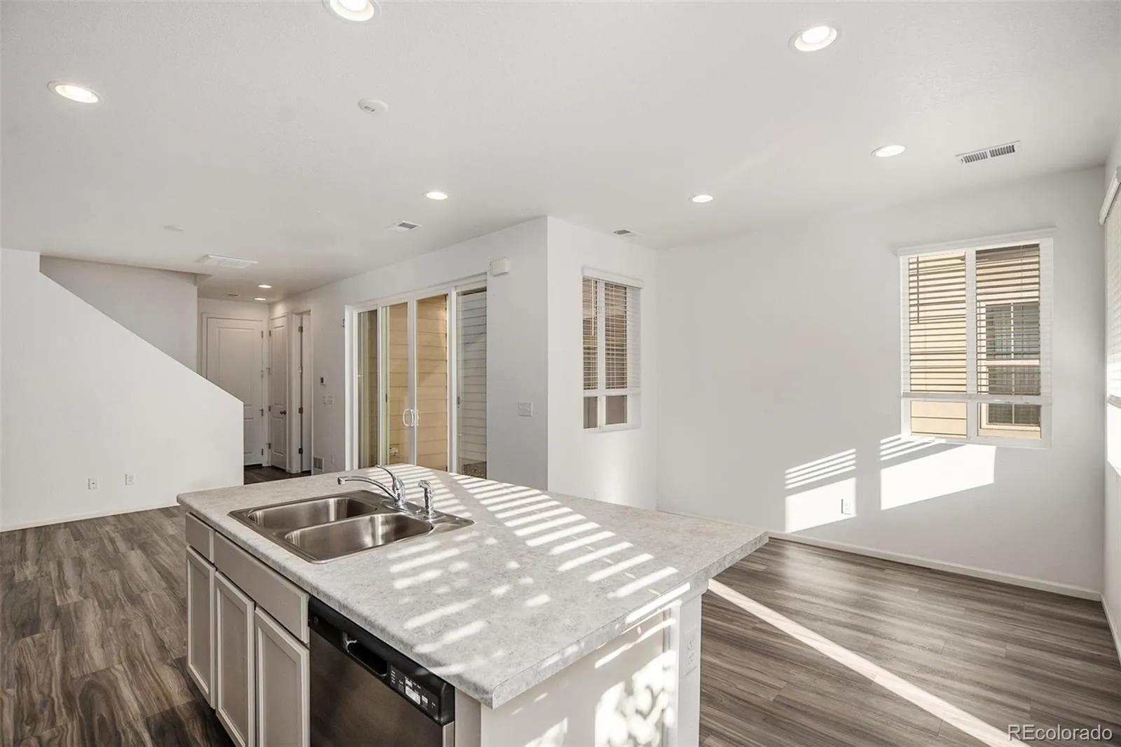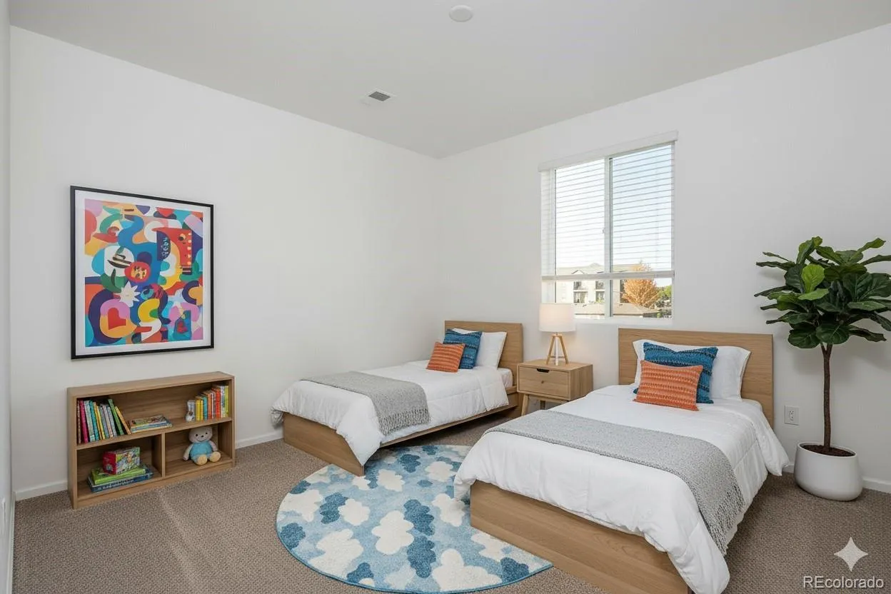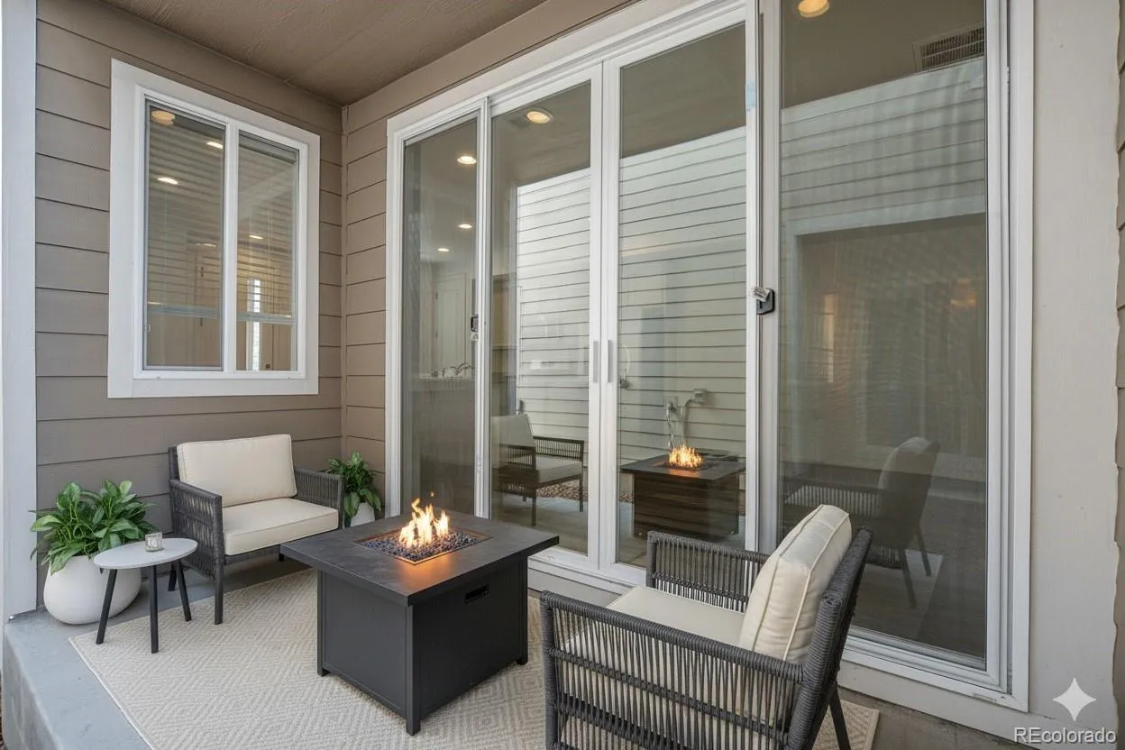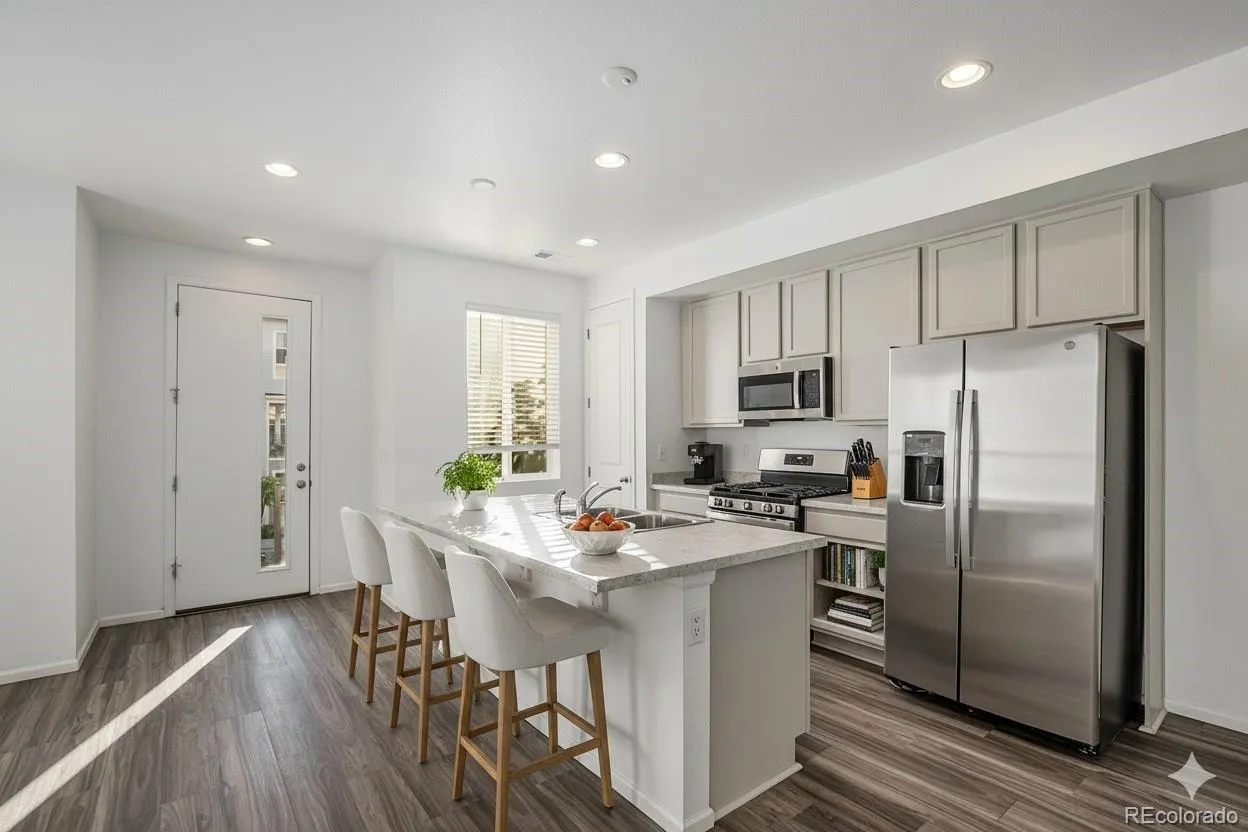 Low-maintenance living meets modern design in this beautifully finished townhome, highlighted by its unique courtyard that fills the home with natural light and creates a seamless indoor-outdoor flow. Set within a well-kept community, this residence offers easy access to nearby parks, trails, shopping, dining, and major commuter routes. Enjoy the convenience of being close to neighborhood amenities while still connected to everything Denver has to offer. On the main level, beautiful flooring, recessed lighting, and an open floorplan make the space feel bright and inviting. The kitchen features stainless steel appliances, pantry storage, and an oversized island with bar seating. A dining area and spacious living room connect to the courtyard, offering an ideal setting for both daily living and entertaining. A convenient powder bath completes this level. Upstairs, the primary suite is a private retreat with a walk-in closet and en-suite bath showcasing dual vanities and a large step-in shower. Two additional bedrooms share a full hall bath, providing flexible space for family, guests, or a home office. A laundry area is thoughtfully located on this level for added ease. Additional features include energy-efficient windows, plenty of storage, and a spacious attached two-car garage. With stylish finishes, a functional layout, and lock-and-leave convenience, this modern townhome is designed for today’s lifestyle.