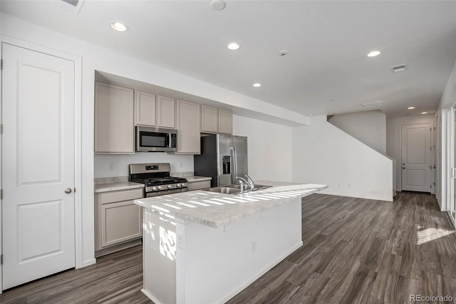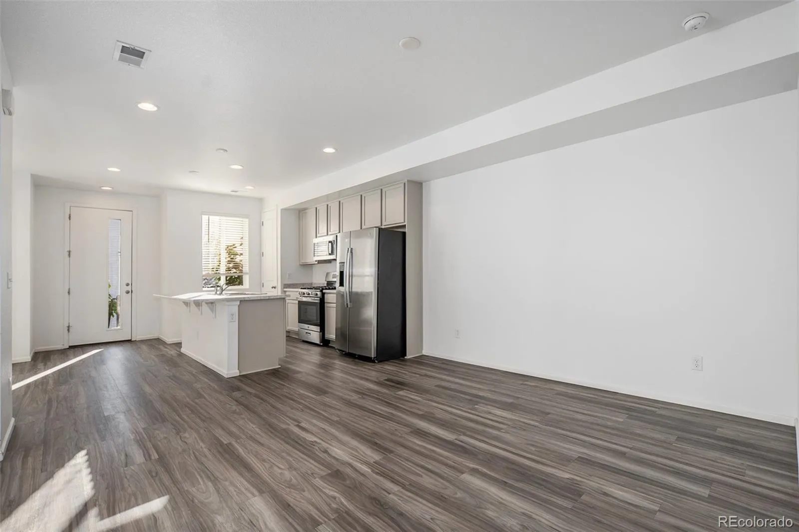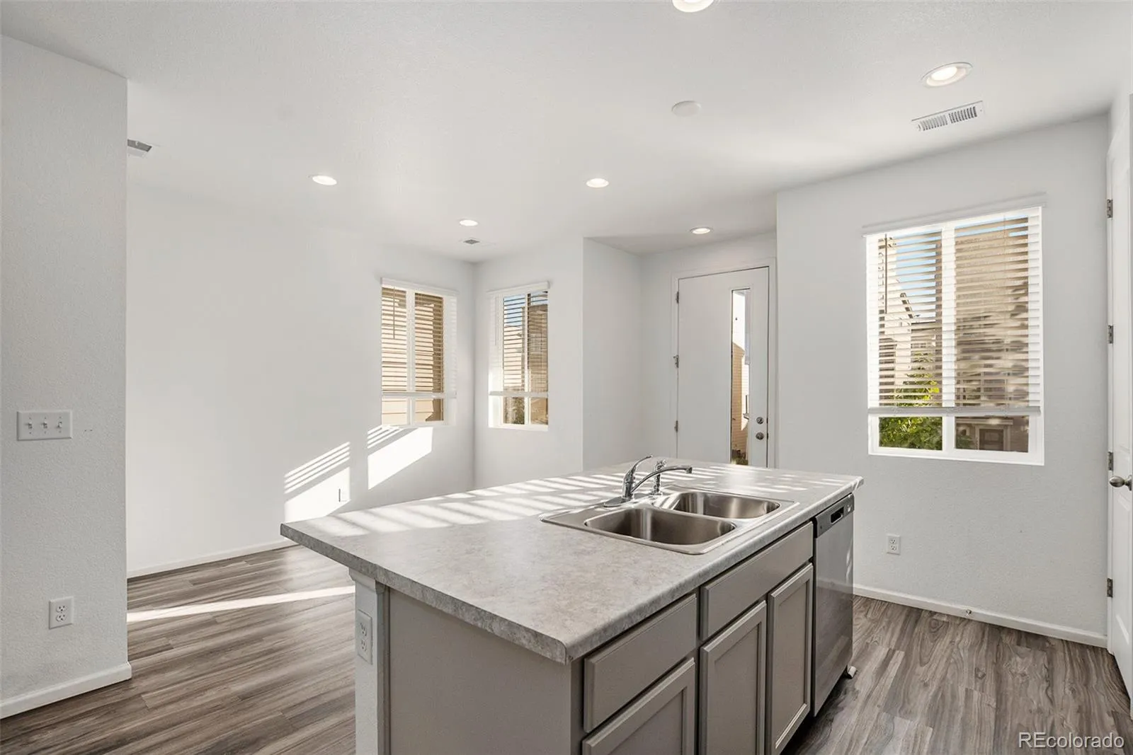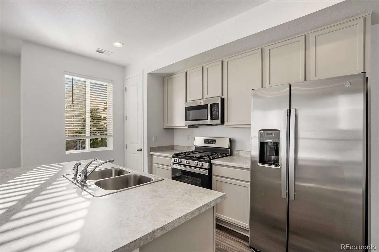Low-maintenance living meets modern design in this beautifully finished townhome, highlighted by its unique courtyard that fills the home with natural light and creates a seamless indoor-outdoor flow. Set within a well-kept community, this residence offers easy access to nearby parks, trails, shopping, dining, and major commuter routes. Enjoy the convenience of being close to neighborhood amenities while still connected to everything Denver has to offer. On the main level, beautiful flooring, recessed lighting, and an open floorplan make the space feel bright and inviting. The kitchen features stainless steel appliances, pantry storage, and an oversized island with bar seating. A dining area and spacious living room connect to the courtyard, offering an ideal setting for both daily living and entertaining. A convenient powder bath completes this level. Upstairs, the primary suite is a private retreat with a walk-in closet and en-suite bath showcasing dual vanities and a large step-in shower. Two additional bedrooms share a full hall bath, providing flexible space for family, guests, or a home office. A laundry area is thoughtfully located on this level for added ease. Additional features include energy-efficient windows, plenty of storage, and a spacious attached two-car garage. With stylish finishes, a functional layout, and lock-and-leave convenience, this modern townhome is designed for today’s lifestyle.