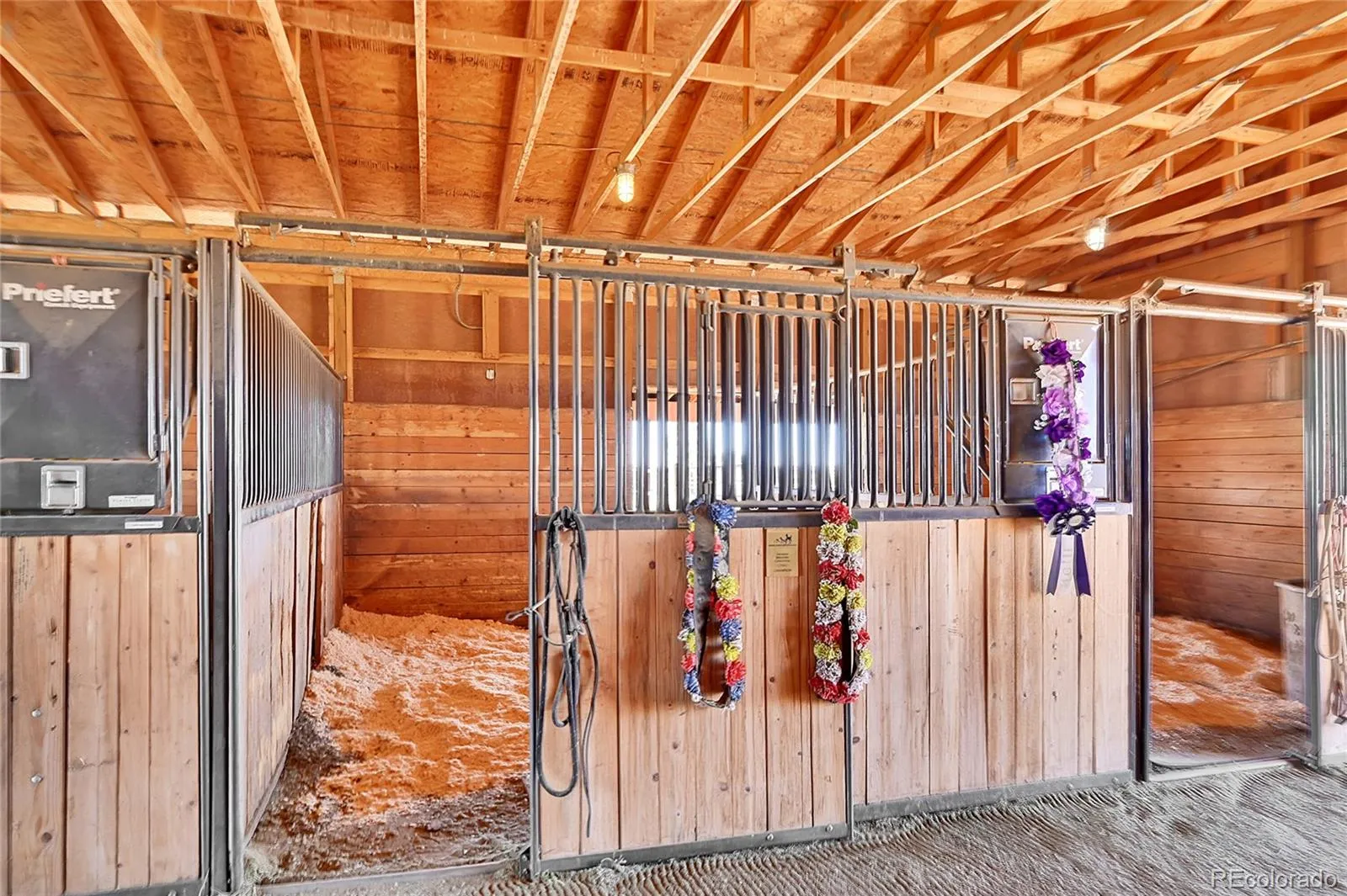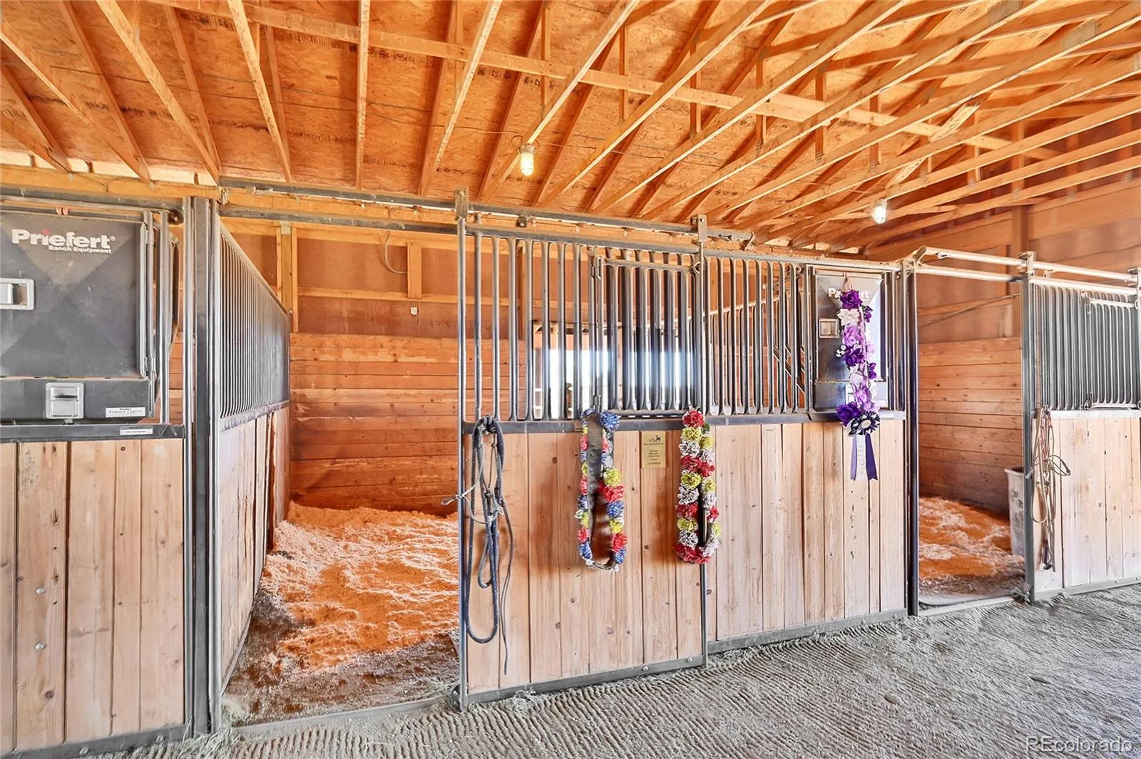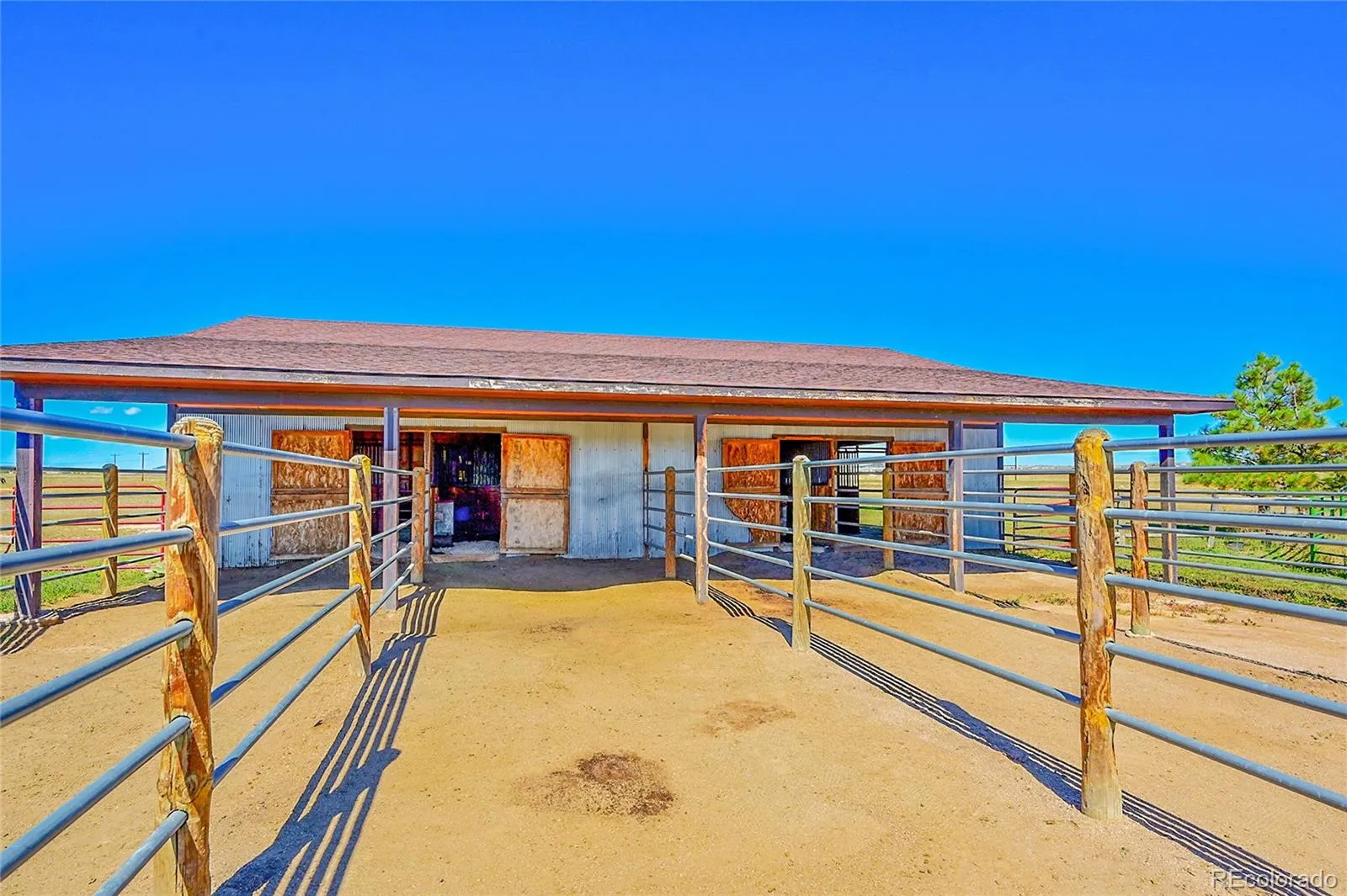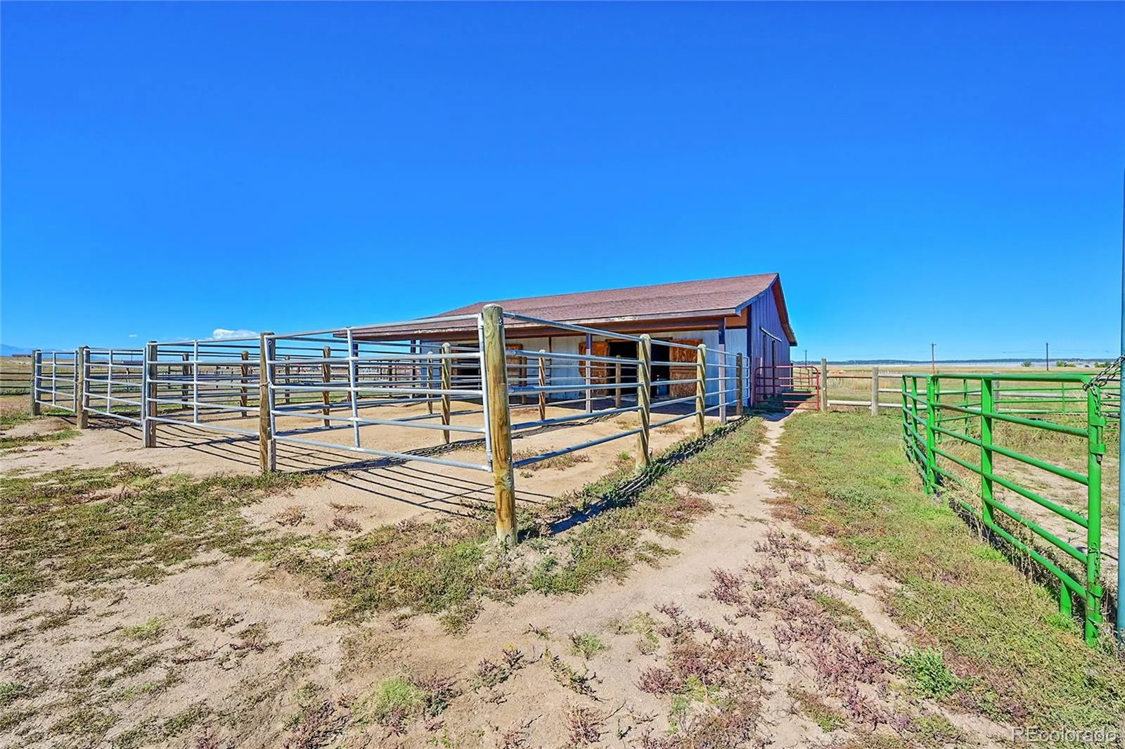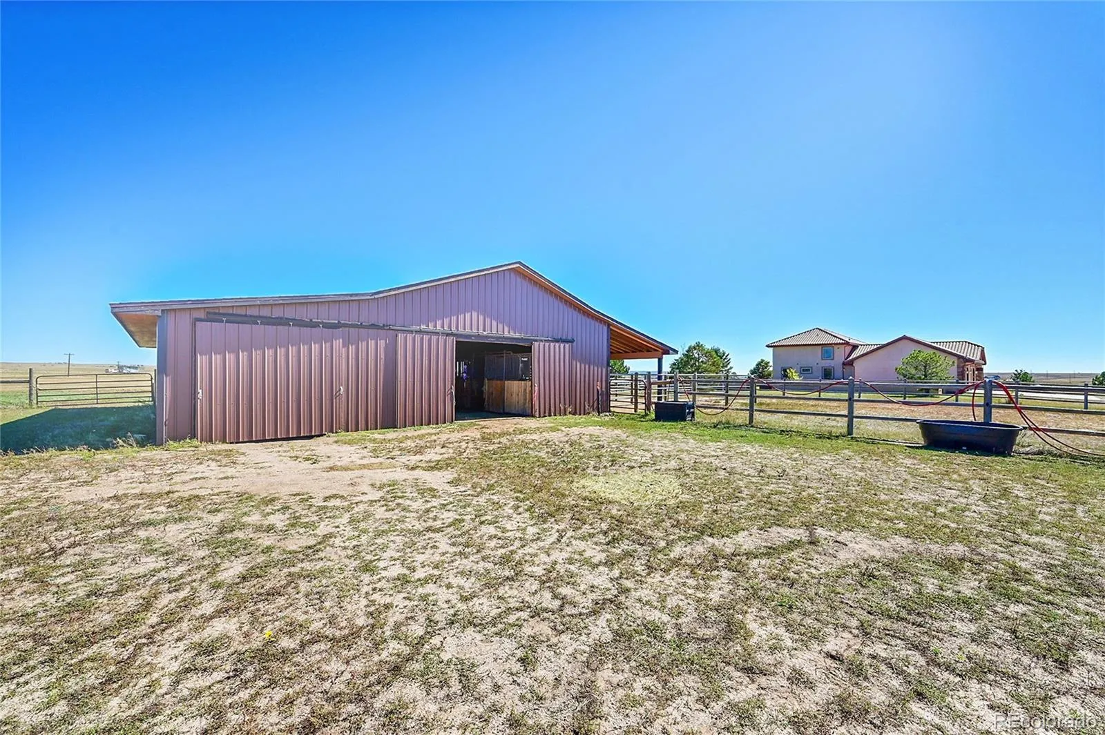 shelter for horses or livestock. A 100×100 outdoor arena with separating pen is ready for training or riding. Inside, the main