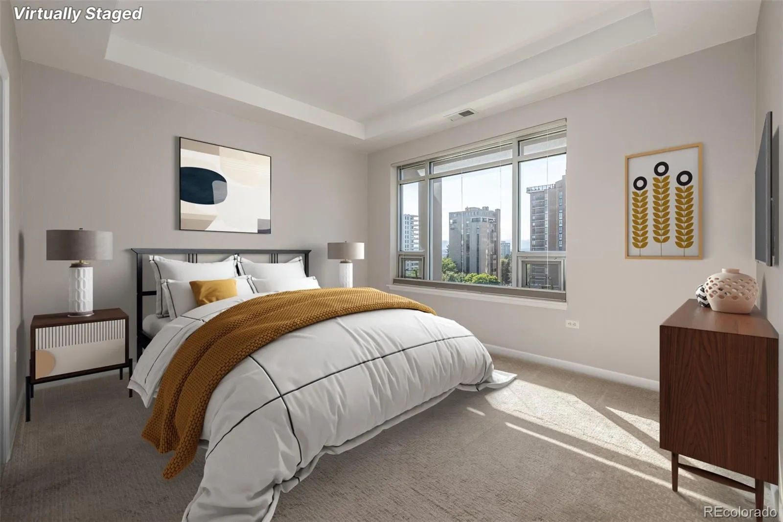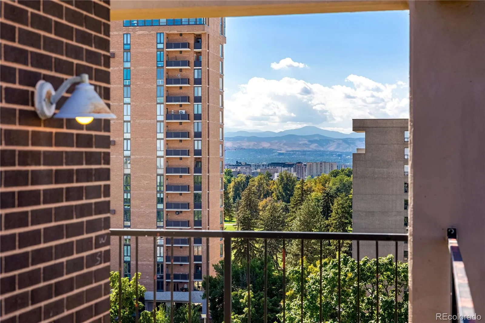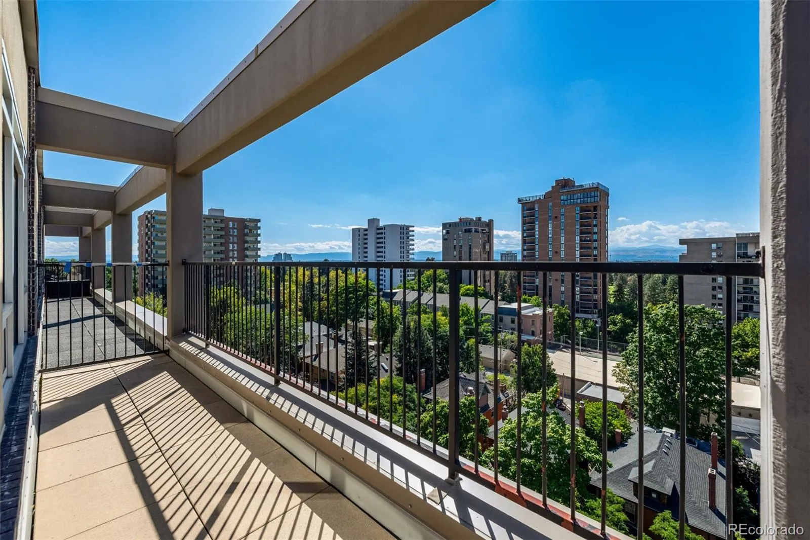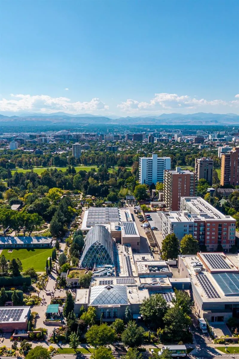 Perched atop an elegant high-rise just up the road from the iconic Cheesman Park, this penthouse suite celebrates city living with panoramic views that sweep from the Denver skyline to the Rocky Mountains. High ceilings lift the eye upward while oversized windows flood the home with light, creating an ever-changing backdrop that frames the city in its most beautiful form. The living room centers around a chic fireplace, its modern design enhanced by contemporary fixtures and warm honey-toned hardwoods that enliven the space. A thoughtfully designed island with pendant lighting connects the kitchen and living area seamlessly, encouraging both effortless flow and refined entertaining. In the kitchen, full-height cherry shaker cabinetry combines timeless style with abundant storage, complemented by stainless steel appliances, vented hood, and elegant countertops that offer a chef-ready workspace. The primary suite rises to meet the views with a coffered ceiling and oversized windows that extend the sense of volume and serenity. An expansive walk-in closet and spa-inspired ensuite bathroom offer a retreat within the retreat. The secondary bedroom is equally well-appointed with a separate accessible bath and thoughtful design. Everyday convenience is elevated with in-unit laundry, two deeded covered parking spaces, and a location that places Cheesman Park, the Denver Botanic Gardens, and countless restaurants and cafes within easy reach. A home of both historical character and modern function, this residence blends chic sophistication with the vibrant energy of Denver living.