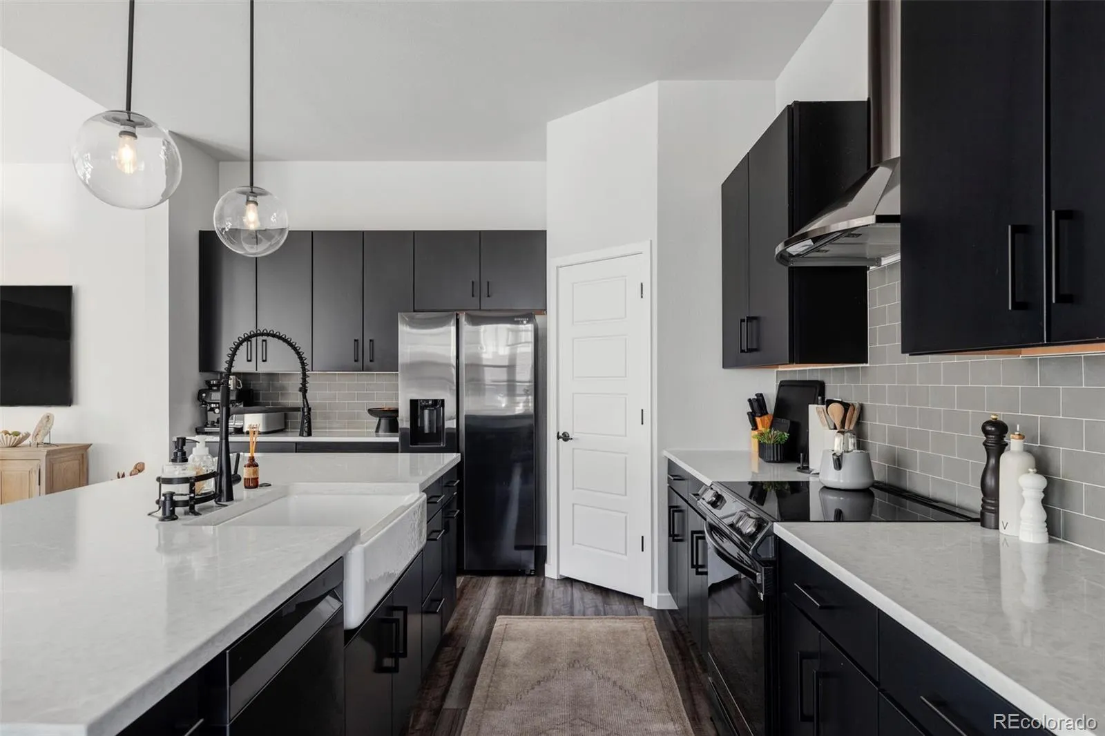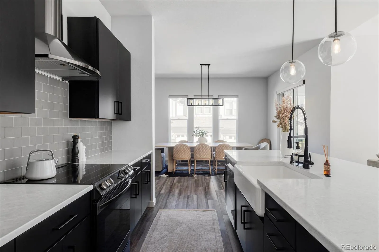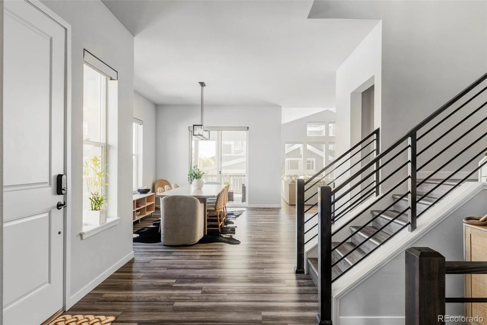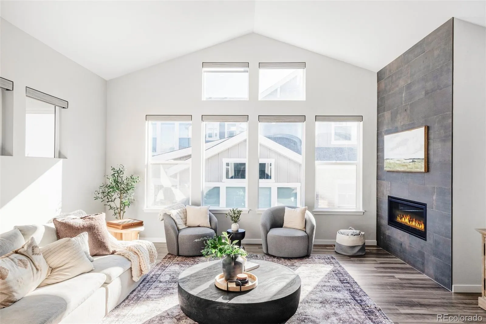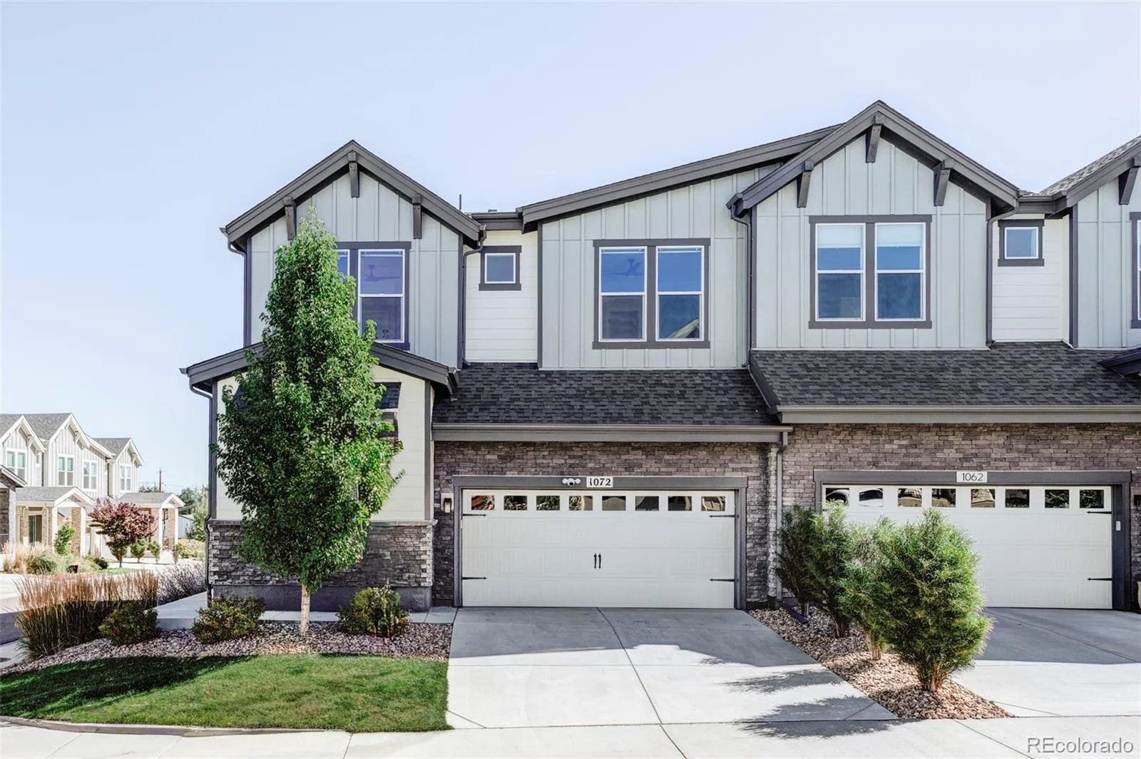 Framed by breathtaking views of South Table Mesa, this end-unit duplex embodies refined modern living with an elevated Colorado sensibility. High-end finishes and thoughtful design define every space, beginning with an open main level adorned with grey oak LVP flooring, 10-foot ceilings (14-ft in living room), and a striking floor-to-ceiling gas fireplace. The chef’s kitchen impresses with an oversized island, walk-in pantry, stainless steel range and shaker-style soft-close cabinetry, illuminated by modern pendant lighting. The dining area opens to a spacious outdoor entertaining space, creating a seamless flow between indoor and outdoor living. A light-filled office rounds out the first floor. Upstairs, the primary suite showcases 14-ft vaulted ceilings, a spa-like bath and a generous walk-in closet, joined by two additional bedrooms, as well as a second bathroom, and a convenient laundry room featuring utility sink. The finished basement offers flex space, wet bar, guest suite, and additional living area, as well as large storage room. The attached two-car garage and access to nearby trails complete this inviting Golden retreat. Ample additional guest parking on 10th Ave.