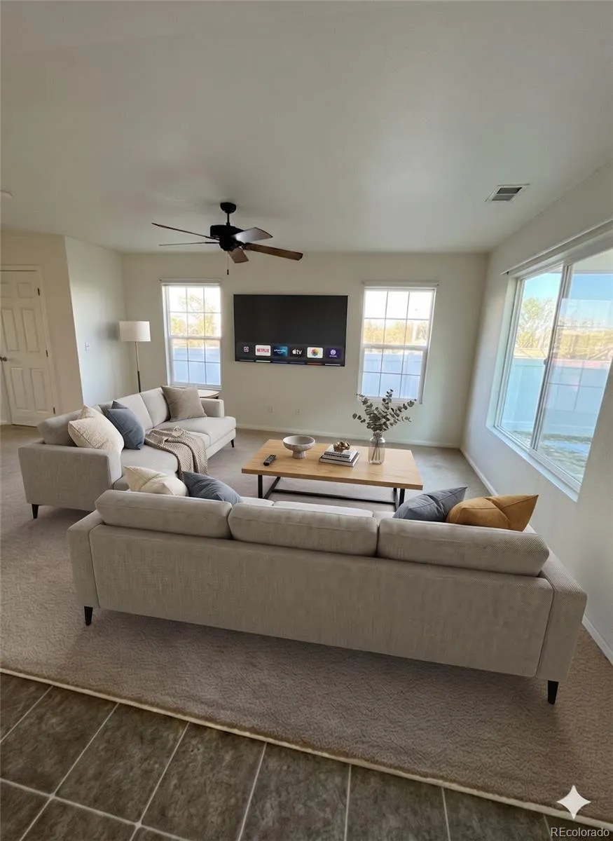 Inside, the 1,850 sq. ft. floor plan glows with natural light, featuring a modern kitchen with a new stove and microwave, plus plush new carpet in the living area. The versatile upper-level loft is perfect for your home office or creative space. Step outside to your private patio—complete with an awning for shade—situated on a spacious corner lot.