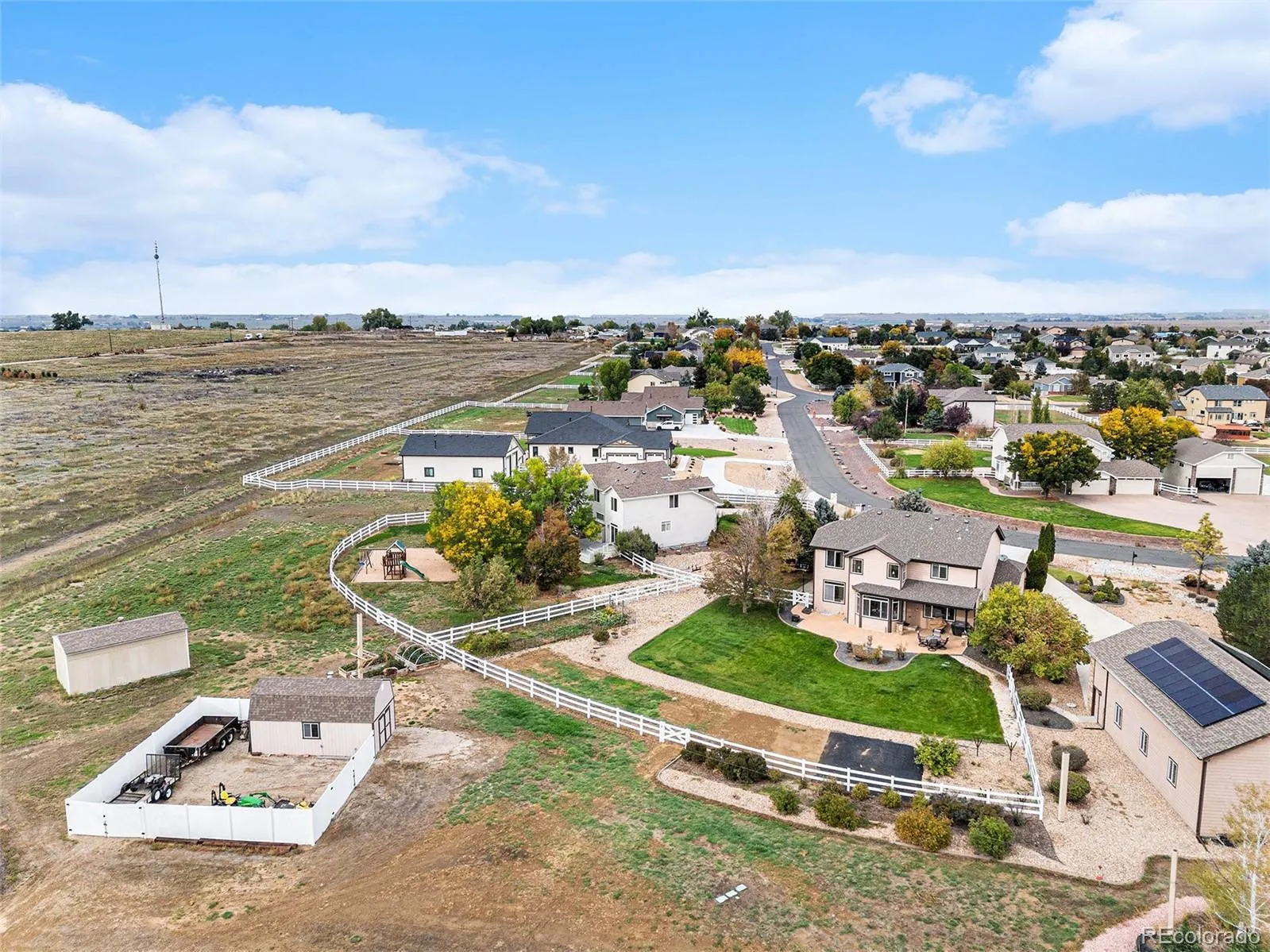 Experience country living with modern comfort at this Todd Creek Meadows estate! Set on 1.4 acres, the property features open living spaces, soaring ceilings, and a spacious great room with a cozy gas fireplace. The chef’s kitchen is designed for gathering with quartz counters, double ovens, and a large island. Upstairs, the primary suite offers a luxurious five-piece bath with large soaking tub and walk-in closet, while the finished basement provides even more living space, a bedroom, and a full bath. Outdoors, the amenities truly shine. A large detached insulated garage/shop is built to house RVs, trucks, and multiple vehicles, complemented by an oversized 3-car attached garage. The property also offers a zip line, vegetable garden, mature trees, and an expansive patio designed for outdoor enjoyment. Owned solar panels add efficiency. Located on a quiet corner lot within the Todd Creek Village/Master Association, this home delivers the space and lifestyle of country living with convenient access to E-470, I-25, shopping, and dining.