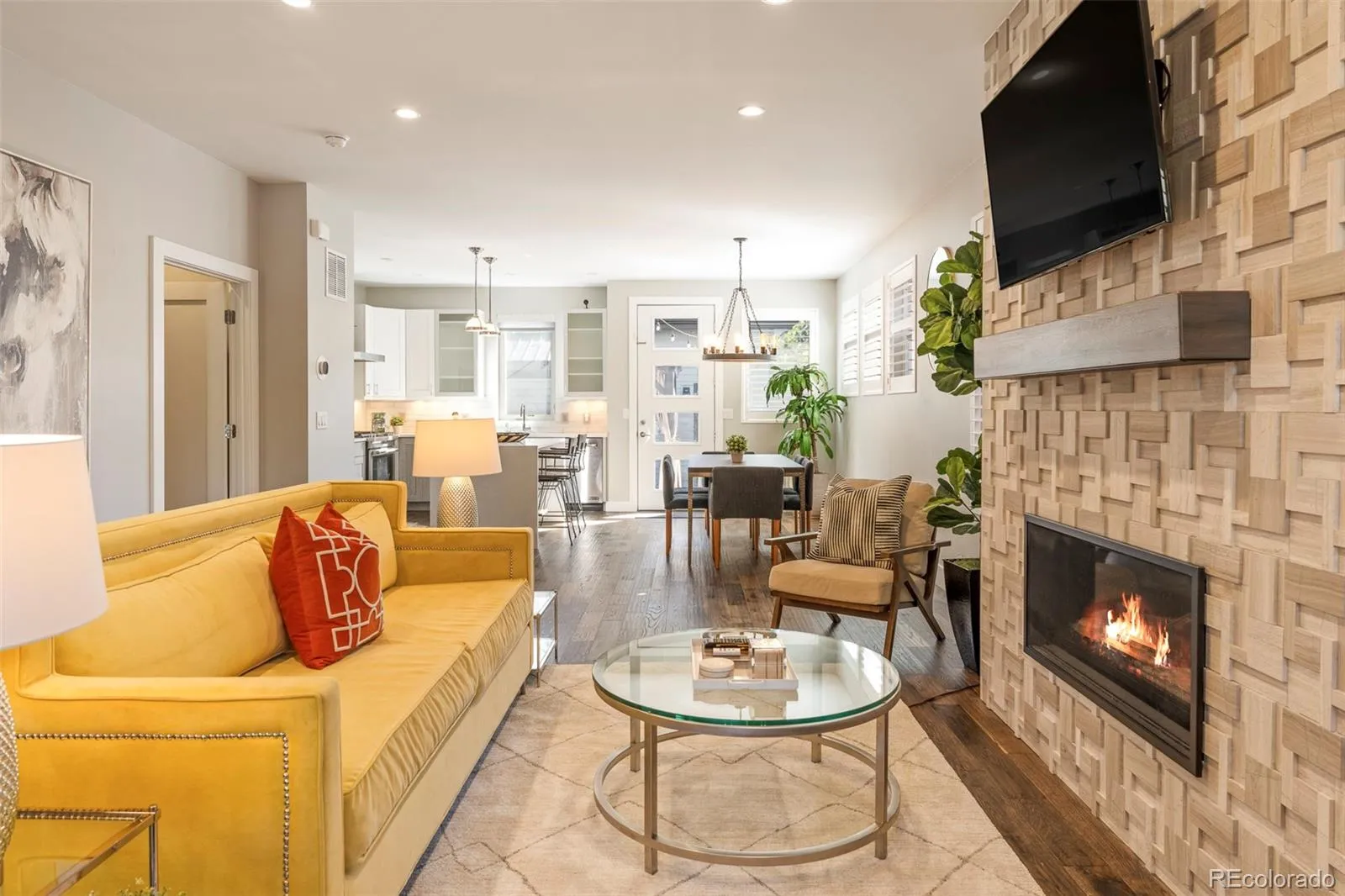 Sleek sophistication melds with curated comfort in this modern Mayfair duplex. An open-concept main level welcomes residents with a spacious living area centered around a natural stone fireplace and a chic dining space poised beneath a contemporary chandelier. The kitchen boasts a large center island and stainless steel appliances. Upstairs, the primary suite offers a private balcony, custom walk-in closet with built-ins and a spa-like bath with a double vanity and a walk-in shower. The third-floor flex space with a beverage bar and refrigerator flows seamlessly to a rooftop deck complete with a cozy fireplace — ideal for entertaining or relaxation. A finished basement adds another layer of livability with a wet bar and guest accommodations. Enjoy evenings in the private backyard with a deck and hot tub, or unwind on the covered front patio. Additional upgrades include classic shutters and a home security system. A coveted location offers proximity to shopping, dining and parks.