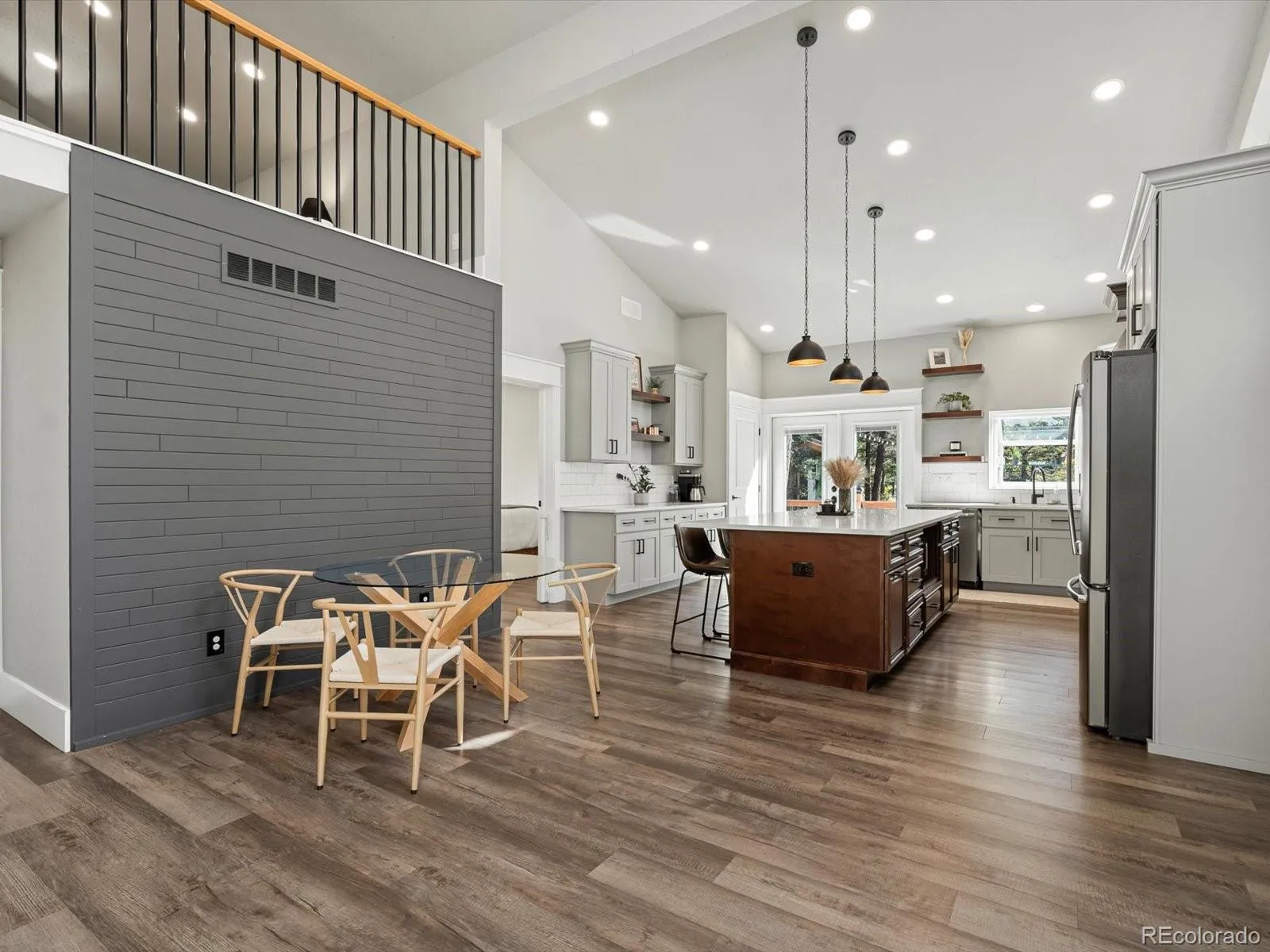 Tucked among the pines of Kings Valley, this modern mountain chic home perfectly balances style, comfort, and Colorado mountain living. Step inside to vaulted ceilings, designer lighting, and durable LVP flooring that flows through the open concept living, dining, and kitchen spaces—ideal for gathering and entertaining. The chef’s kitchen is a true centerpiece with a quartz island, all GE Monogram stainless steel appliances including a dual-fuel range with pot filler and Vent-A-Hood, soft-close cabinetry, and a pantry.