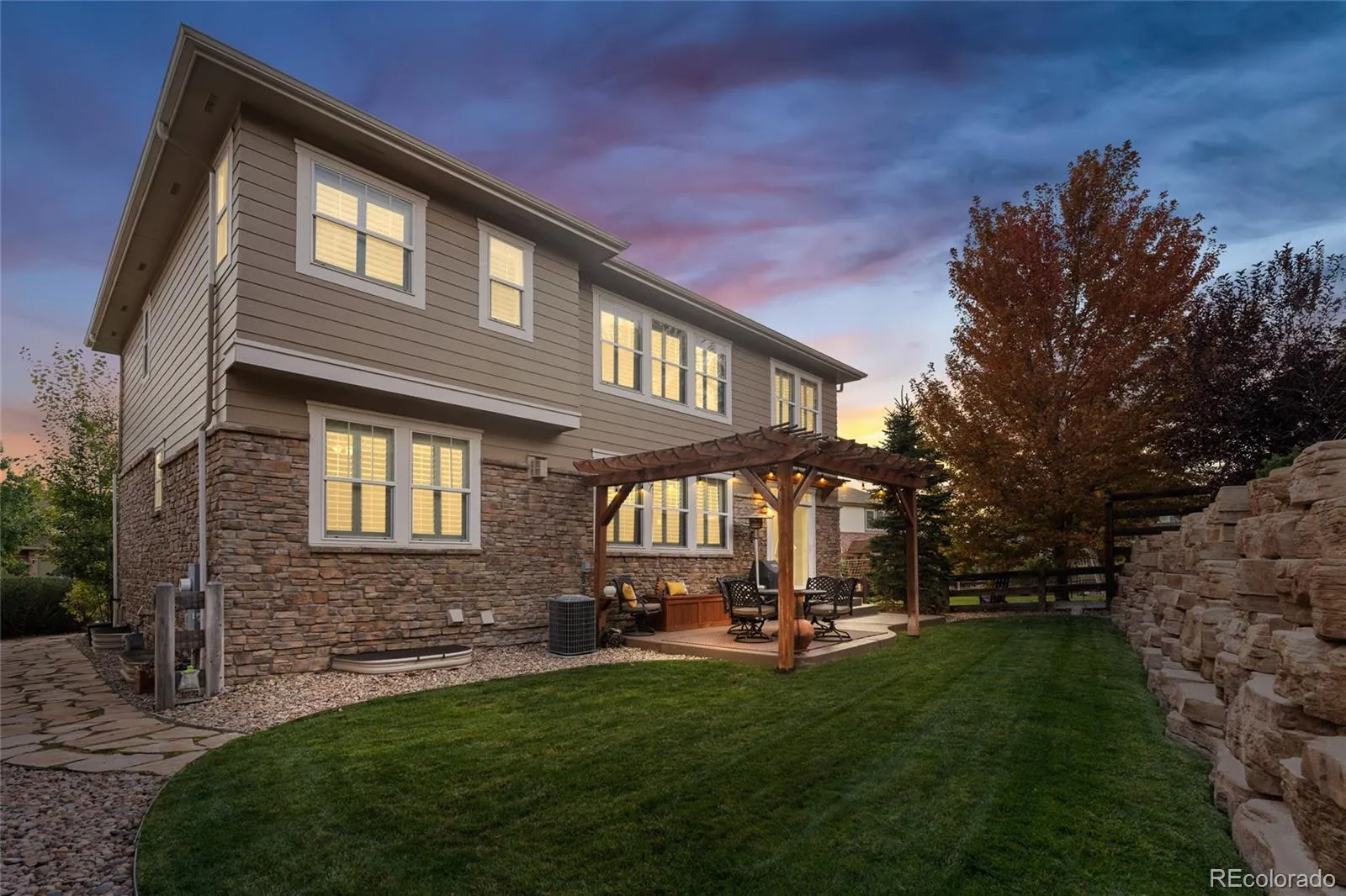 Step outside to a professionally landscaped backyard with a patio and pergola—a perfect setting for relaxing or entertaining.