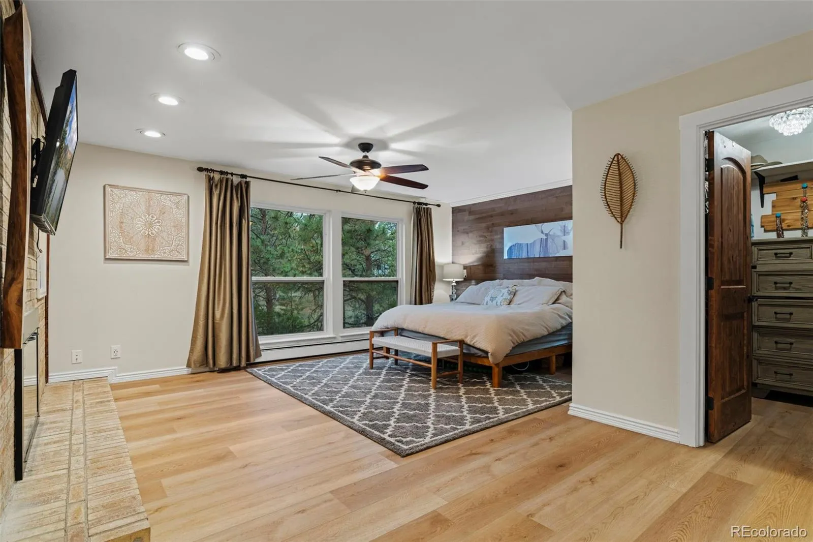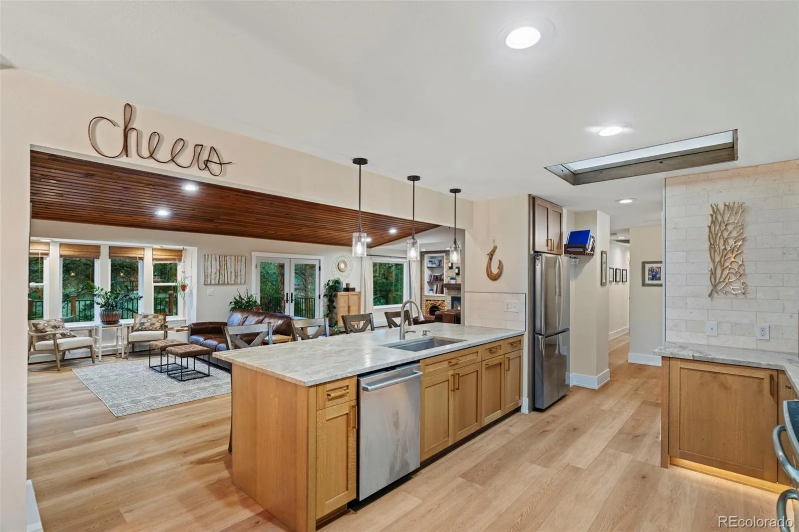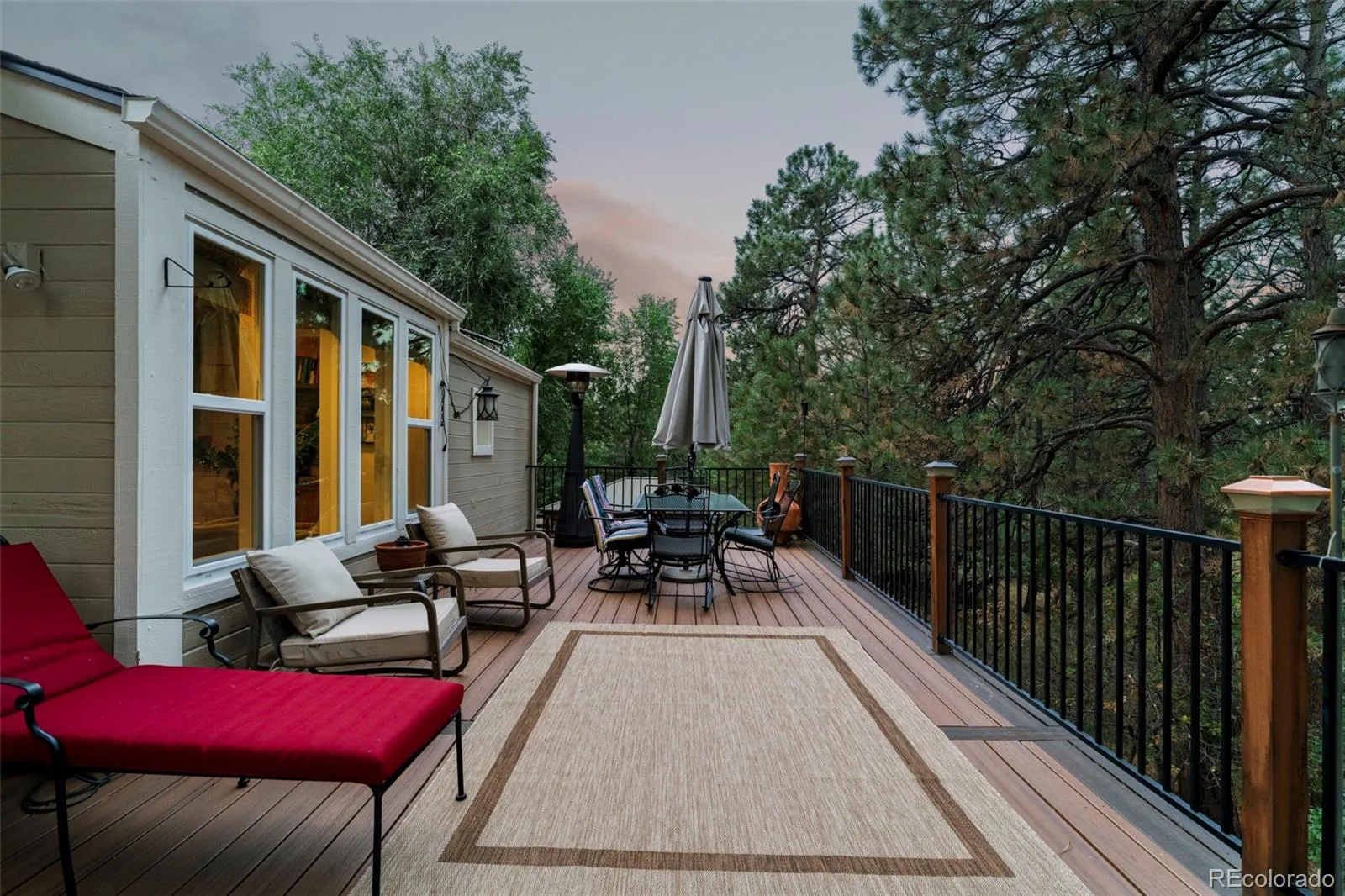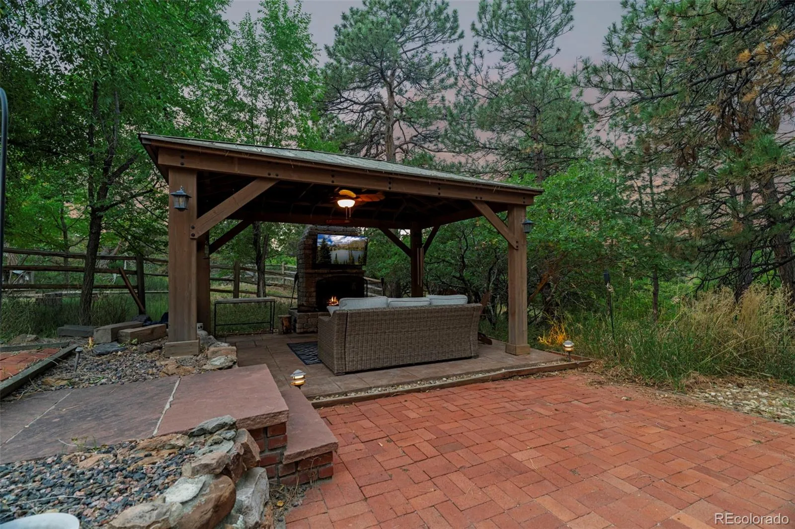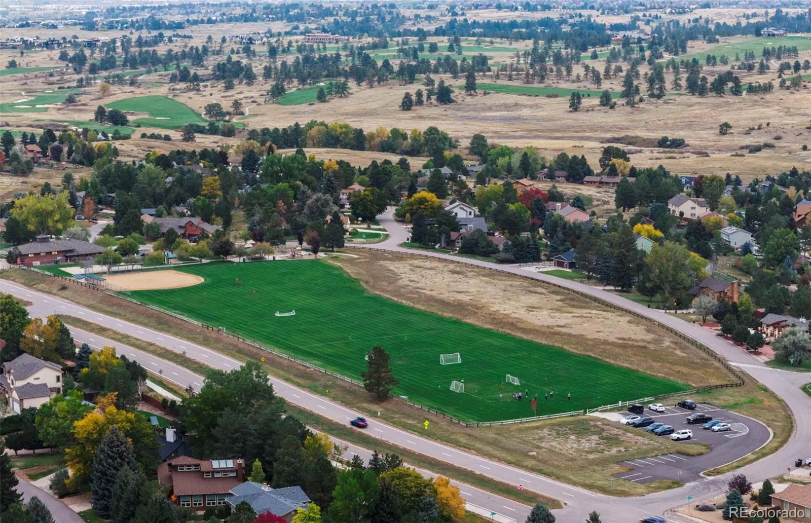 Experience refined living in this beautifully updated ranch home with a fully finished walkout basement, ideally located on a private cul-de-sac in The Pinery. Set on nearly half an acre, this 4-bedroom, 4-bath residence offers 4,363 total square feet of thoughtfully designed living space. The light-filled great room impresses with vaulted plank ceilings, wide-plank flooring, and a dual-sided wood-burning fireplace with stacked-stone surround. The two-story sunroom—with an indoor hot tub and outdoor access—invites year-round relaxation. The gourmet kitchen features leathered granite counters, a massive island, 42” cabinetry with under-cabinet lighting, a skylight, and a breakfast nook. The private primary suite boasts a slatted accent wall, two-sided fireplace, dual walk-in closets, and a spa-style bath with dual shower heads and seamless glass enclosure. The finished walkout basement adds exceptional versatility with a large recreation room, wood-burning stove, private guest suite, ¾ bath, and a spacious bonus room with exterior access—plus abundant storage throughout. Outdoor living shines with a 31’ x 14’ composite deck, lower-level covered patio, gazebo with wood-burning fireplace and TV, and a beautifully landscaped yard surrounded by mature trees. Additional highlights include a two-car garage, mudroom with built-ins, and fenced RV/boat parking. Just minutes from The Pinery Country Club, award-winning schools, shopping, and dining—this home perfectly blends privacy, functionality, and timeless Colorado charm.
