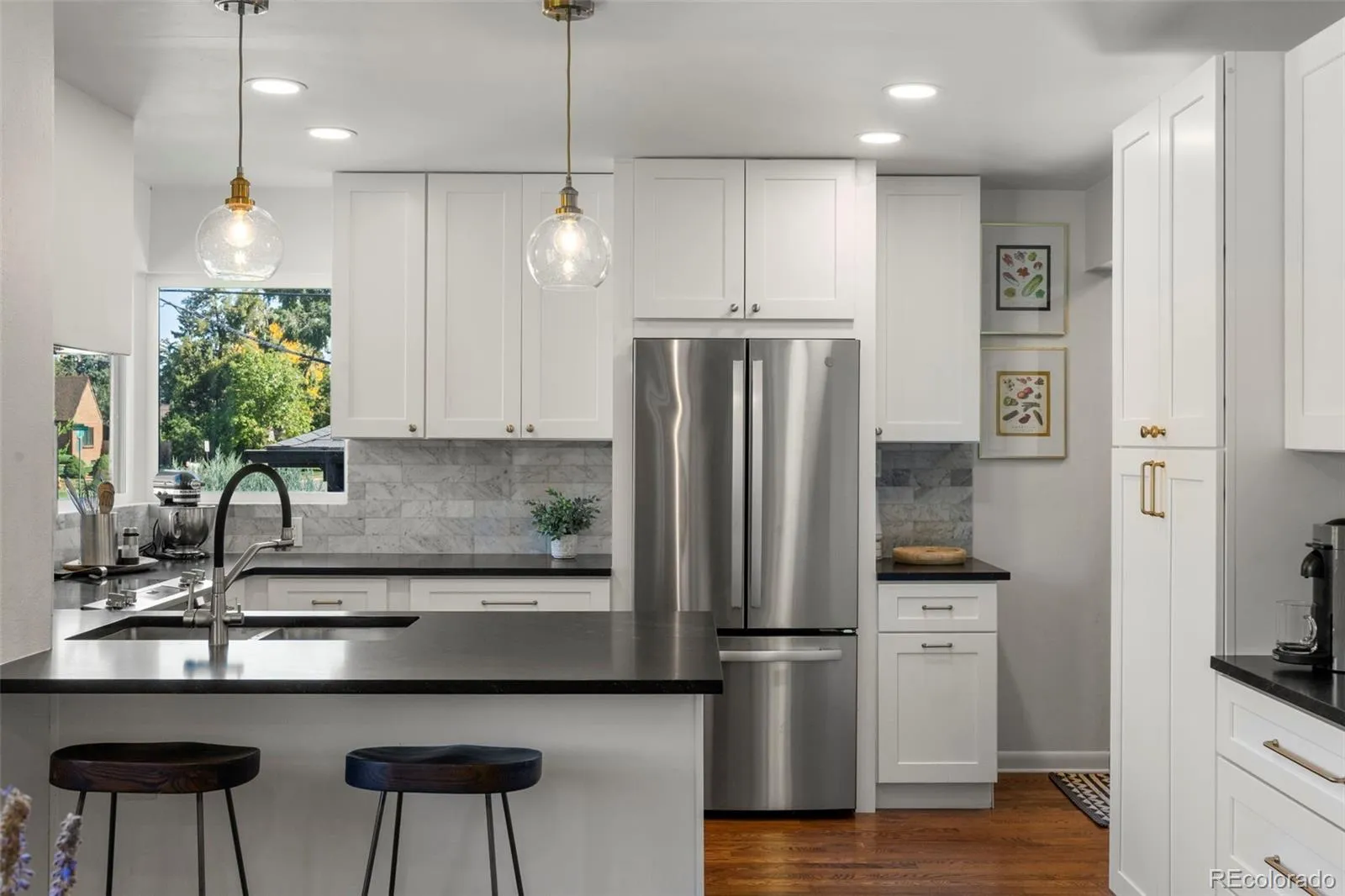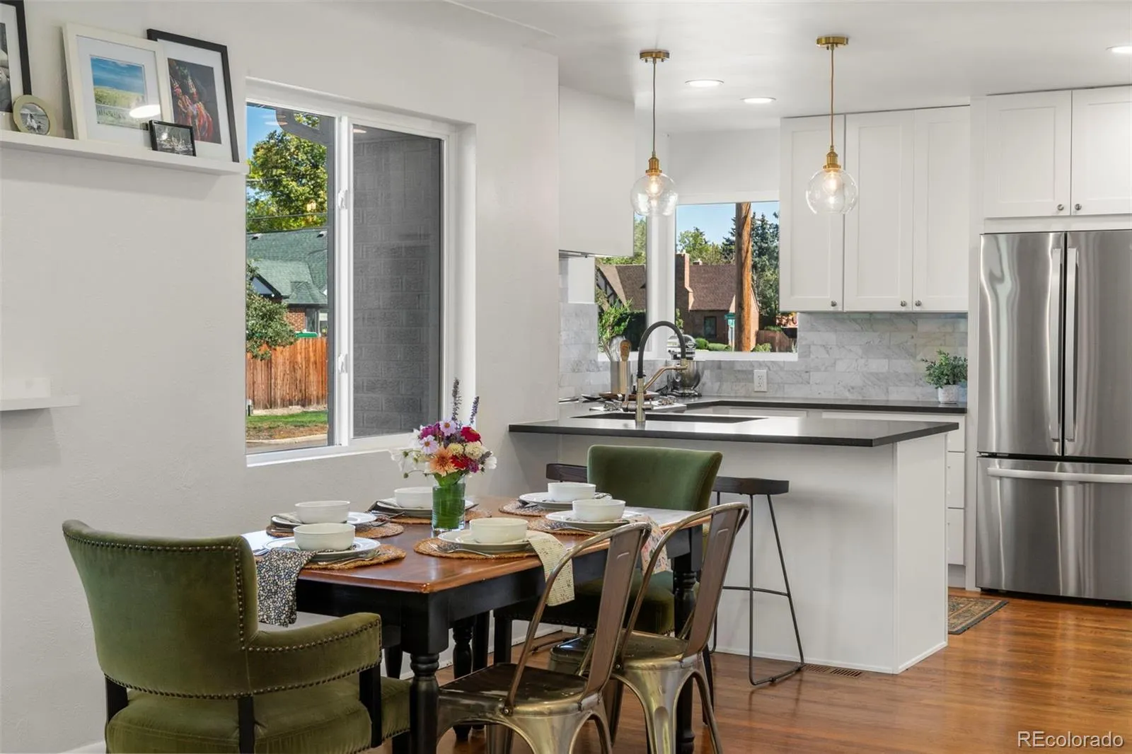Classic mid-century character meets modern comfort in this Park Hill home, where every detail has been lovingly & thoughtfully updated. Step inside and you immediately feel how well the spaces connect. The kitchen, fully reimagined with abundant storage, a built-in coffee bar, a sunny corner window, and an eat-in breakfast counter, opens seamlessly to the dining area & living room. The result is a main floor that feels bright, flowing, and made for both easy mornings & lively gatherings.