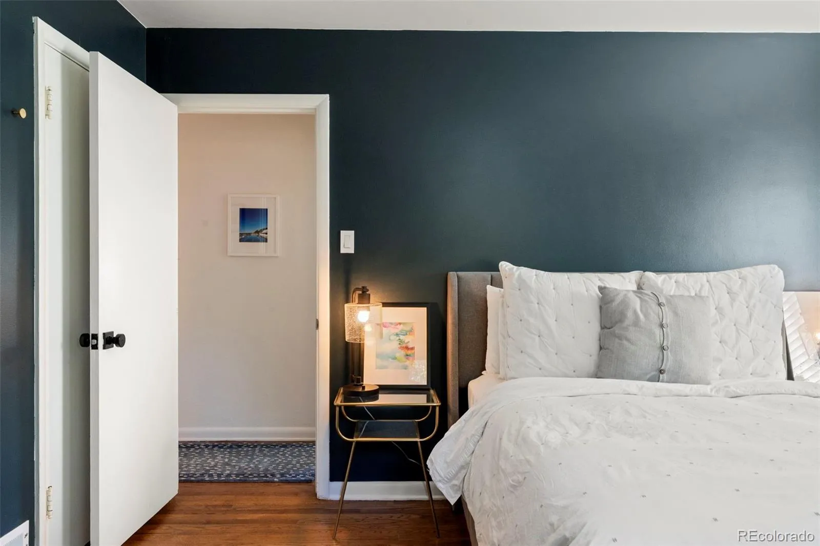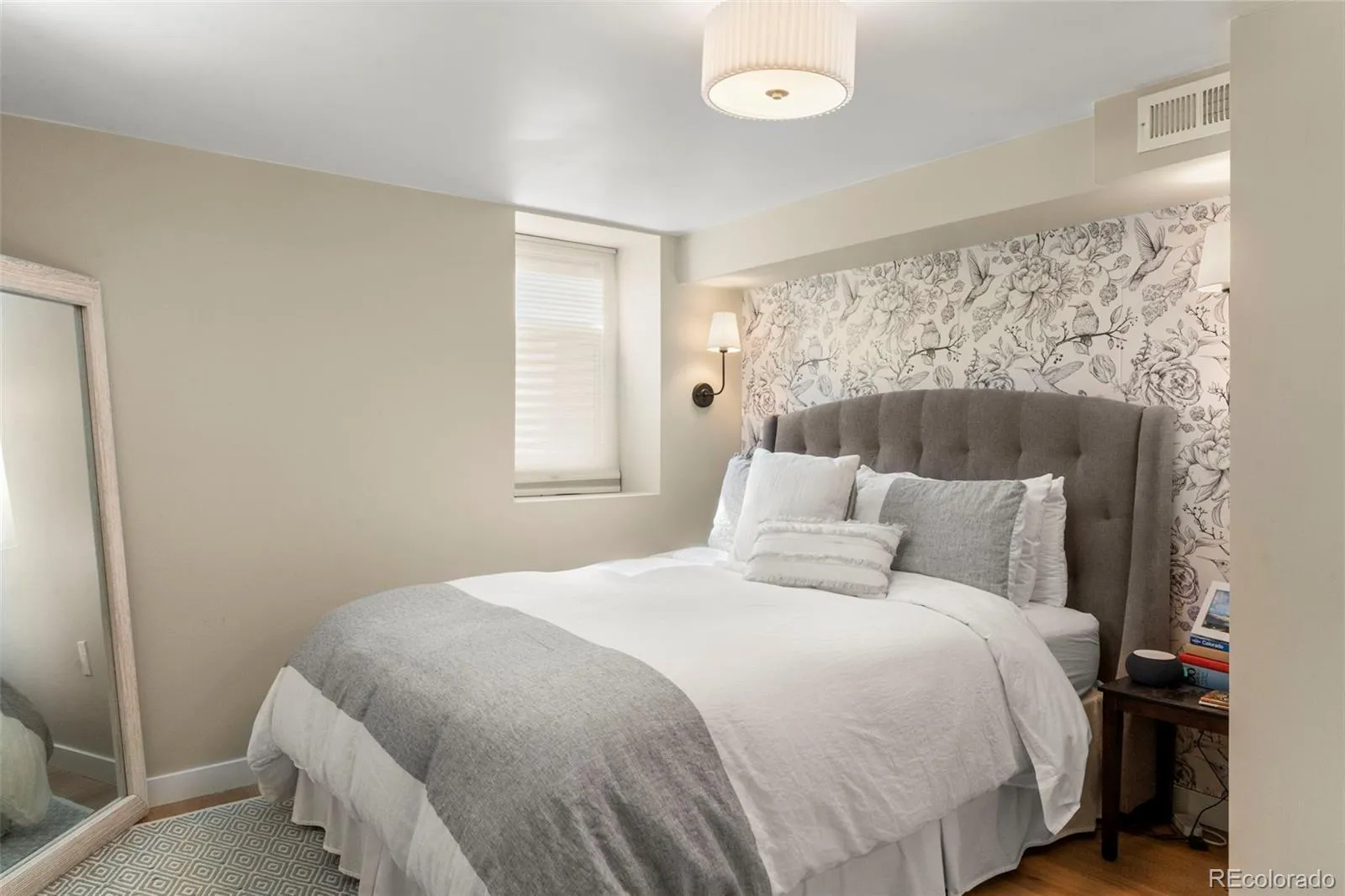Upstairs, sunlight fills two bedrooms and a full bath with original mid-century tile. The moody primary bedroom is spacious enough to easily fit your king-size bed, & both bedrooms feel especially airy thanks to the home’s natural light.