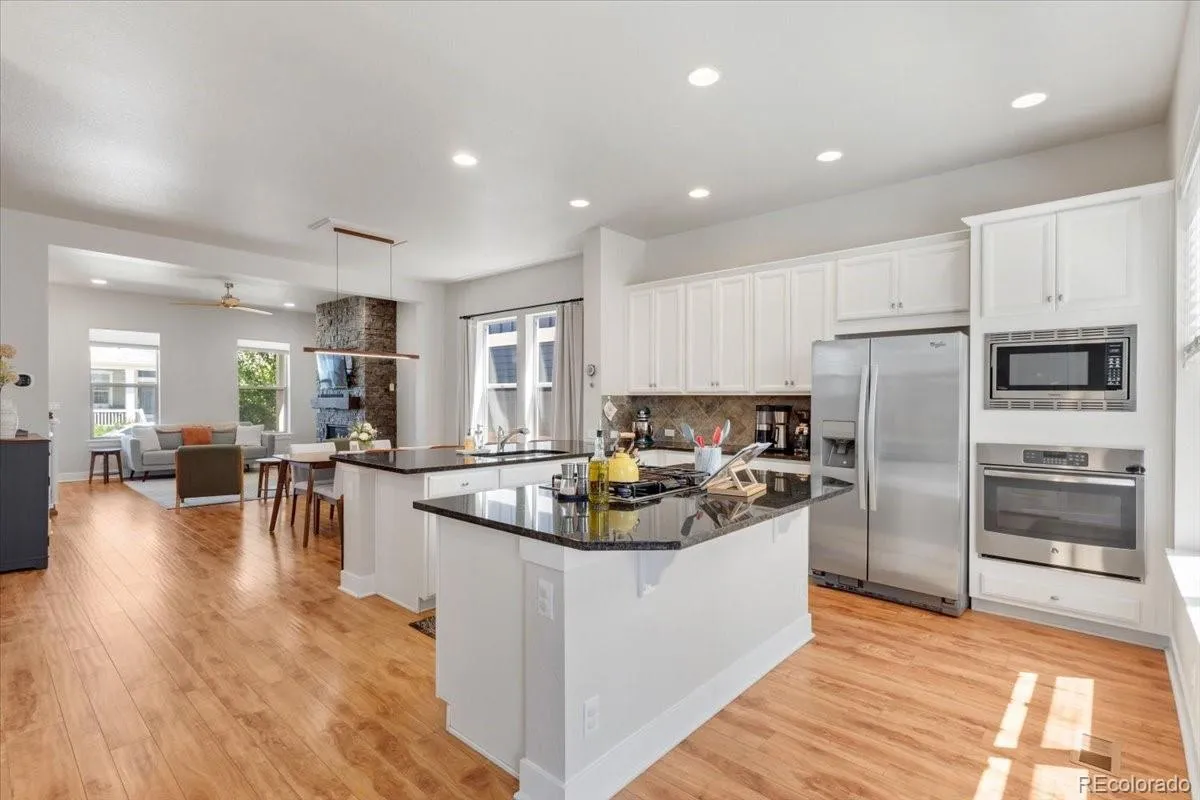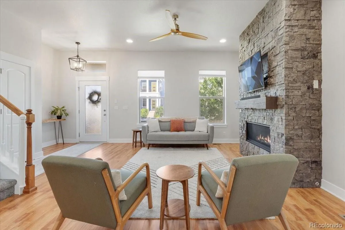 Join the Central Park community with this exquisite, updated two-story home. Conveniently located near shops, a Nature Preserve and highly-rated Elementary School, yet tucked away on a peaceful street. This updated single-family home offers the space and privacy of a standalone residence—without the endless upkeep as quality finishes were used with thoughtful updates. Tall ceilings and large windows makes every space welcoming, while the floorplan makes entertaining and every day life easy. Once inside, you’ll immediately notice the inviting flow between the living, dining, and kitchen spaces—ideal for both quiet nights in and lively gatherings. The home was freshly painted and new carpet in late 2023, giving the home a bright, clean foundation for your personal style. The kitchen’s granite counters and stainless steel appliances make for a timeless space while the peninsula seating and an island provide space for entertaining and food prep. Updated lighting warms the space. The entire main level features solid wood floors. A cozy gas fireplace with stone surround and wood mantel adds both comfort and style. Outside, a newly added deck (2024) transforms the low-maintenance backyard into a private haven—perfect for morning coffee, quiet reading or weekend parties without the upkeep and tiring yardwork. Upstairs, the primary suite offers a relaxing retreat with a five-piece bath and large walk-in closet. Two additional bedrooms and a loft provide flexibility for guests, office space or hobbies. The recently finished basement adds room for guests and daily living with a large rec/media room, bedroom and beautifully updated bathroom with shower. With a new roof (2023) and updated fixtures in key spaces, this home blends the confidence of modern updates with the charm of an established area. You’re moments from trails, parks and the A-Line train station—making commutes downtown or to the airport a breeze. This community embodies inclusion, gathering and recreation.