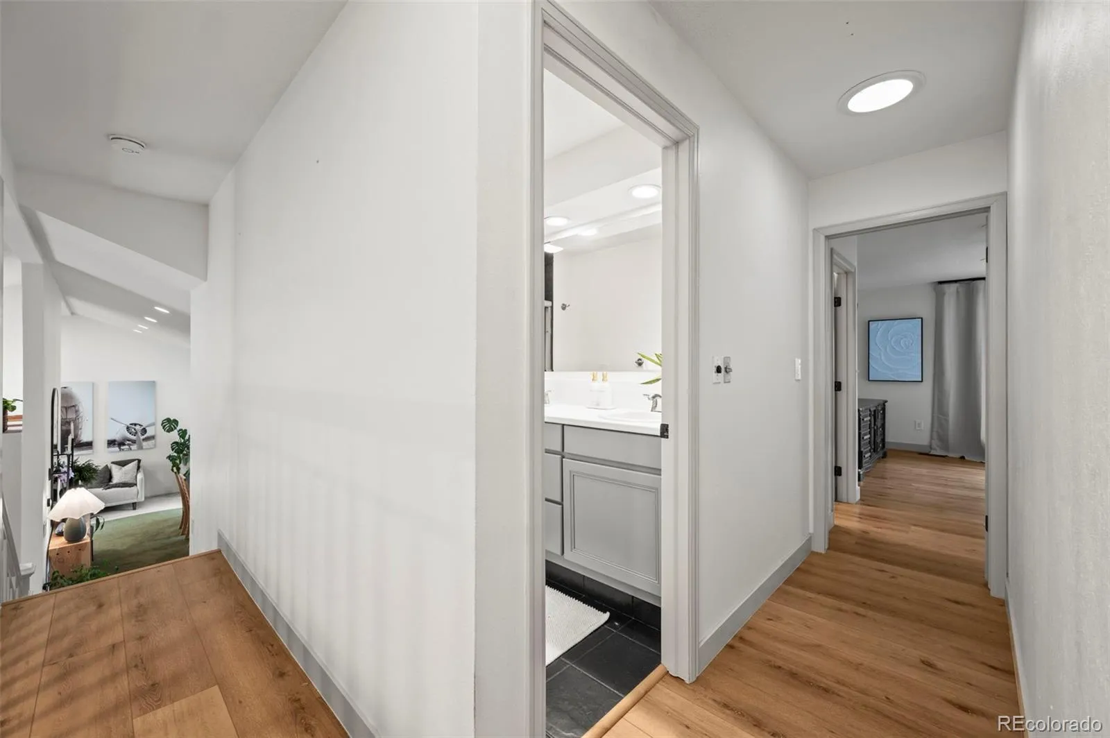 The primary suite is generously sized, featuring a spa-inspired bathroom with a luxury shower complete with body sprays and hand wand, double vanity with lighted mirrors, and a large custom closet with built-ins . A secondary bedroom with a full hall bath completes this level, with new flooring continuing throughout this level.