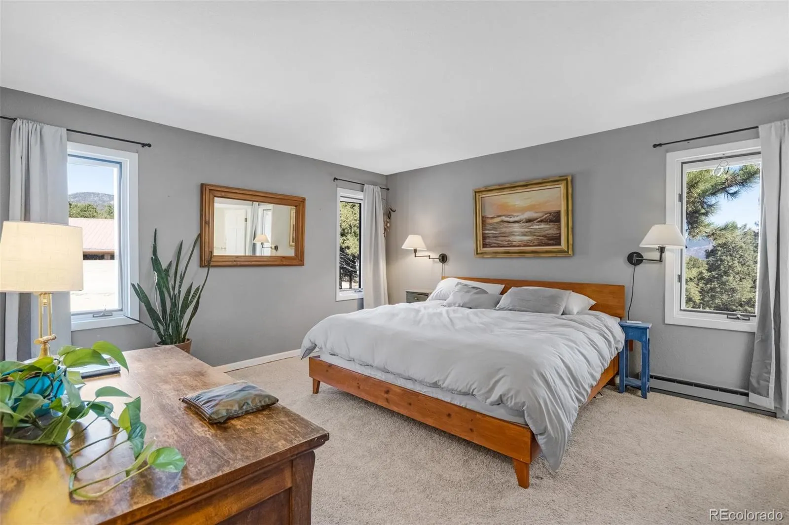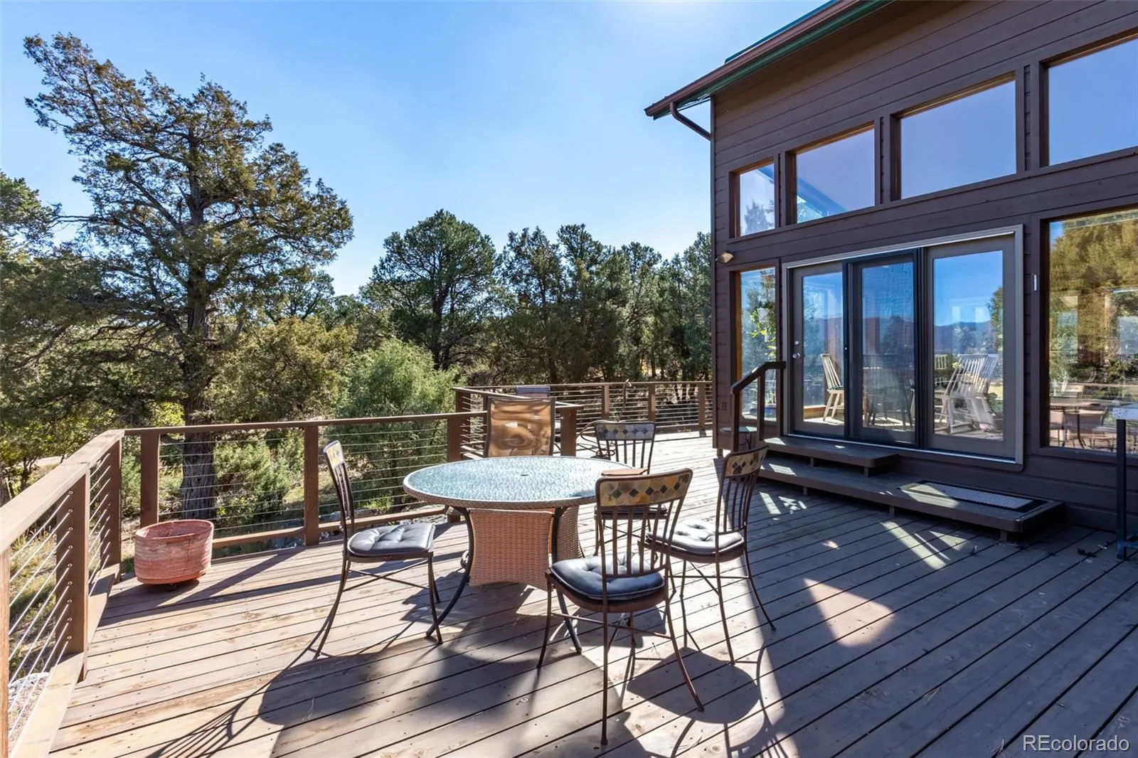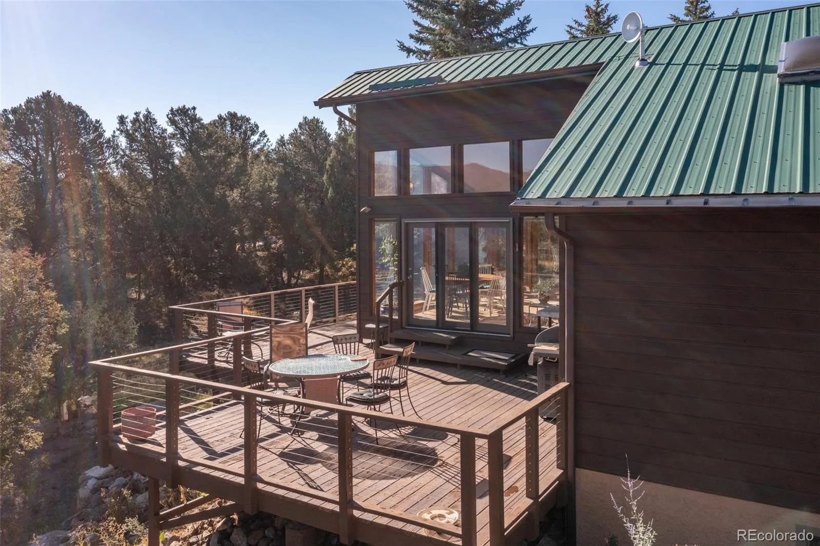 Quiet and secluded, yet with easy access to the town of Salida and the Arkansas River, this mountain home makes an ideal year-round or seasonal residence. The main level kitchen opens onto a spacious living / family room with a wood burning stove for winter ambience. Large windows let in ample natural light, as does the airy neighboring sunroom which in turn opens on to a large sunny deck and patio with mountain and valley views. The main level also features a primary suite, laundry, second bedroom and full bathroom. Downstairs the walk-out basement has a large family room with a small kitchenette, an additional large bedroom, a full bathroom, bonus room for office, crafts, or guest overflow, utility room and ample storage. This lower level has potential to turn into a lock out / in-law apartment. The property also boasts an oversized 896 sq ft two car detached garage and an additional storage shed.