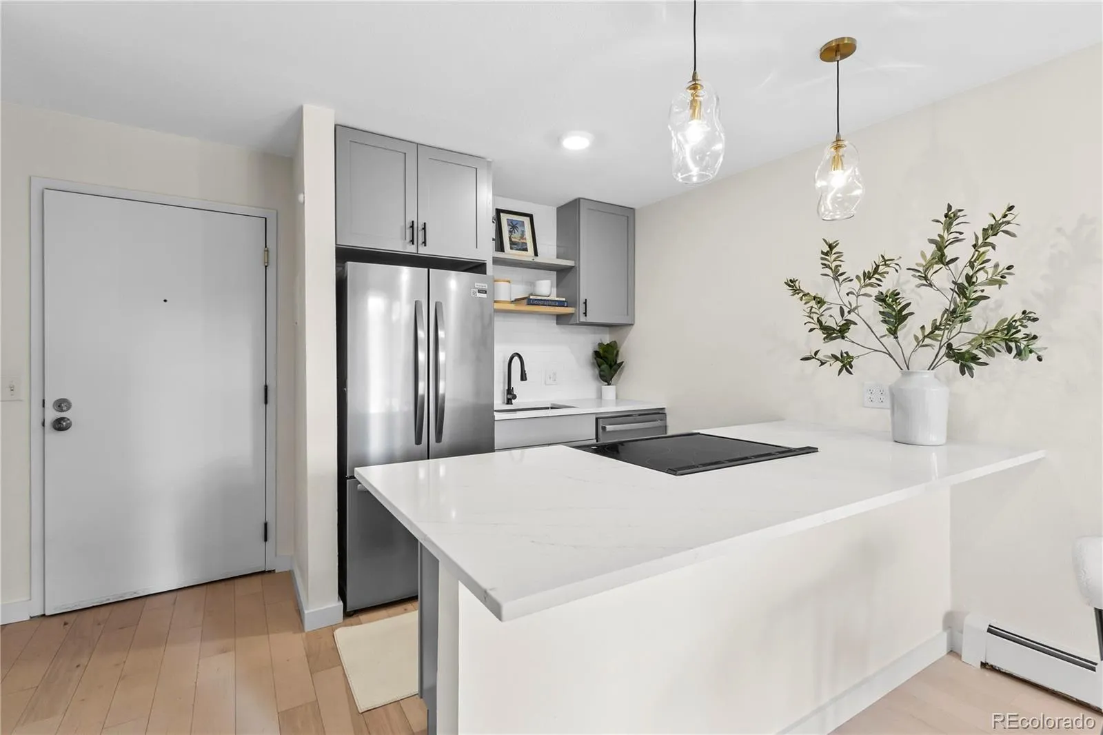 Beautifully Renovated Central Boulder Condo with Modern Finishes & Pool Views! Welcome to this bright, open-concept home that blends modern design with comfort. Recently renovated, this stylish unit features sleek quartz slab countertops, stainless steel appliances, and contemporary gray shaker cabinets that elevate the kitchen’s appeal. The full remodel shows with clean lines and a fresh, updated feel throughout the home. Enjoy the natural light flooding through large sliding glass doors, leading to your private balcony overlooking the sparkling pool—perfect for relaxing or entertaining guests. The home features 1.5 tastefully updated bathrooms with classic subway tile, floating shelves, and modern fixtures. Cozy up by the real wood-burning fireplace on cooler nights, and appreciate the warmth and character of the hardwood flooring that runs throughout the living space. This move-in ready home offers stylish lighting, functional layout, and thoughtful touches throughout. Don’t miss your chance to own this beautifully updated retreat! Grounds include pool, club house, a fire pit and garden plots!