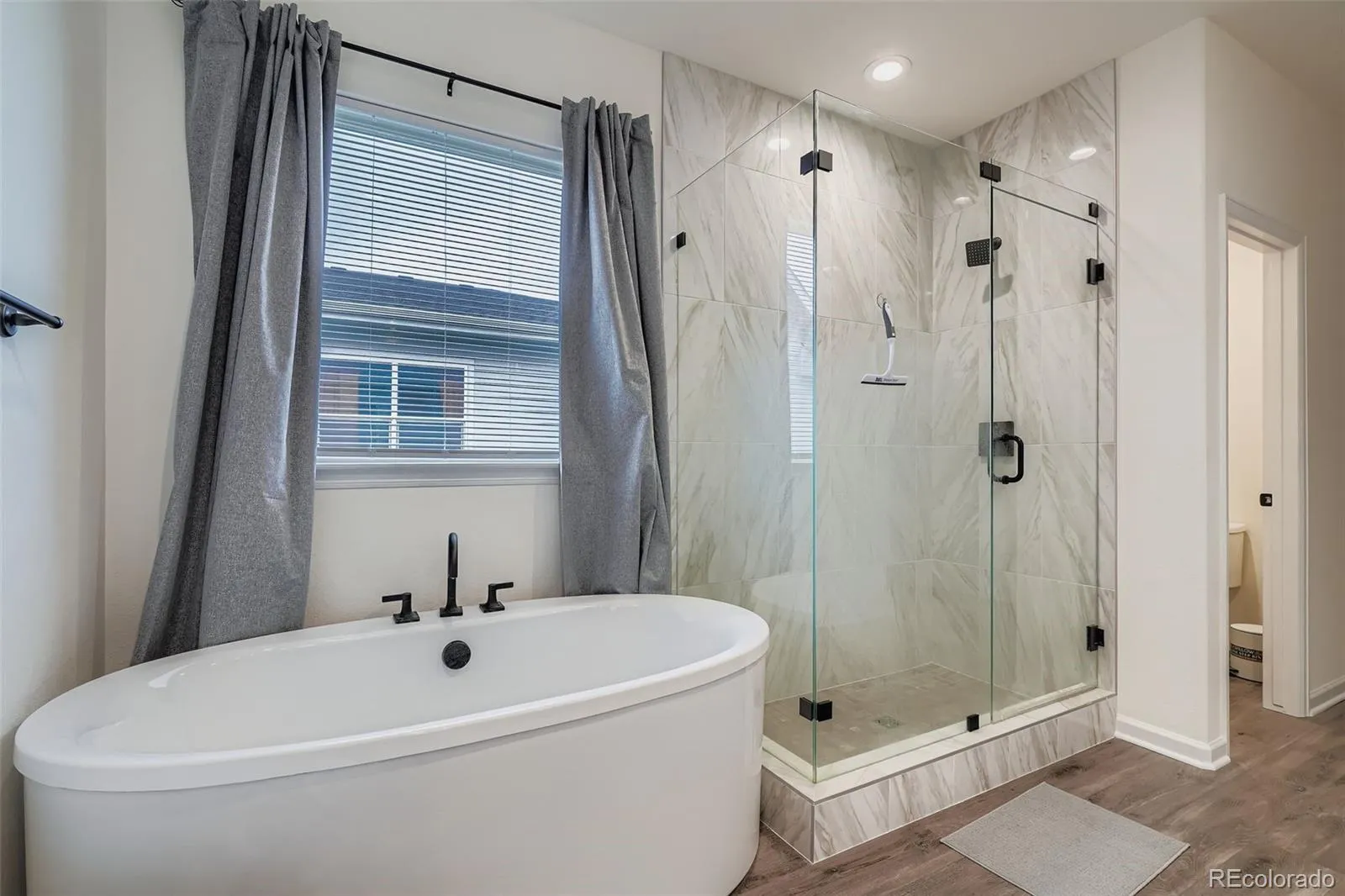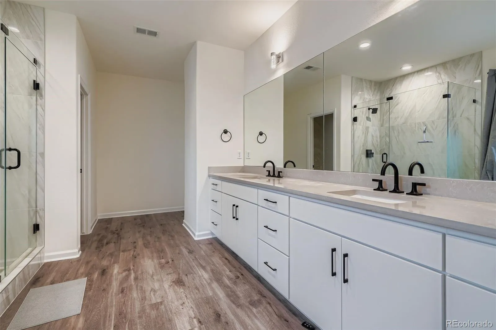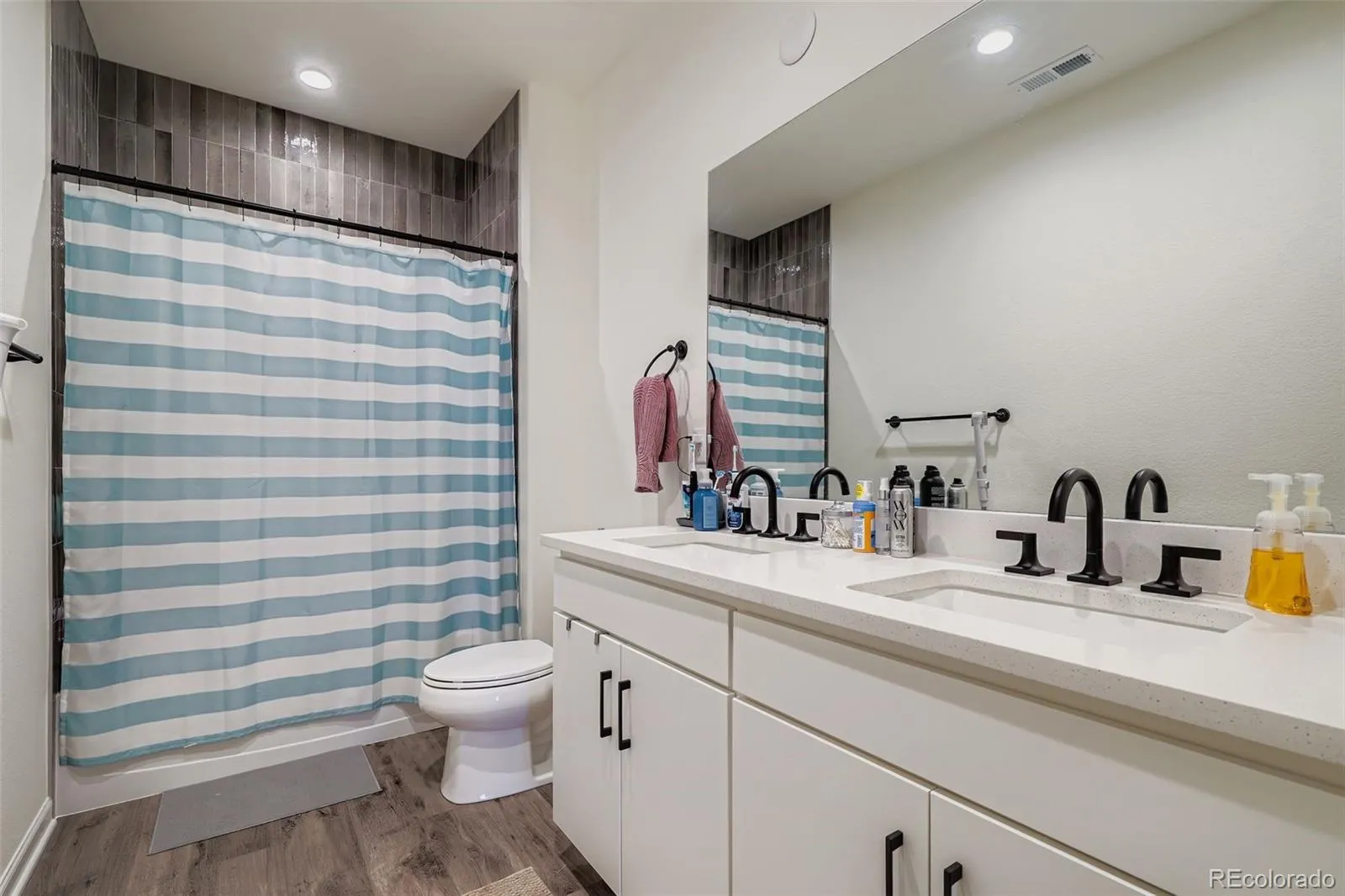 The elegant Carmen floor plan welcomes you with a private office just off the entryway and a seamless flow into a formal dining area, an expansive great room, and a bright kitchen with a casual dining nook. The great room impresses with 19-foot ceilings, a gas fireplace accented by light marble-style stacked stone and a rich wood mantel. A 12-foot sliding glass door opens to a covered patio—perfect for relaxing or entertaining outdoors. Durable, stylish waterproof core flooring runs throughout the main level, tying the spaces together beautifully. The gourmet kitchen showcases premium stainless-steel Whirlpool appliances, including a 36-inch gas cooktop, upgraded White Icing cabinetry with matte black hardware, a modern pearl-tile backsplash, and a large quartz island that offers extra prep and storage space. Upstairs, a spacious loft with wrought-iron railing overlooks the great room, while the primary suite features generous windows for natural light. The spa-inspired ensuite includes a soaking tub, frameless glass shower with pebble mosaic tile, private water closet, and an expansive walk-in closet. Additional bedrooms are well-sized with large closets, and the laundry room is conveniently located on the same floor. Professionally curated designer finishes elevate every corner of this beautiful home. Become part of North Hill, Thornton’s sought-after community featuring resort-style amenities—including a clubhouse, zero-entry pool, hot tub, fitness center, scenic trails, and a 9-acre park with basketball courts. *All furniture negotiable.