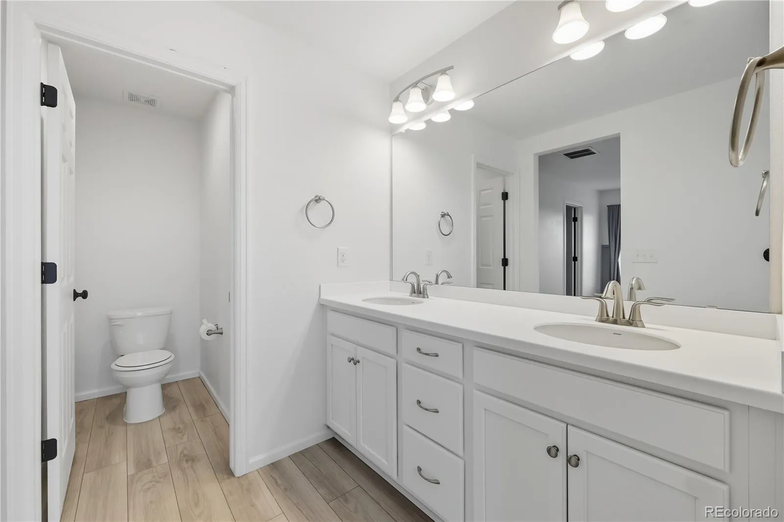 This beautiful three bedroom, three bathroom home enters to an open floor plan with amazing natural light and hardwood floors on the main level. The kitchen features stainless steel appliances, a pantry, granite countertops, a kitchen island and a new coffee bar to start your mornings. The connected living room and dining area provides plenty of space that is perfect for hosting friends or family. Upstairs you’ll find a loft that makes for a great entertainment space, movie room, or play area. Its the perfect bonus flex space! The large primary bedroom fits a king sized bed with an attached walk-in closet and en suite bathroom featuring a double vanity and shower. Down the hallway you’ll find two large secondary bedrooms with oversized closets, a full bathroom, and a separate laundry room. The interior of the home has been fully repainted and includes new shiplap and board and batten walls. The stunning backyard includes a covered porch and a two-level stamped patio that is ideal for a backyard summer barbecue. The backyard has been upgraded with a new sprinkler system, retaining wall, and concrete walkway around the home. The roof was fully replaced with impact resistant shingles in 2023 and has fully paid off solar panels that significantly reduce utility costs! This home is right next to community trails that connect to miles of walking space in Founder Village with just a short walk to Founders Park. Come see your new home today!