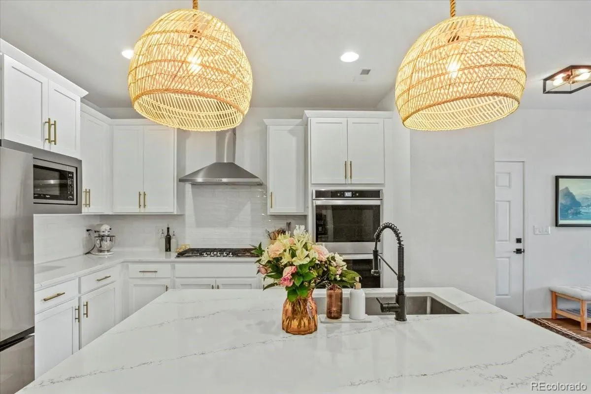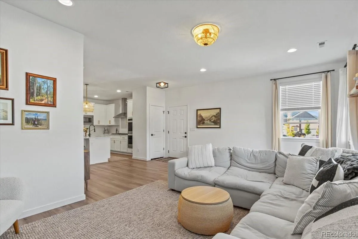 The open concept kitchen and living area serve as the heart of the home. The kitchen is designed for both everyday living and entertaining, featuring stainless steel appliances, quartz countertops, a large center island, and ample cabinetry. Natural light fills the living space and flows seamlessly to the outdoor area, perfect for enjoying Colorado sunsets and entertaining guests.