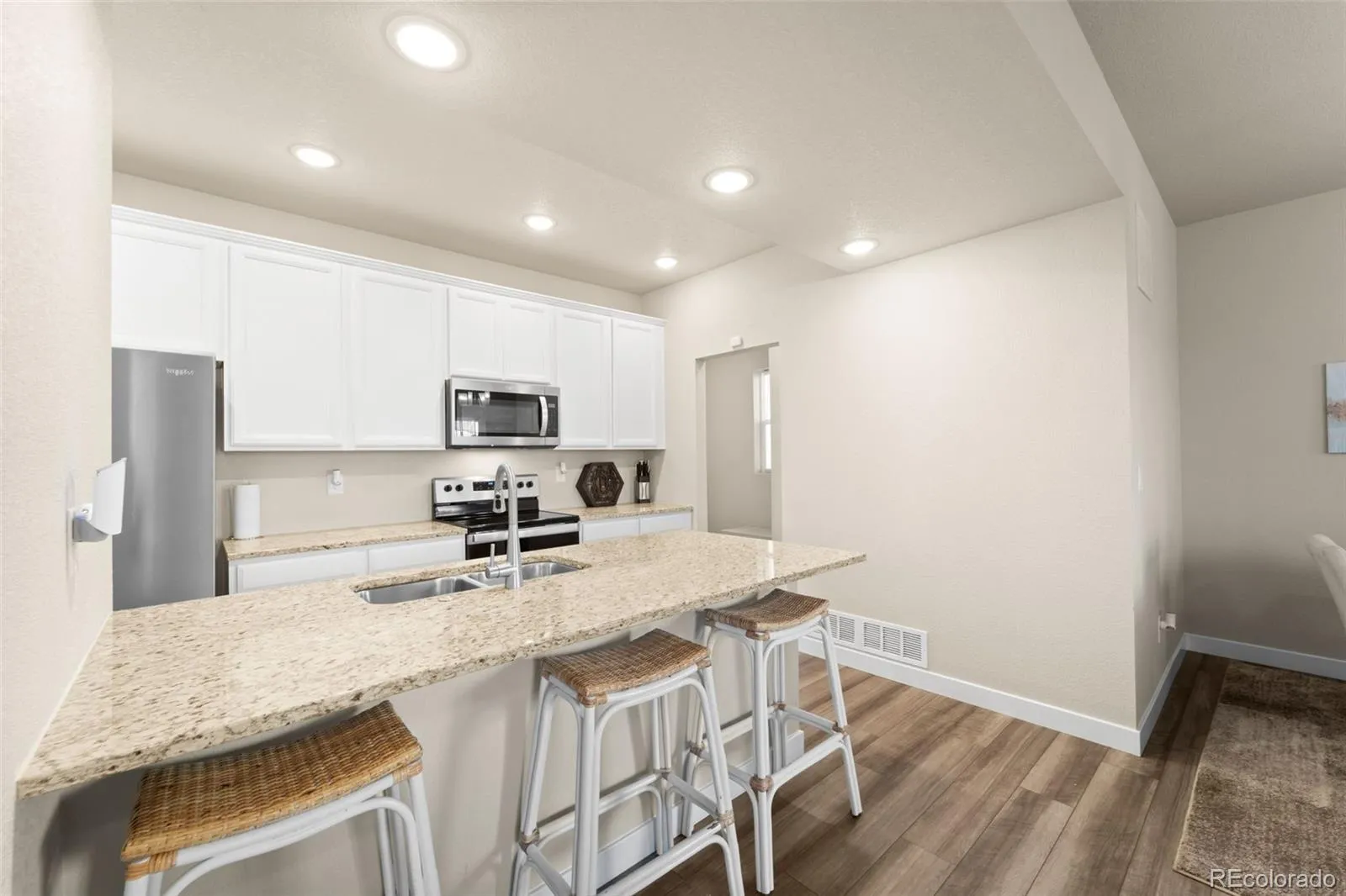 The open floor plan flows perfectly from the kitchen to the dining and living areas, creating a warm and inviting space for gatherings or quiet nights in.