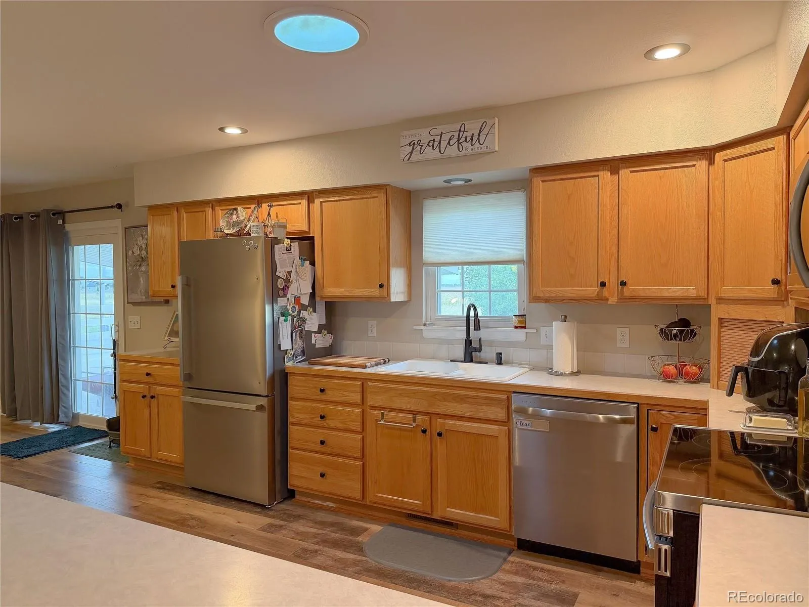 The large kitchen features warm oak cabinetry, recessed lighting, and a skylight that fills the space with sunshine. A cozy breakfast nook opens onto the covered back patio, where you can enjoy peaceful mornings with coffee and quiet views of open farmland — the perfect blend of town convenience and country tranquility.