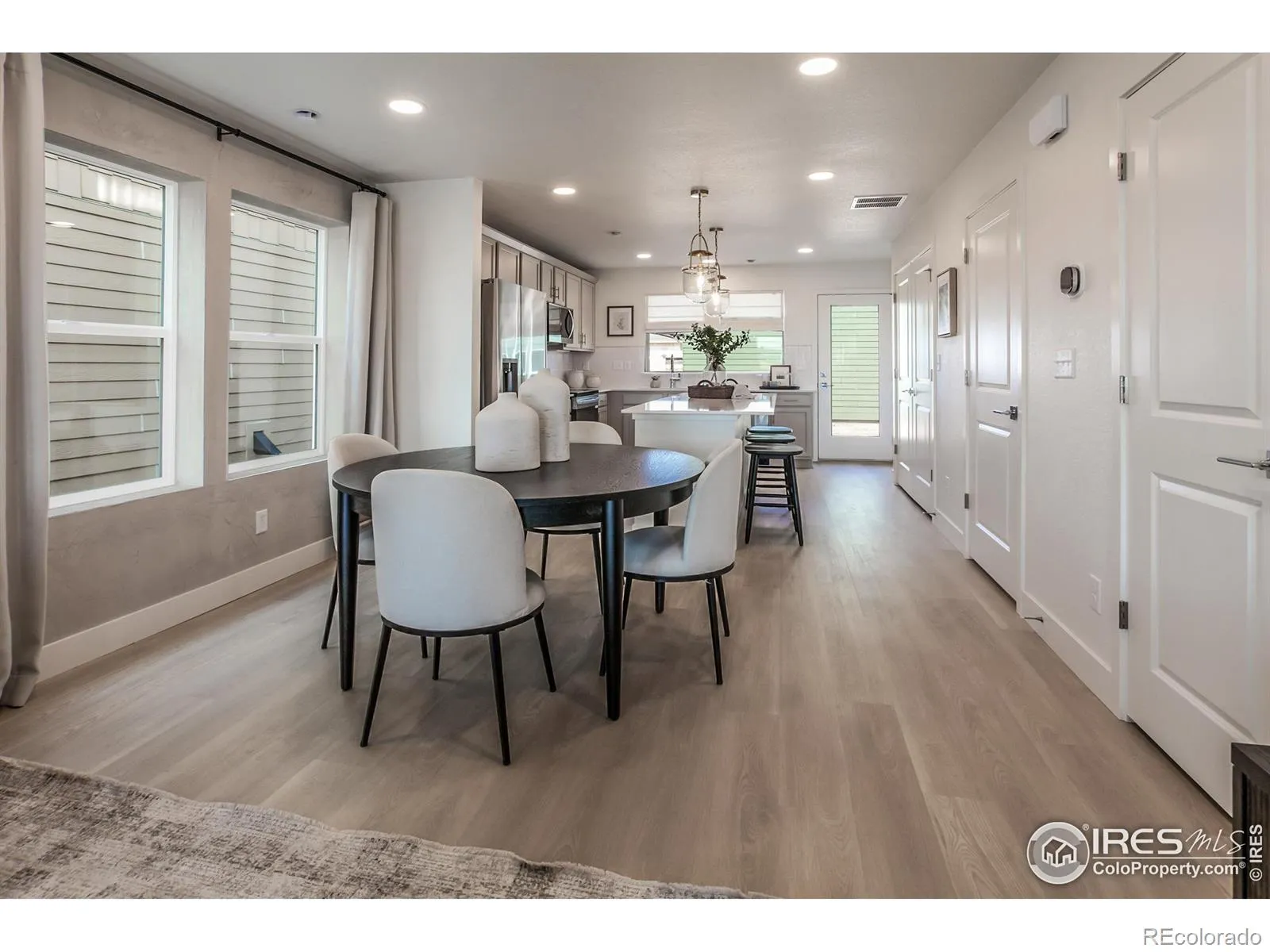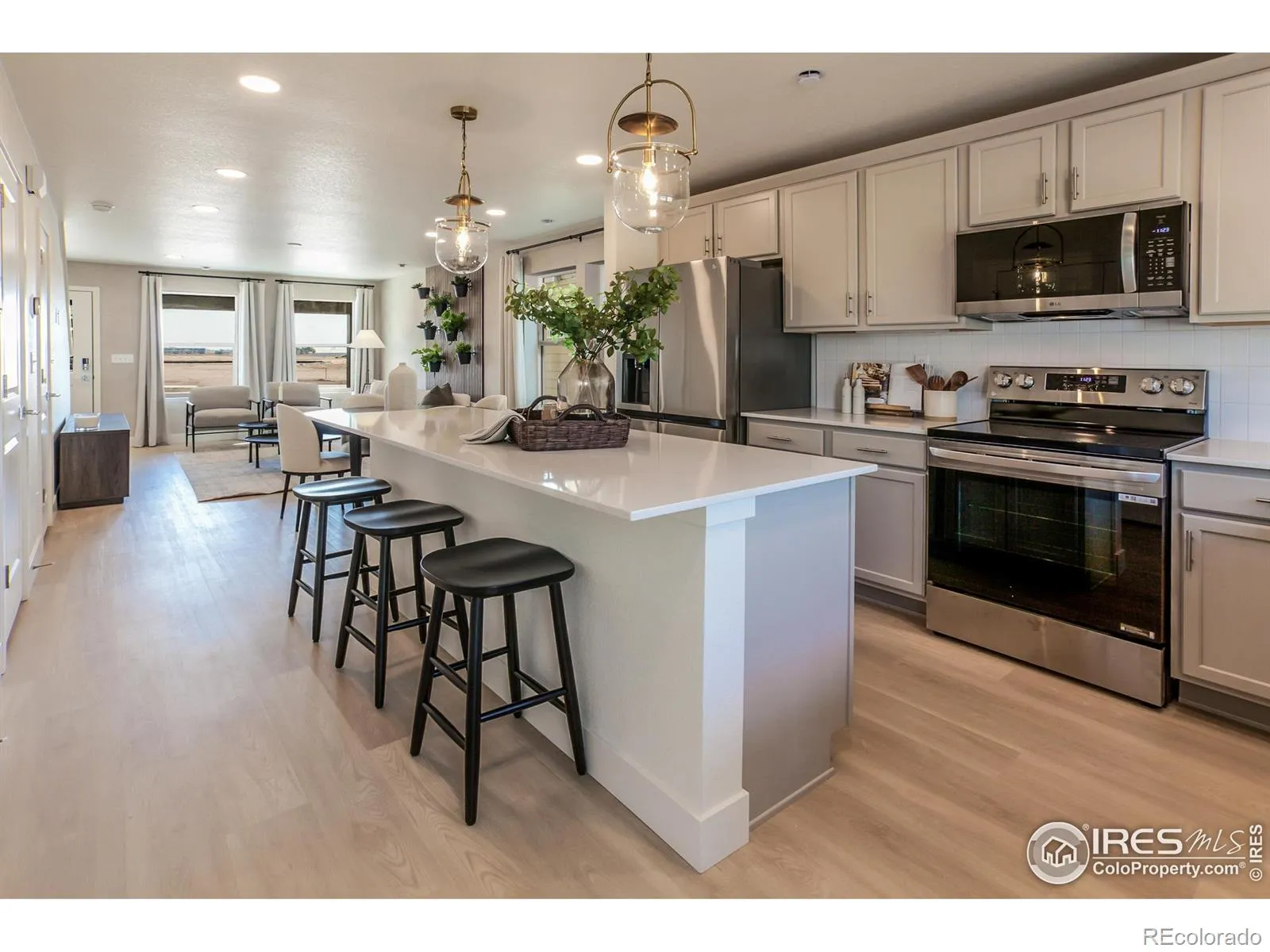 Craftsman elevation Magnolia plan by Hartford Homes in Prairie Song in Windsor. New construction cottage home. Open floor plan, two story. Kitchen w/ island. Powder bath on main level. Eucalyptus painted maple cabinetry. Dekton countertops. Vinyl plank flooring throughout main level and carpet in bedrooms. S.s. dishwasher, fridge, microwave, range. Second level has 2 bedrooms and laundry w/ Washer & dryer included. Central a/c. 2 car garage. Garage door opener and keypad. Passive radon system. Fenced yard w/ landscaping included (artificial turf in backyard). Future community plans for a pool, club house, parks and trails. There is a $415 annual non-potable water fee to be paid to metro district. $125 monthly o & m fee for metro district. PHOTOS FROM PREVIOULSY BUILT HOME AND THEREFORE MAY DEPICT DIFFERENT FINISHES. ASK ABOUT CURRENT LENDER OR CASH BUYER INCENTIVES. Estimated Feb/March