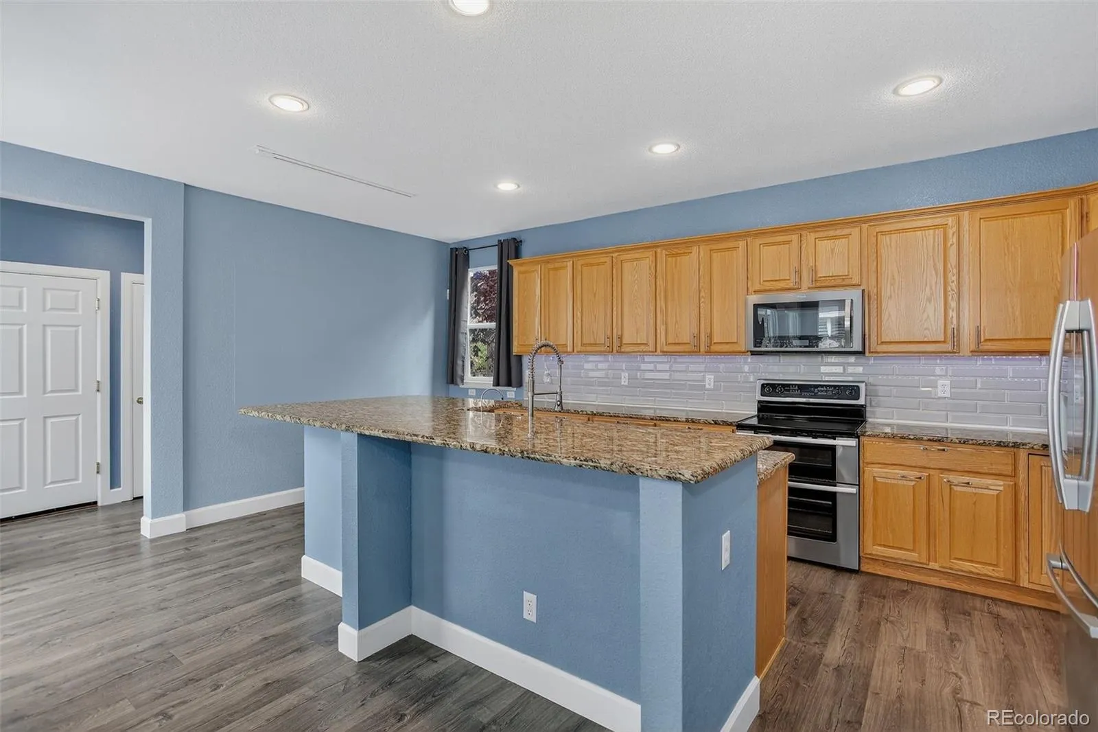 House Hunting? Add this big beauty to your tour and you won’t be disappointed. You will notice the fantastic curb appeal of this beautiful, welcoming property, directly across the street from a neighborhood park! Mature landscaping, privacy and shade, lead you to the peaceful covered front porch. Through the front door be wowed by a beautiful formal dining area that could easily transform into a den or study. Across the foyer enjoy a large flex space perfect for an office or play area. The kitchen and adjoining family area are something to behold. Let the warm, bright, flowing, expanse of this space sink in as you check out the custom granite counters and back splash, stainless appliances, huge kitchen island, the massive amount of cabinet and counter space, and the eat in nook area. The kitchen flows into grand family area with a warm fireplace, huge windows that look into the back patio/yard, and access to the covered ranch style front porch. Retreat to your oasis at home in a gorgeous primary bedroom retreat with another fireplace, coved ceilings, an large ensuite 5 piece bath and his and hers walk in closet. The upstairs bedrooms are large, large, with tons of natural light and room to grow. A second large upstairs bath offers two sinks and a separate shower/toilet area. Wait! there is more, the partially finished basement offers a massive equity builder option, the large garage offers tons of storage space with high ceilings and paved alley access, the large back yard is fully fenced, and is zero maintenance artificial turf. This home is clean! well maintained, ready to go and offers custom paint, lighting, and flooring throughout. All of this with a serene setting, featuring a park across the street, and easy access to a rec center and pool, recreation, schools, restaurants, shopping, entertainment and commerce. Add this property to your showing list!