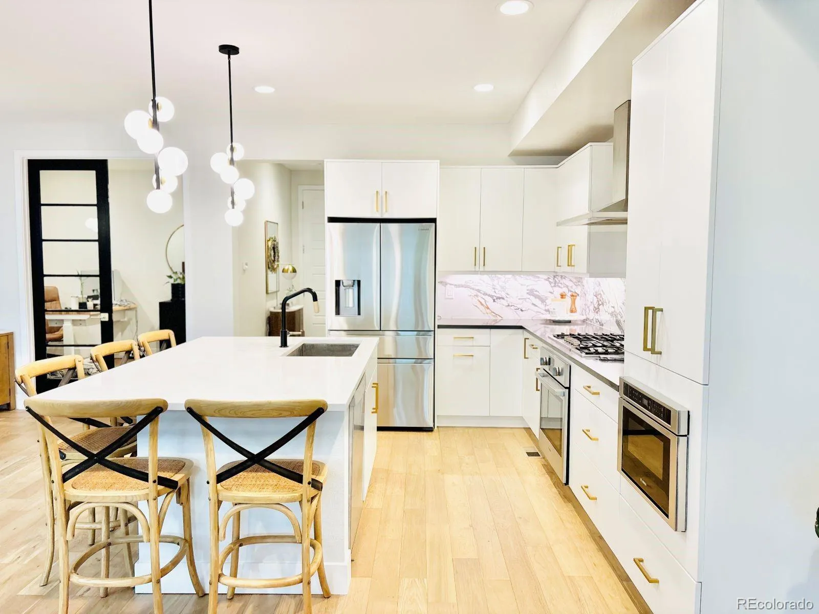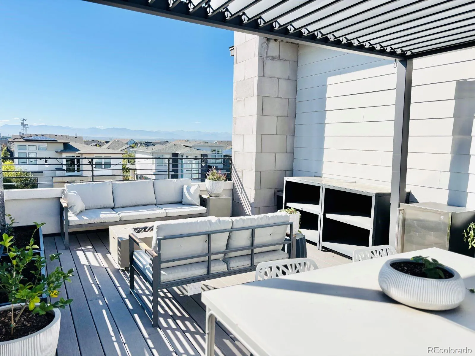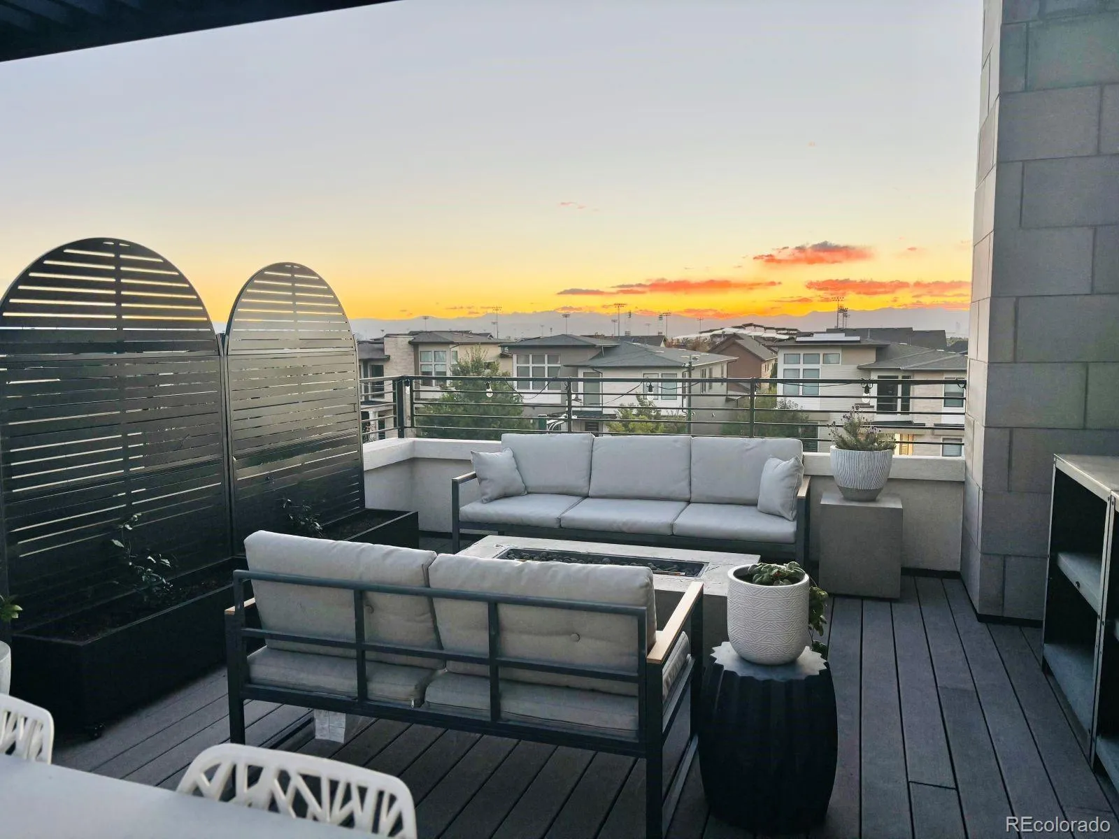 This stunning Infinity home has incredible mountain and city rooftop patio views. It features four different outdoor areas to enjoy the beautiful Colorado weather. Inside you will find vaulted ceilings with an open floor plan. The kitchen has quartz countertops, white modern cabinetry and high-end Bosch appliances. A spacious office and powder bath round out the main floor. The back patio is a perfect place to dine el fresco and grill up your favorite meals. The second floor features an amazing primary suite with its own private patio. This private oasis features two closets, an oversized shower, sauna and separate vanities with plenty of cabinetry for storage. There are two spacious additional bedrooms that each have their own private bath. The second floor also features a large laundry room and an exercise or tv nook. The rooftop features a pergola, privacy screens and amazing views. It’s a great place to host fourth of July fireworks. You will have a front seat to the best show in Denver. The basement is unfinished waiting for you to put your finishing touches on it. This home’s interior has brand new white oak floors and carpet on the stairs. It has also has been freshly painted white throughout. The home’s exterior features xeriscaping with planters for a maintenance free lifestyle.