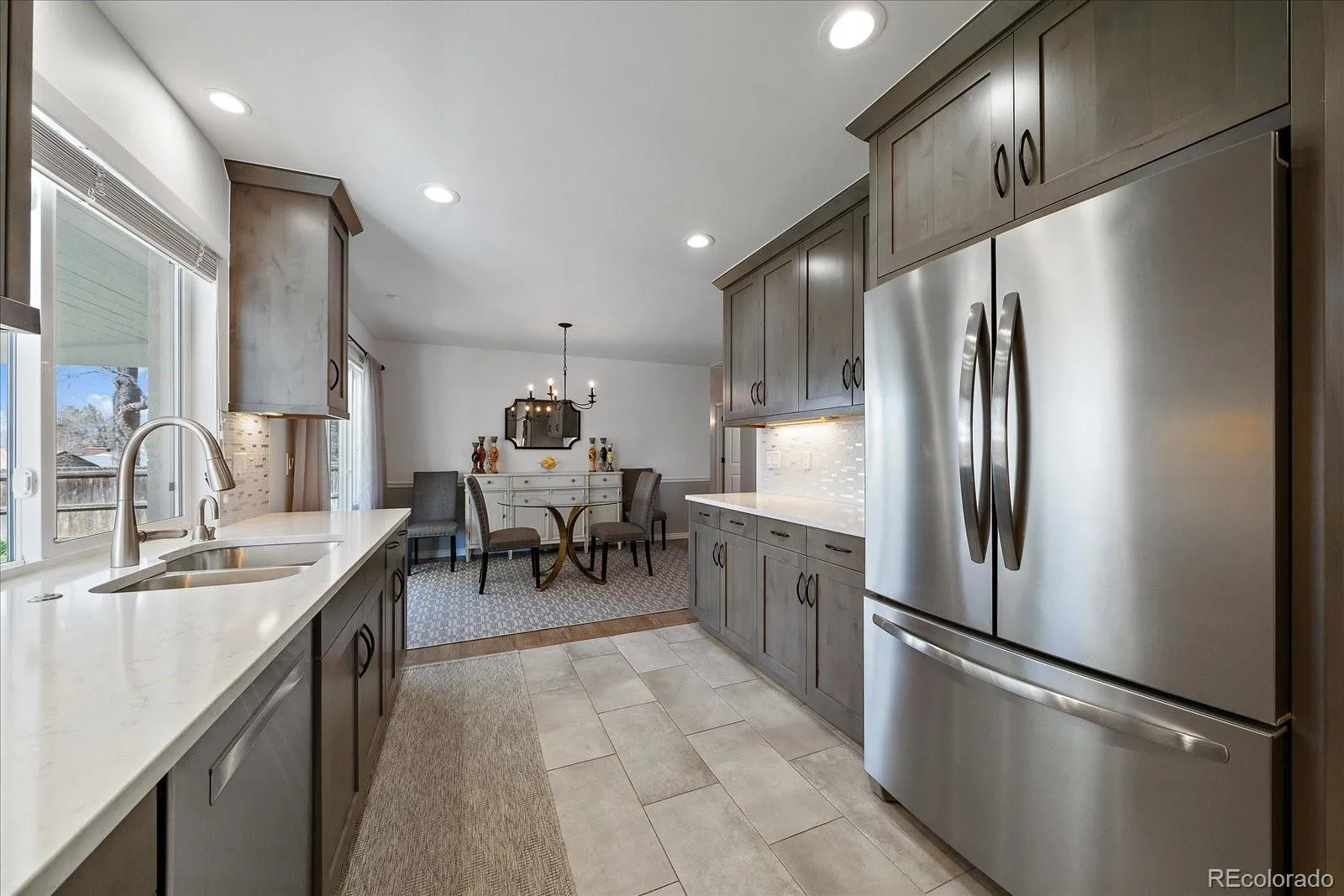 fixtures adorn the dining area which flows seamlessly from the bright front room to the kitchen and backyard. The primary