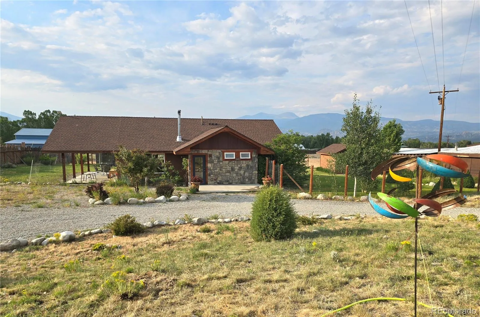 Outbuildings! Solar panels! Domestic well! No HOA! 1.3 Acres! Fabulous rural living for your hobbies or work! Beautiful 1-level living! Enjoy the home’s open concept kitchen, living & dining area with tile floors. The kitchen has stainless steel & wood counters. Radiant in-floor heat & a wood stove keep you toasty in the winter. The 2 large bedrooms have sliding doors with access to the yard. The primary bedroom has a large walk-in closet. Off the kitchen is a covered 12’x28′ concrete patio with sun shades. Patio can also be used as a carport. Generous 3-foot overhangs keep the house cool in the summer. Two half baths share a large dual-head, shower room. Baths and shower have stone floors. Amazing views! Ceiling fans in bedrooms & great room. Accent lighting abounds! Solid wood doors & trim throughout. Stone & stucco exterior. Full soffit lighting on every side. Check out the 1496 sq ft heated garage! Fully finished & insulated with a large office, full bathroom and 9 foot ceilings. Large attic storage too. On the metal roof is a bank of 10,000-watt solar panels that power the entire property most of the year. 3 garage bays and room for a workbench. This property is watered by a domestic well, which allows for outside use. The Buena Sanitation District serves the home. There is EV charging and RV hookups available. Lots of storage with all the available sheds. One near the garage is insulated, finished & has electricity. The lower shed on the east side is insulated, finished & has attic storage; the glass garden shed is just plain fun! Wild flowers abound in the summer. Minutes from Buena Vista off a paved road! The Arkansas River Valley is known for its phenomenal recreational opportunities, including rafting, hiking, fishing, biking, golfing, dirt biking & more. Make this property your home base! Seller is a licensed Real Estate Broker in Colorado.
