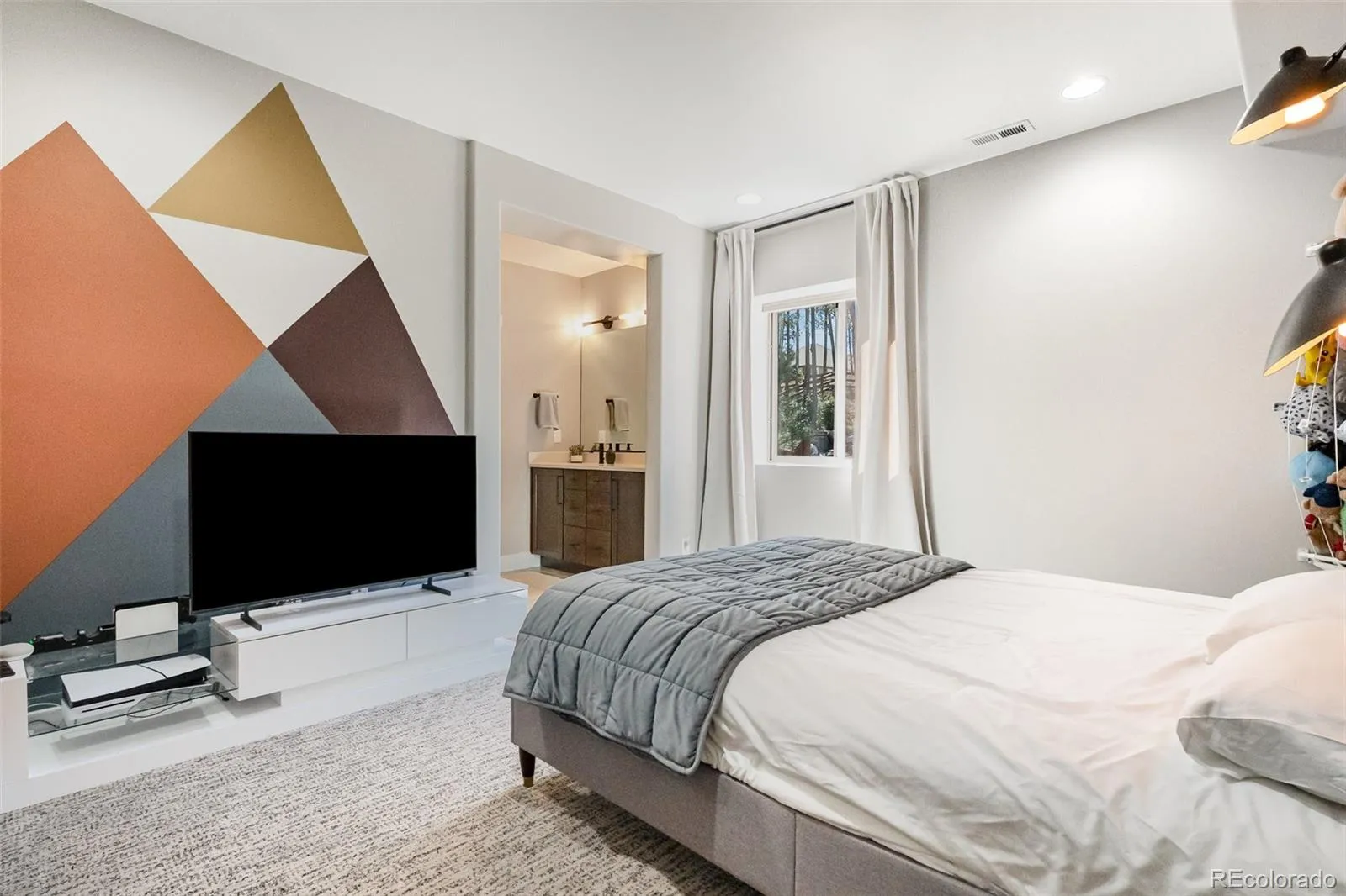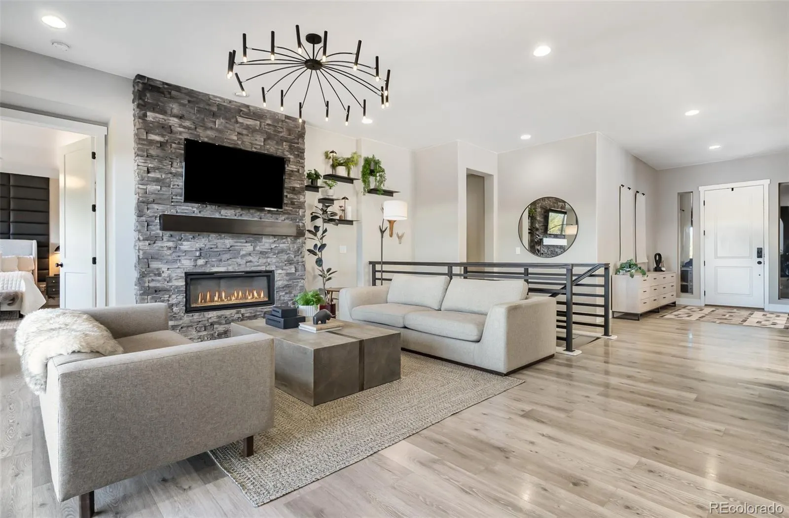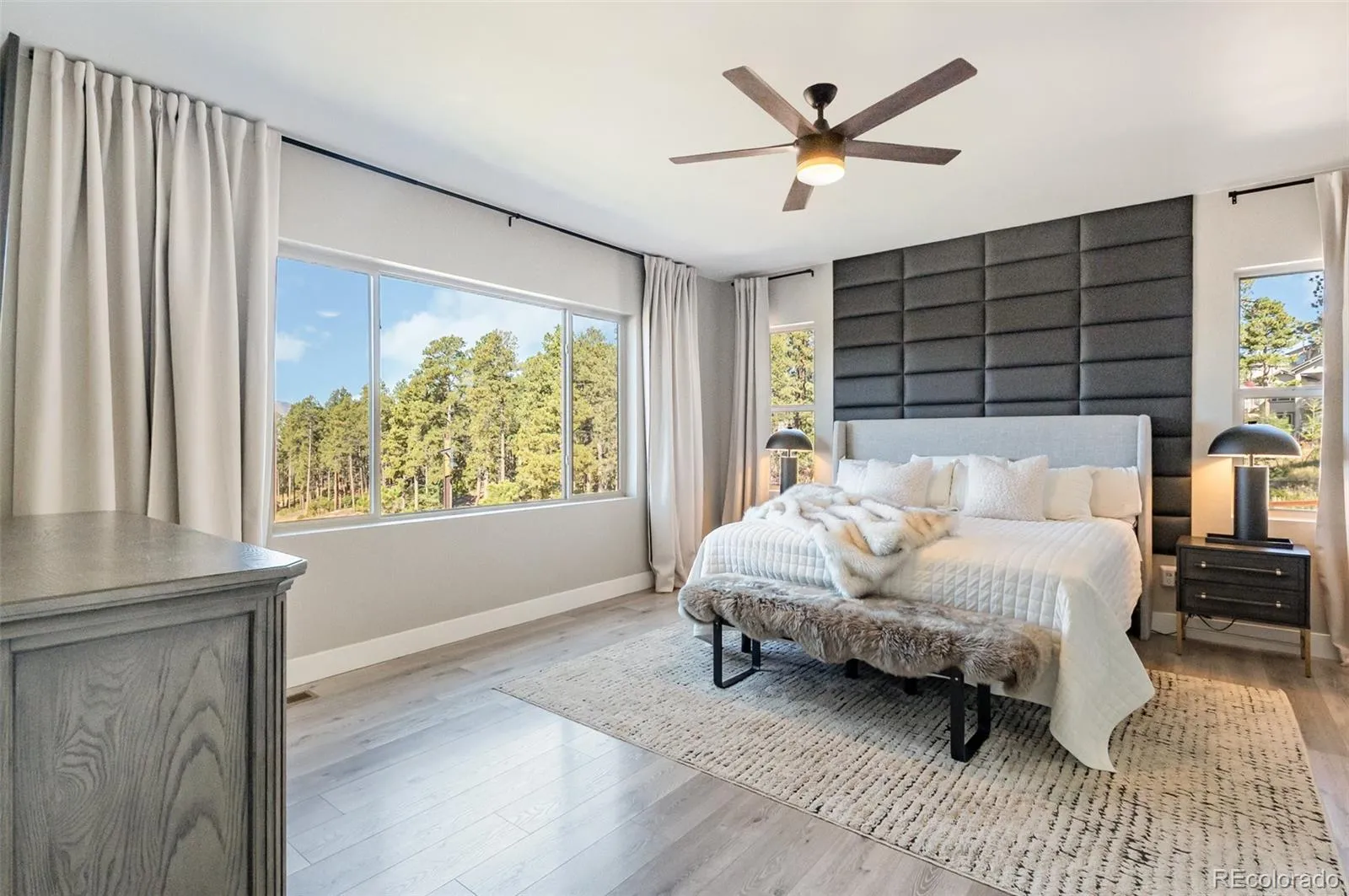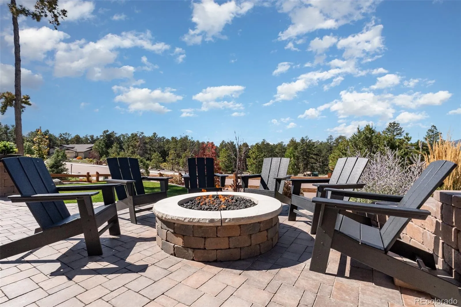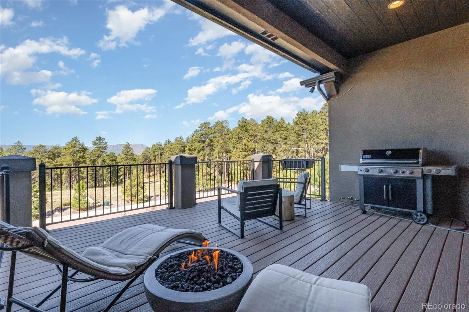 Welcome to one of the most coveted lots in the prestigious Sanctuary Pointe community—where luxury meets nature in breathtaking harmony. Perched above open space and scenic trails with unobstructed views of Pikes Peak, this expanded Classic Paradise model is a masterclass in refined Colorado living! Versatile layout with the master on the main floor and Junior suite in basement, ideal for guests or multi-generational living! Hand-troweled walls, tall baseboards, and chic black-accented finishes throughout. Custom glass slider doors in dining/study for flexible use. Modern railing, designer light fixtures, and gorgeous contemporary fireplace! The fantastic kitchen features cherry cabinetry, quartz countertops, pantry and KitchenAid appliances! Serene Master retreat with views of Pikes Peak and soothing waterfall sounds from neighboring water feature and walkout to large composite deck! Laundry room conveniently located on main! TV hookups in all bedrooms and walk-in closets for optimal organization. Basement features 9-foot ceilings and walk-out access to covered patio with hot tub! Wet bar with full-size fridge, dishwasher space, and custom barn door shelving. Custom carpet, organized closet space, and radon mitigation system. Custom landscaping with split rail fencing, extended patio and fire pit! Trail system directly across the street and regular snow plowing for convenience Located along the AFA flight path—enjoy thrilling Thunderbird flyovers! Vibrant neighborhood with food trucks, soccer games, hiking, clubs, and seasonal picnics. Close proximity to Fox Run trails and natural beauty This home is a rare blend of style, serenity, and sophistication—offering privacy, versatility, and modern luxury in one of Colorado’s most desirable enclaves. Whether you’re hosting under the stars or enjoying quiet mornings with mountain views, this Sanctuary Pointe gem is truly a dream come true and waiting for you!