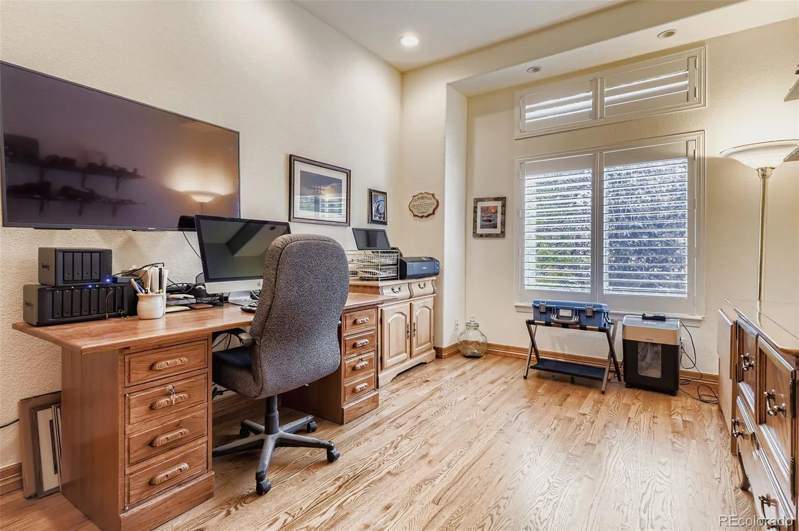 Extraordinary 2,800 square-foot ranch, situated on a large lot in Soaring Eagle Estates. What sets this well-built ranch apart is the 3 beds/3 baths on the main level – not easy to find in a ranch home. Additionally, you’ll find a private office and formal living/dining rooms. Extra-wide hallways, hardwoods and newer plantation shutters throughout. Open staircase to the walkout basement. Large kitchen with generous eating space, slab granite, newer stainless appliances (refrigerator, gas cooktop, double ovens, trash compactor and dishwasher). Pantry, cabinetry with slide-outs. Steps away from the expanded composite deck with outdoor kitchen and retractable awning – gas grill, griddle, pizza oven and 2-burner stove, granite counters, etc. Large family room with new linear gas fireplace. Primary suite with five-piece bath, jet-action tub, tile floors/counters, walk-in closet with custom built-ins, and private access to the deck. Two large secondary bedrooms. Full bath with dual sinks and walk-in shower. Main floor laundry with utility sink, cabinets, built-in ironing board. Washer/dryer included (less than 2 years old). Plenty of storage closets on the main. Full, partially finished, walkout basement with 9-foot ceilings. Currently the home to a game area, second family room, indoor driving range and a high-end, sophisticated workshop, equipped with piping for vacuum system, added lighting, utility sink and more. Second electrical panel in the basement. (Bar area behind the driving range). Access to covered patio and outdoor seating areas. Energy-efficient tankless water heater (1-year old). Dual furnace & AC units. Bluetooth-controlled sprinklers front and back. Drip irrigation system on the deck for your container pots. Private yard with mature trees/landscaping. Oversized, sideload garage (23+ feet deep), drywalled with overhead storage, smart garage doors and epoxy floor coating. Great neighborhood. Convenient to services. A must see!