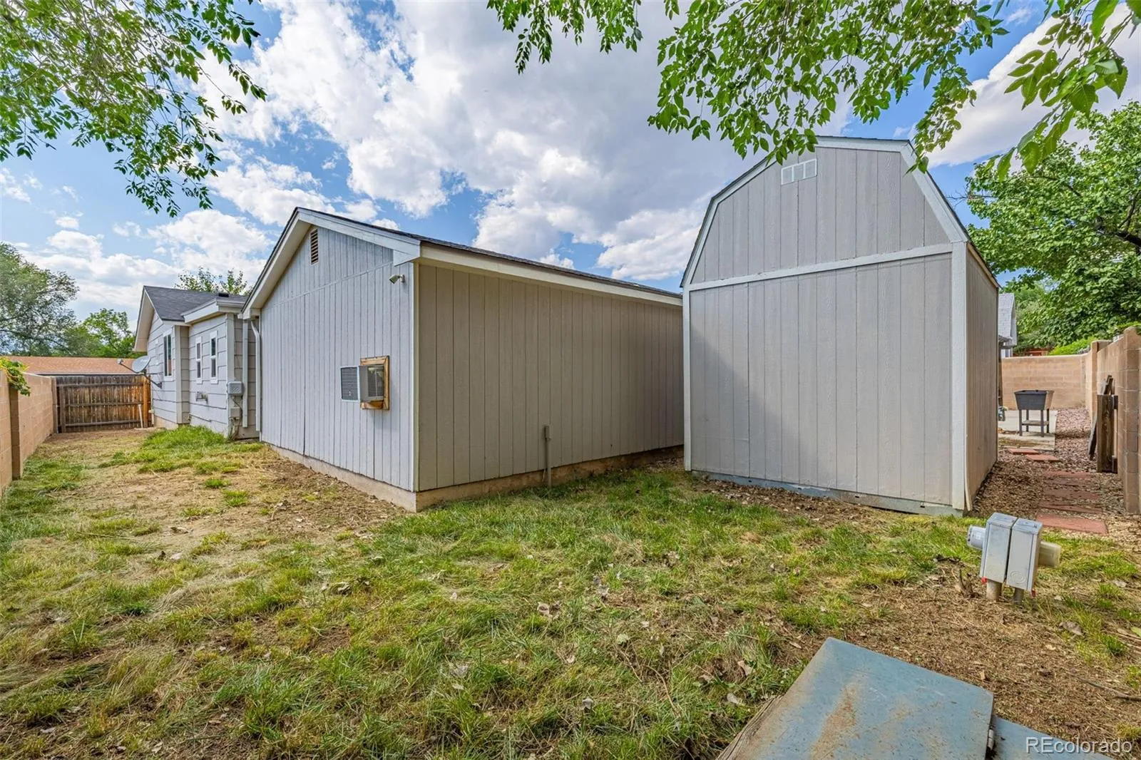 spaceship project, a storage shed for your “collectibles,” and a paved backyard with a grass patch and pergola for