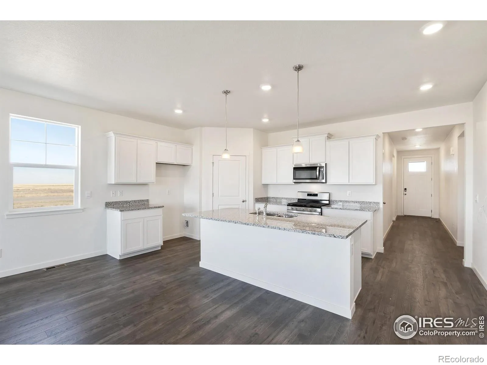 This ranch style home features 3 bedrooms, 2 baths, 2.5 car garage and 1,635 sq. ft. of living space and front and backyard landscaping. As you walk through the hallway you will pass the stairs and enter the open concept living area. The kitchen provides plenty of space with a walk-in pantry, stainless steel appliances, granite countertops, white cabinets, and an expansive kitchen island. Flowing from the kitchen is the dining nook, with access to the backyard and the great room. The walk-in closets, walk-in laundry room, linen closets, and spacious hallways can be found on the main level as well. The primary bedroom includes an attached bathroom, with a double vanity sink, countertops, a toilet, and an expansive walk-in closet with added storage space. Added features of this new home include a laminate flooring, 9′ ceilings, tankless water heater as well as energy-efficient appliance, and Smart Home technology. Residents in this new home community have access to the 7,000 sq.ft. Venture community amenity center that provides an award-winning fitness facility complete with state-of-the-art equipment, flex rooms, plenty of gathering space, a catering kitchen and even two pools! ***Estimated Delivery Date: November. Photos are representative and not of actual property***