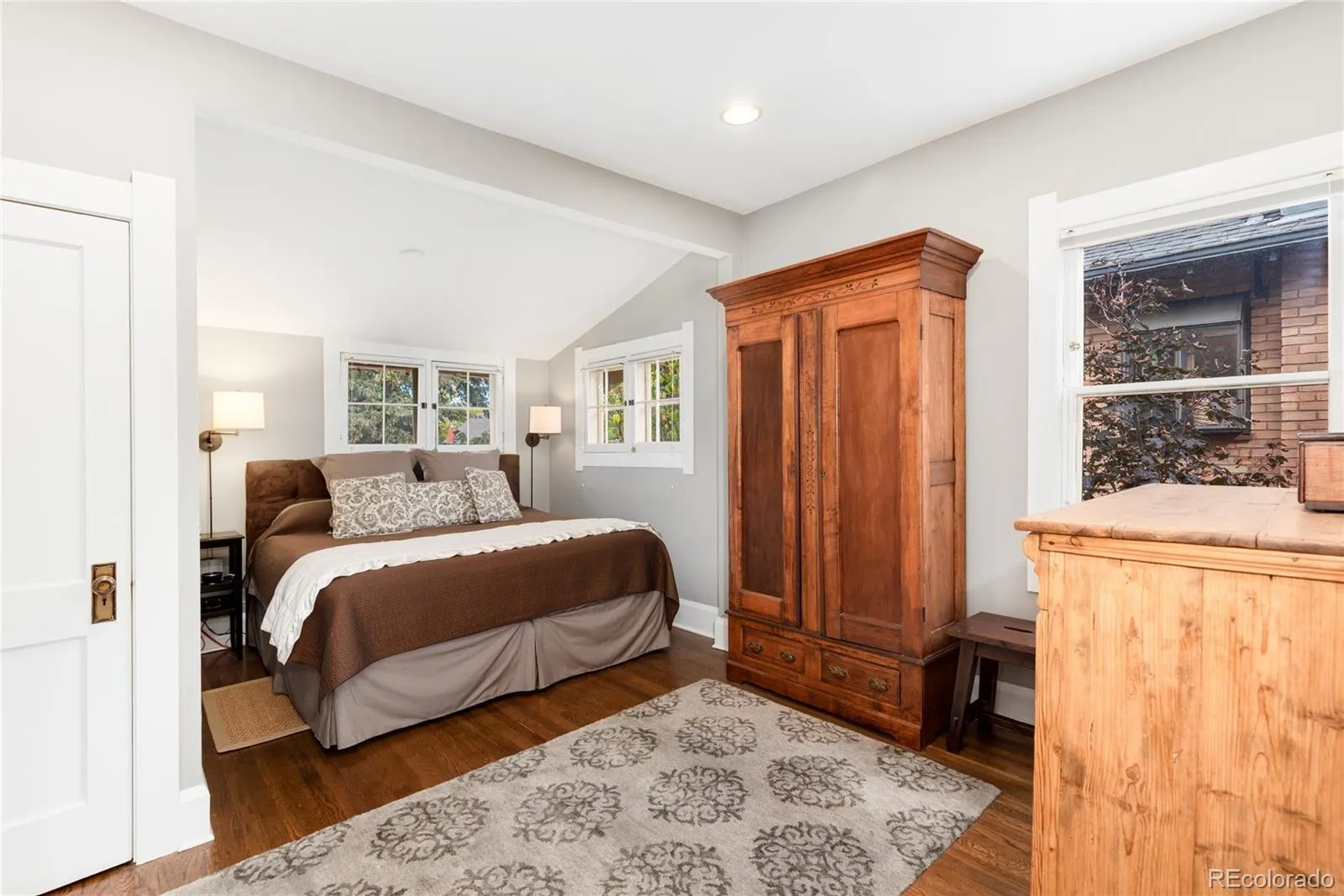 Refinished hardwood floors, fresh paint, and new carpet flow seamlessly throughout, while the home’s original six-pane, leaded glass windows are beautifully balanced, preserving the home’s historic charm. The generous Primary bedroom with walk-in closet, uncommon for the area, is large enough for a king-sized bed and sitting area.