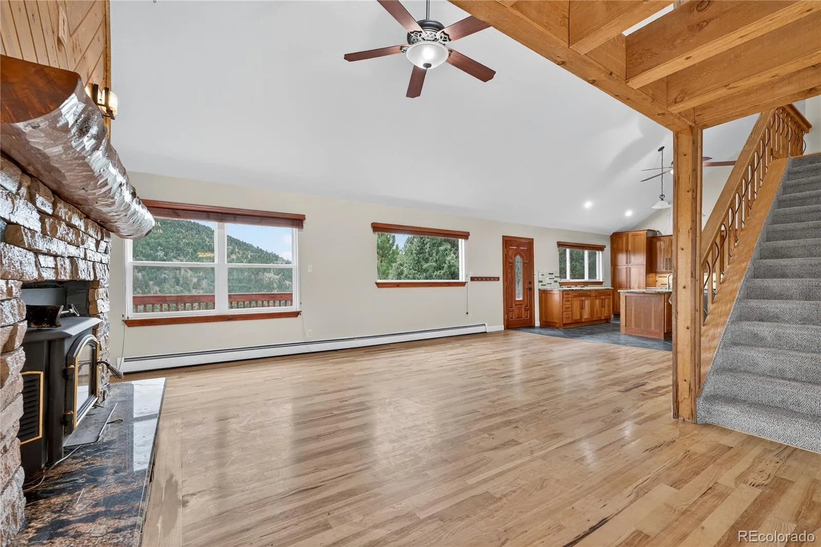 Step inside to discover an inviting open floor plan filled with mountain charm and elegance. Soaring vaulted ceilings, wood beams, and a cozy wood-burning stove with stone surround create a warm and welcoming atmosphere. The spacious living room flows seamlessly into the large dining area, complete with a sliding glass door and deck access for easy indoor-outdoor entertaining. The chef’s kitchen impresses with granite countertops, stainless steel appliances, abundant cabinetry, and vaulted ceilings that enhance the light and airy feel.